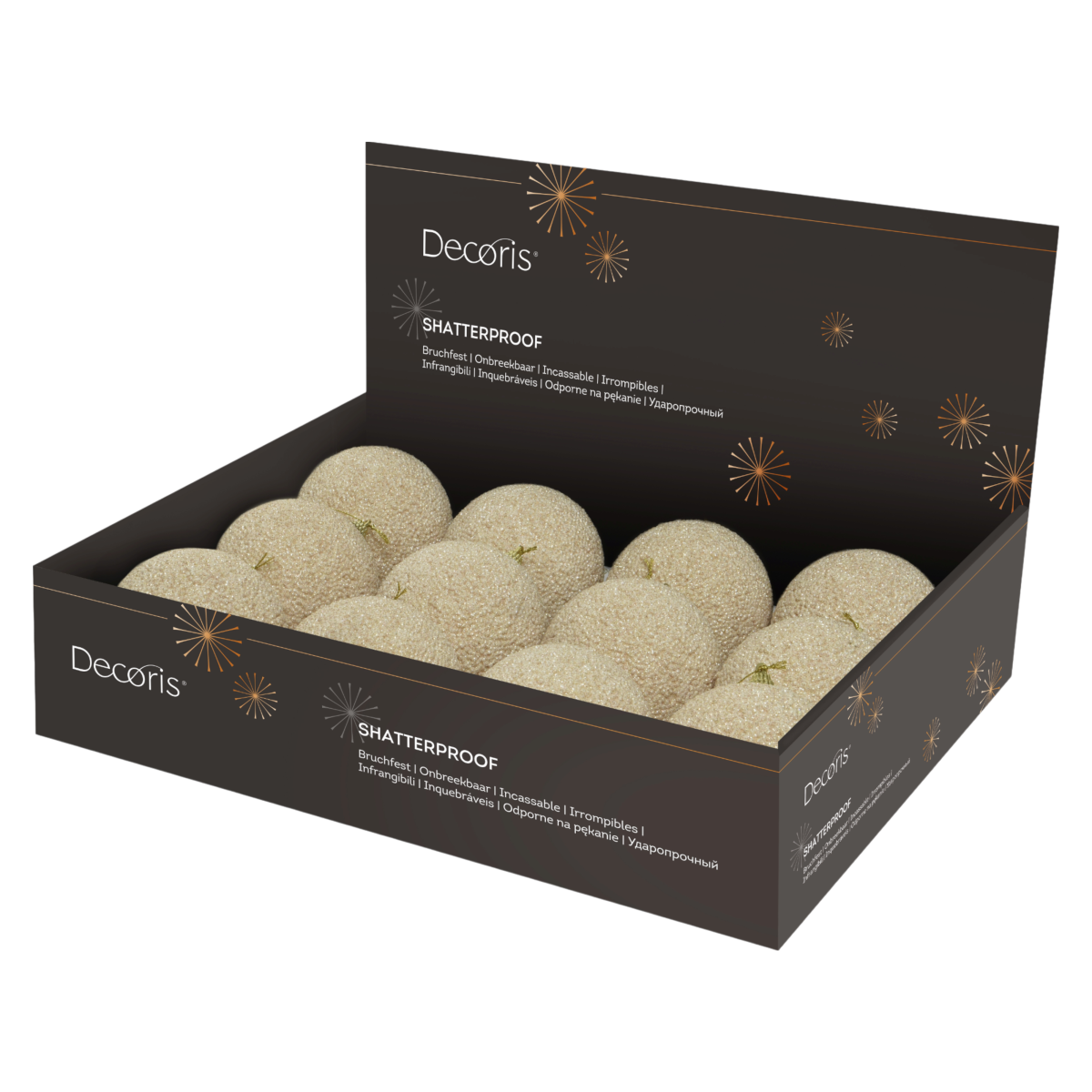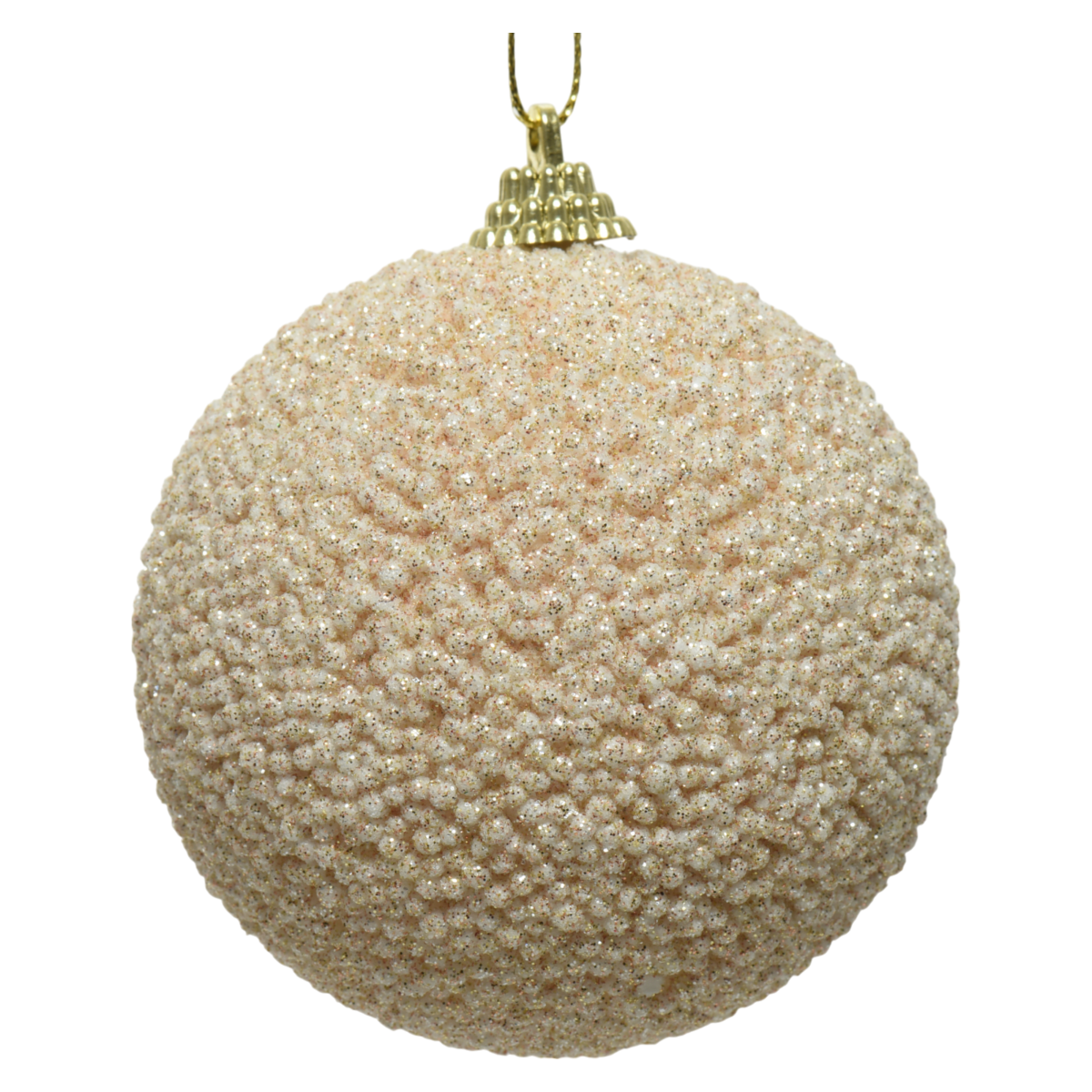 Ez a 10 cm átmérőjű karácsonyi gömb igazgyöngy színű, texturált felületével és arany színű glitter díszítéssel különleges megjelenést kölcsönöz a fának. A műanyag alapnak köszönhetően könnyű és kevésbé törékeny, így ideális választás családoknak is.