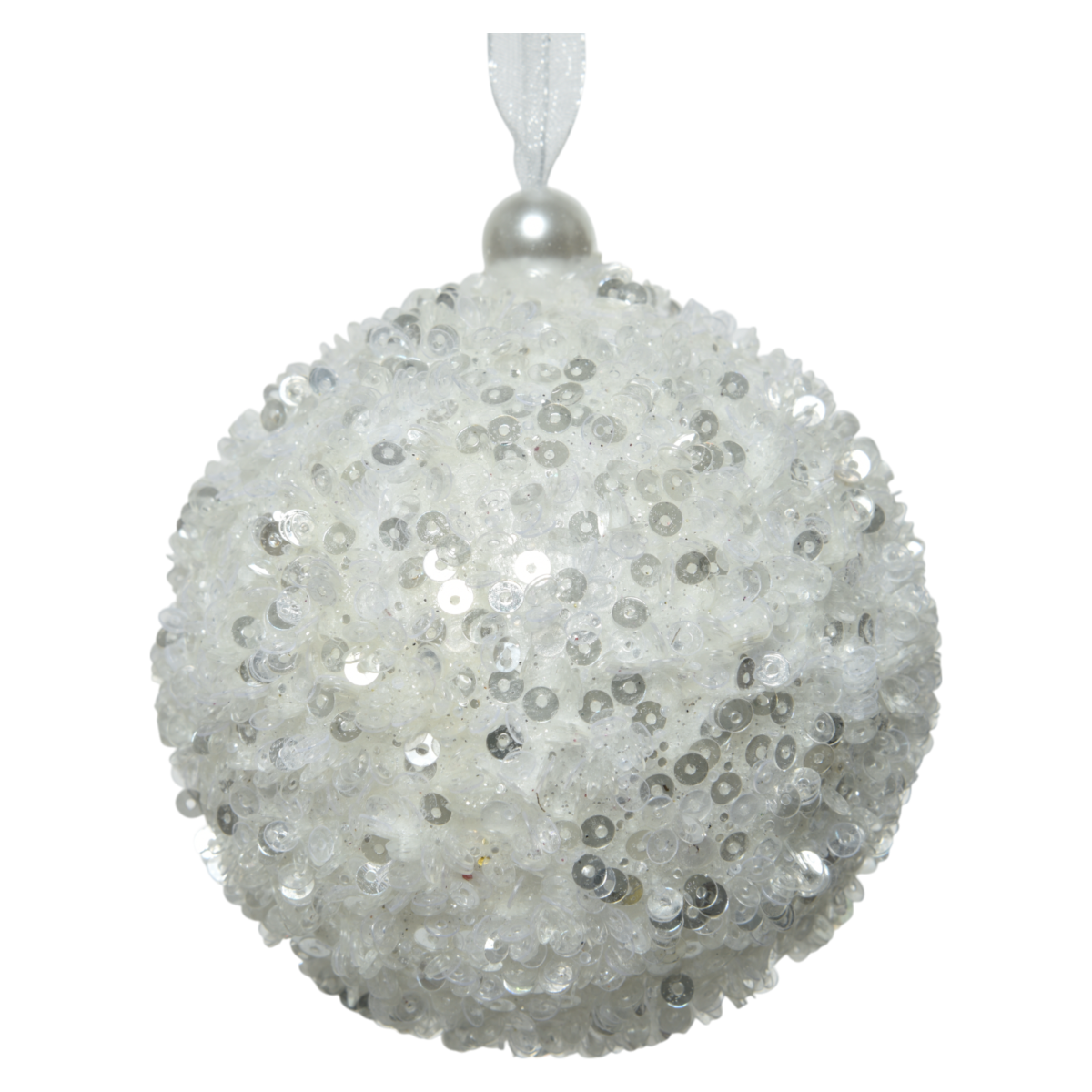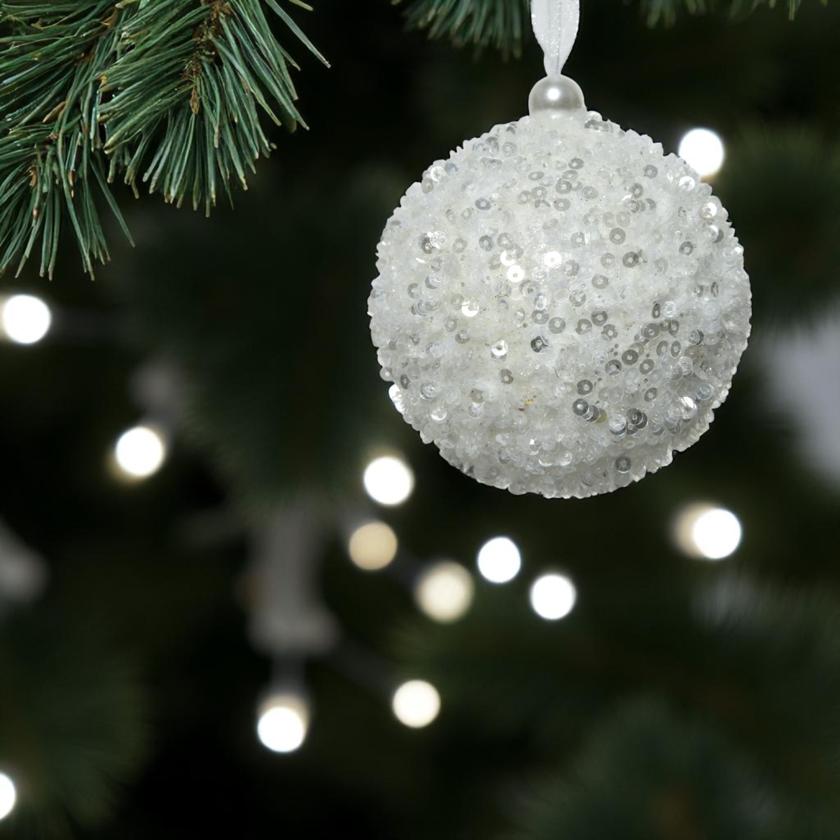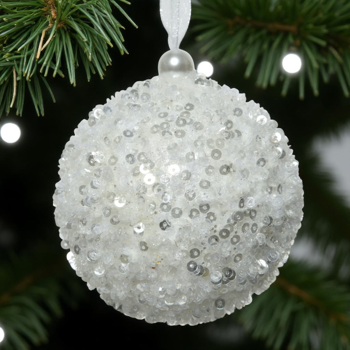 Ez a 8 cm átmérőjű, fehér flitterekkel díszített műanyag karácsonyfadísz látványos és elegáns választás, ha szeretnéd ünnepi dekorációdhoz egy kis csillogást is hozzáadni. A könnyű, egy üveg díszhez képest, törésbiztosabb kivitelnek köszönhetően biztonságos a használata, különösen kisgyermekes otthonokban is.