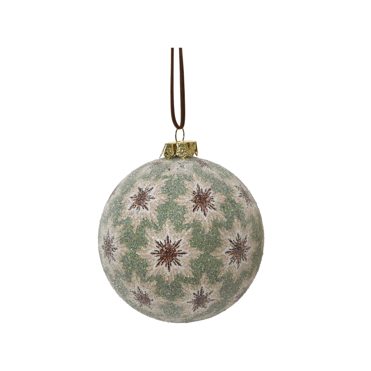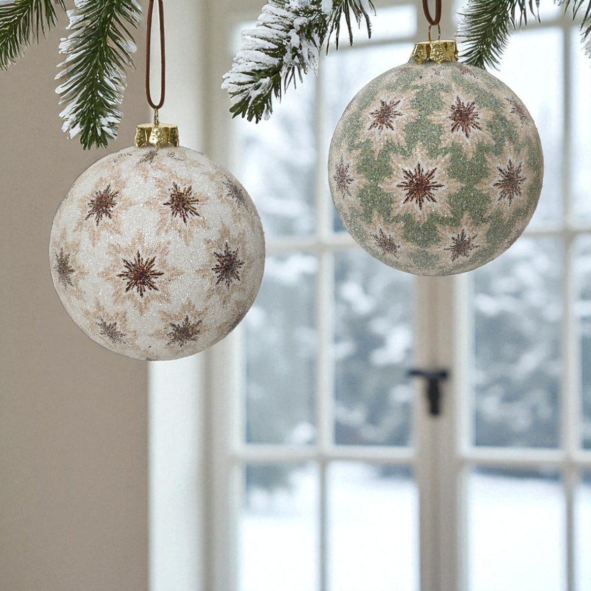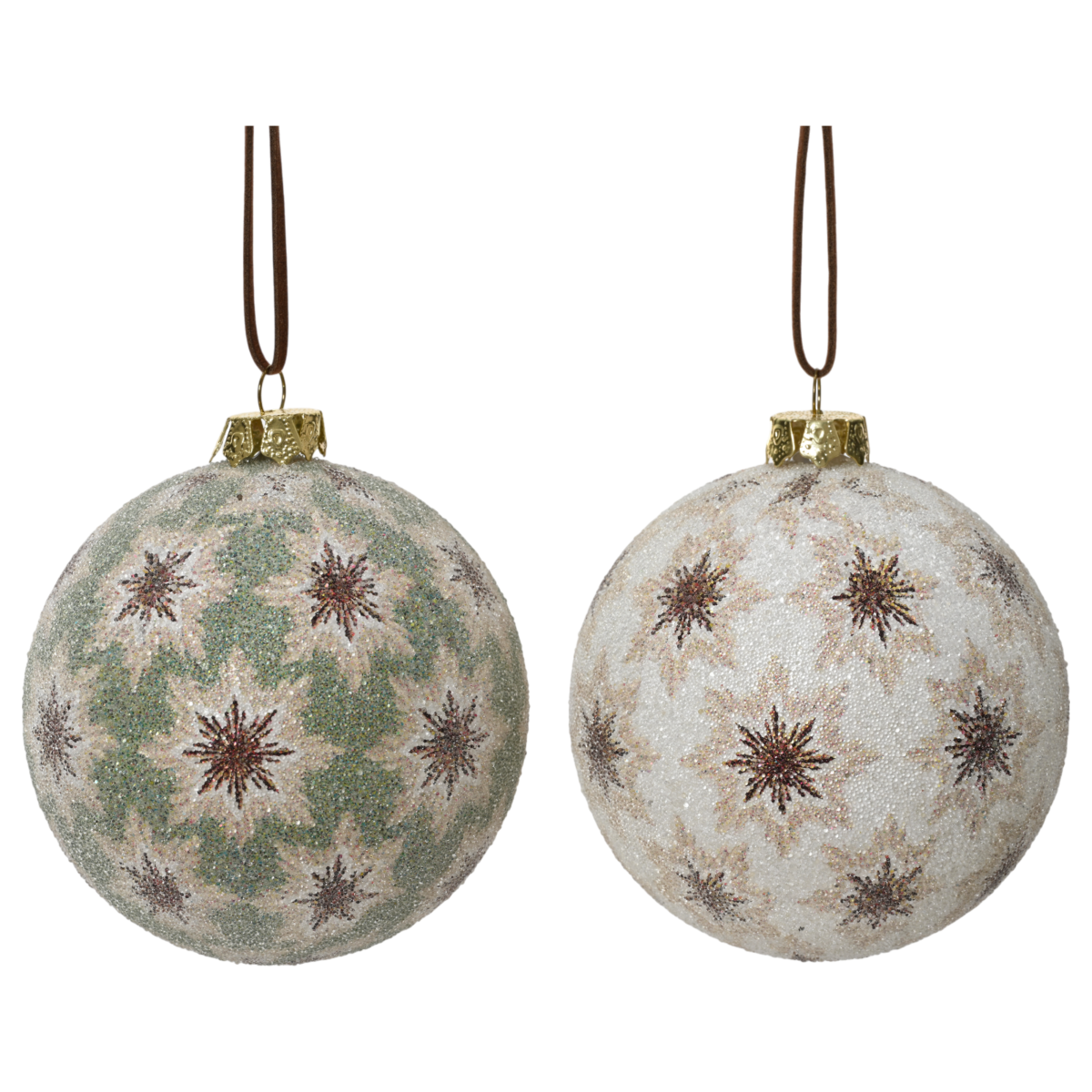 Ez a 9,3 cm átmérőjű, csillagmintás műanyag karácsonyfadísz két különböző színváltozatban érhető el: zöldes-ezüst és törtfehér alapon csillogó aranybarna mintával. A részletgazdag, gyöngyös hatású felület különleges textúrát kölcsönöz a gömböknek, így elegáns és klasszikus megjelenést biztosítanak a karácsonyfán. Könnyű műanyag alapanyaguknak köszönhetően biztonságosan használhatók akár kisgyermekes otthonokban is.