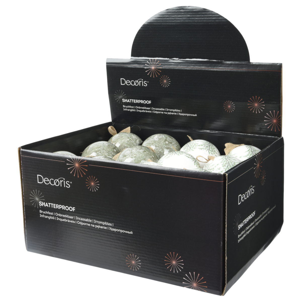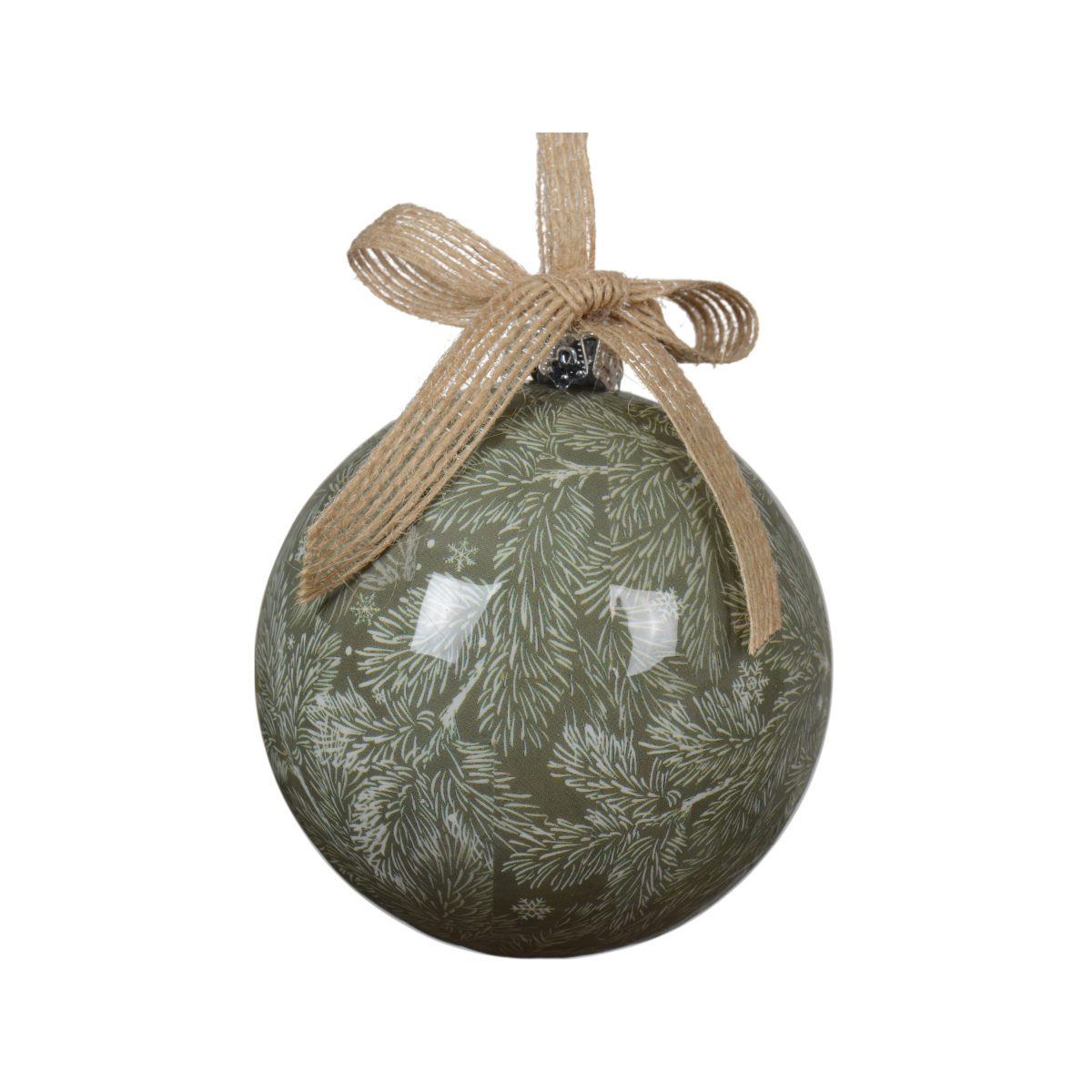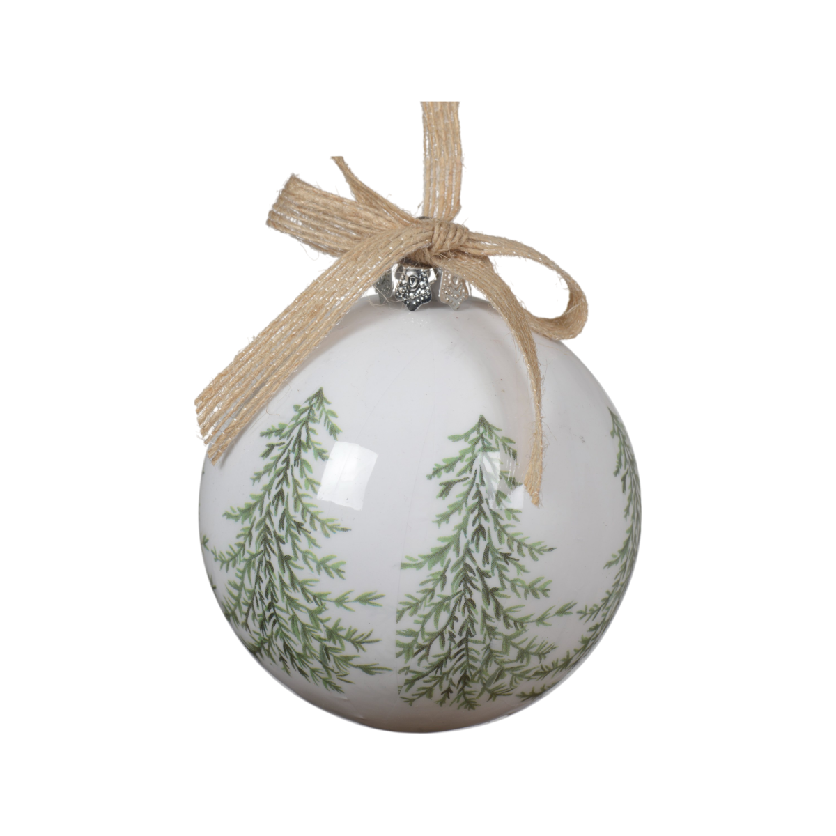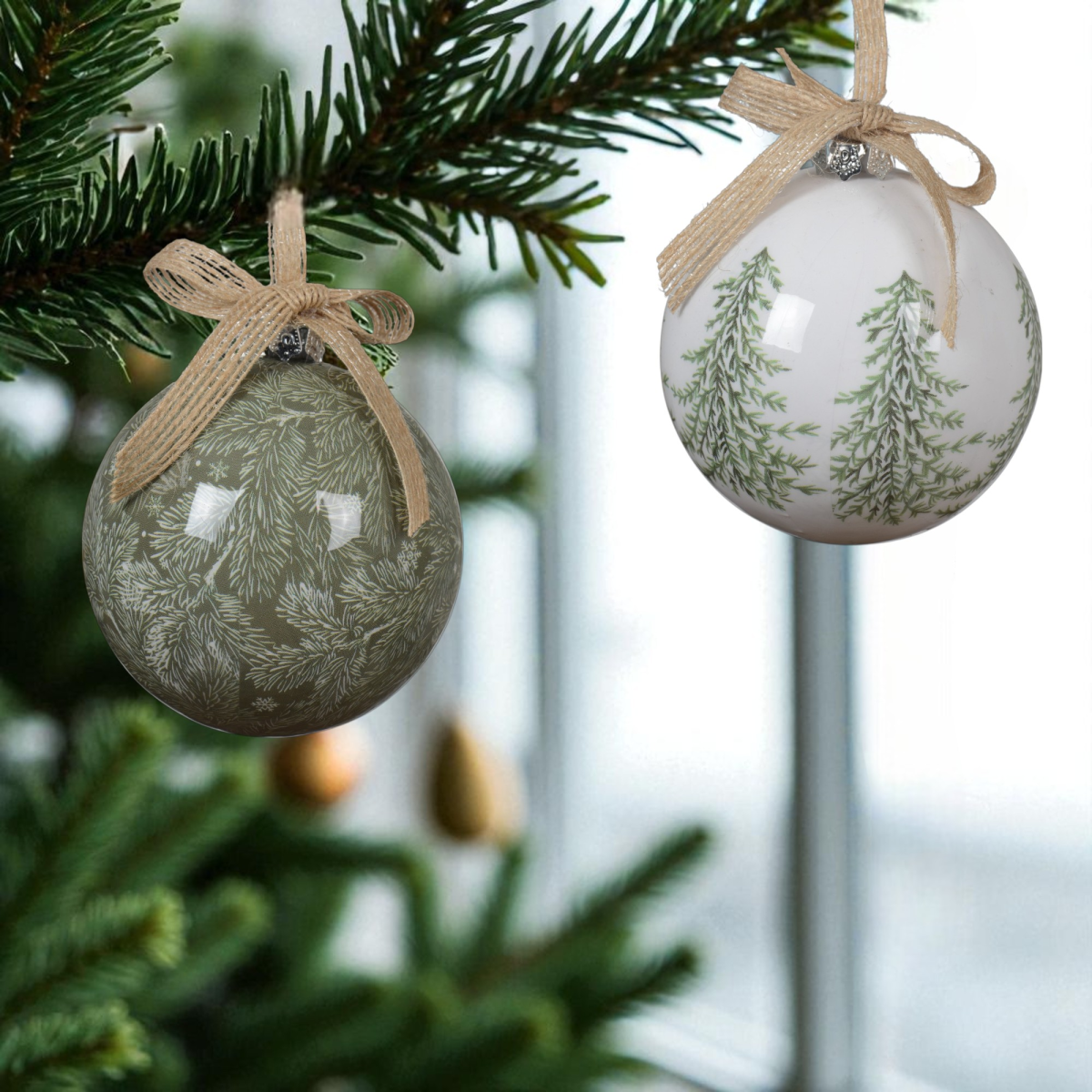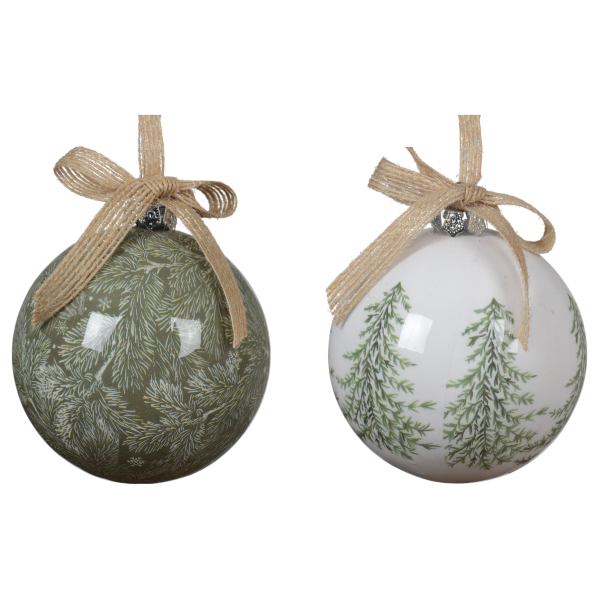 Ez a 9,3 cm-es átmérőjű karácsonyfadísz kétféle mintázattal érhető el: az egyik zöld alapon fehér fenyőágakat, a másik fehér alapon zöld fenyőfákat ábrázol. A természetközeli motívumokat jutamasni egészíti ki, amely rusztikus karaktert ad a díszeknek. A könnyű műanyag kivitelnek köszönhetően praktikus választás családoknak és kreatív dekorációs projektekhez is.