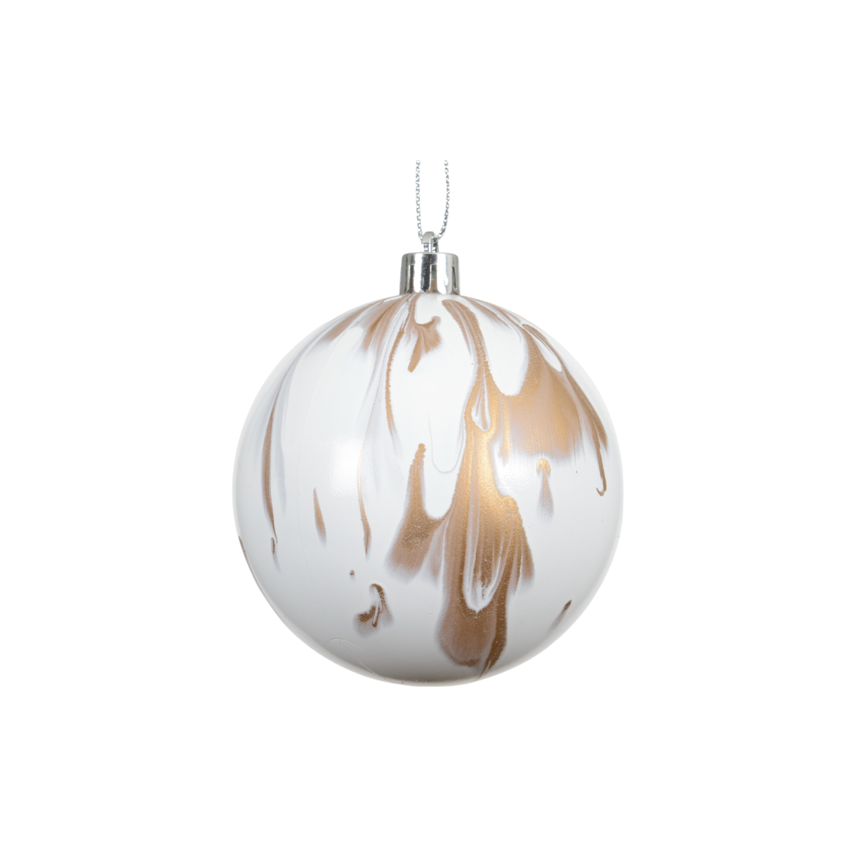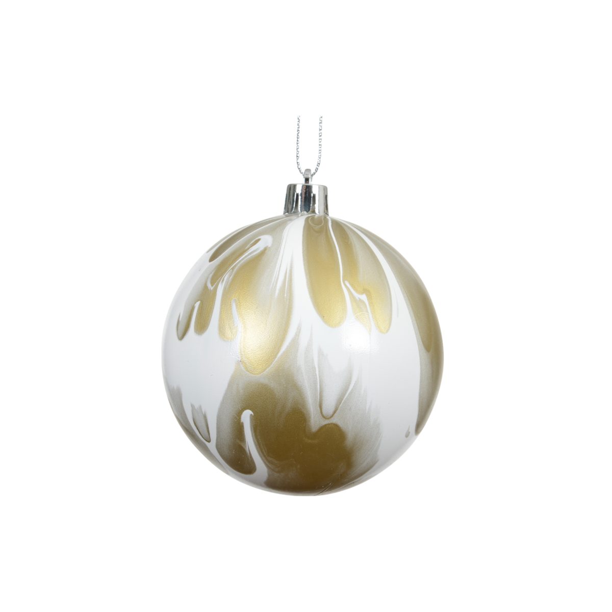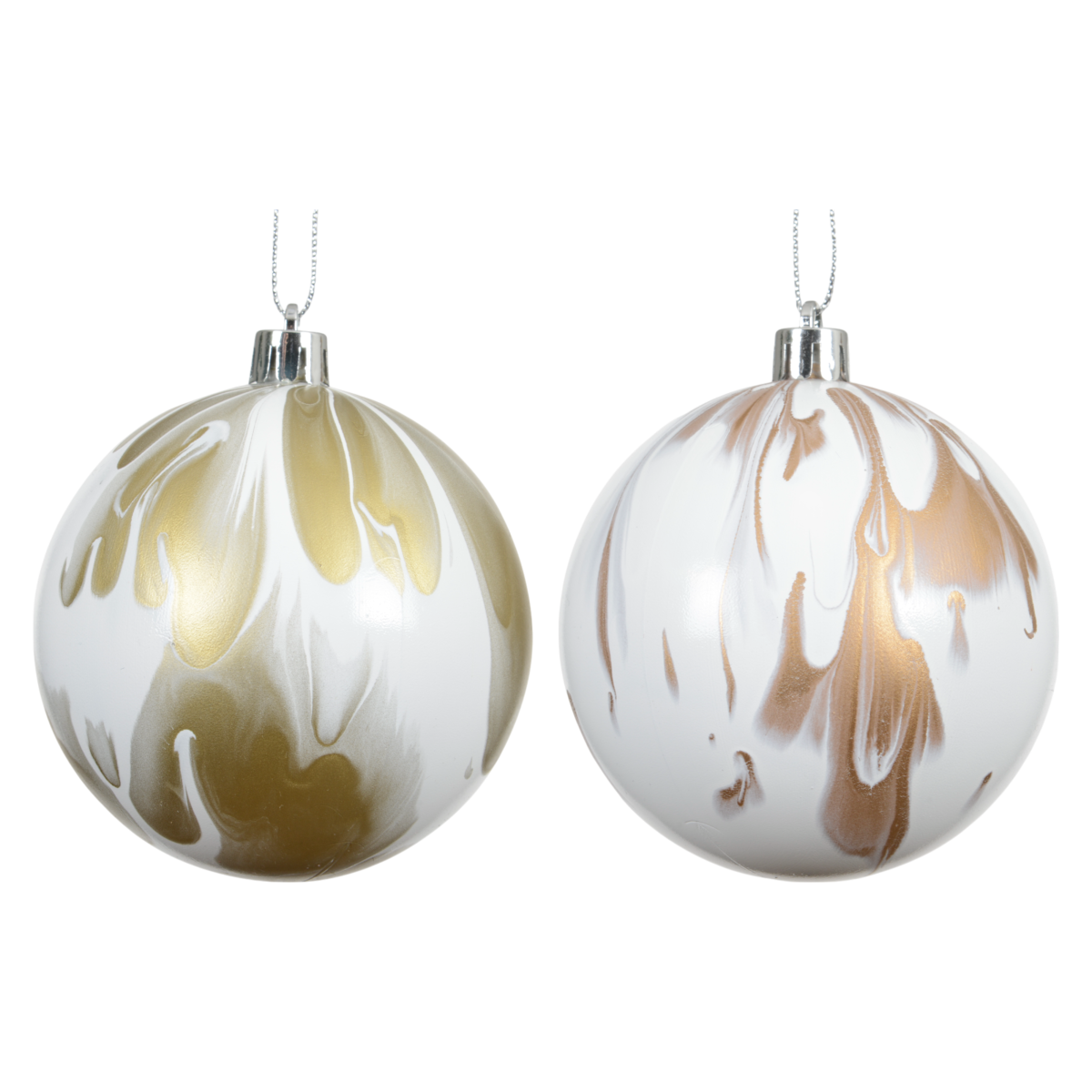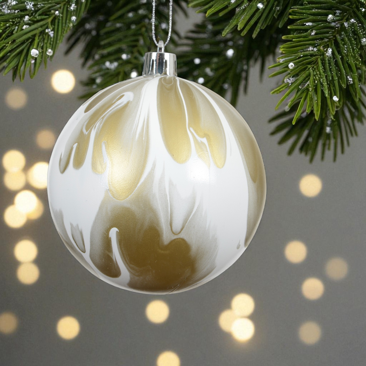 Keresel egy igazán különleges, mégis harmonikus karácsonyfadíszt? Ez a 8 cm átmérőjű, műanyag gömb szett kétféle mintával érkezik: az egyik fehér alapon arany, a másik brandy árnyalatú alapon fehér márványos festéssel készült. A finoman elmosódó mintázat modern és elegáns hatást kelt, így tökéletesen illik letisztult, természetes vagy akár glamour stílusú ünnepi dekorációhoz.