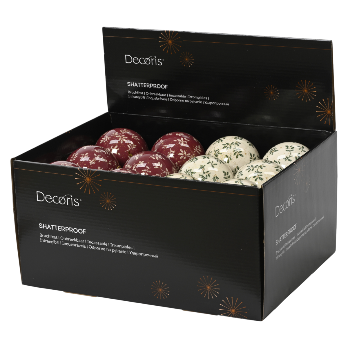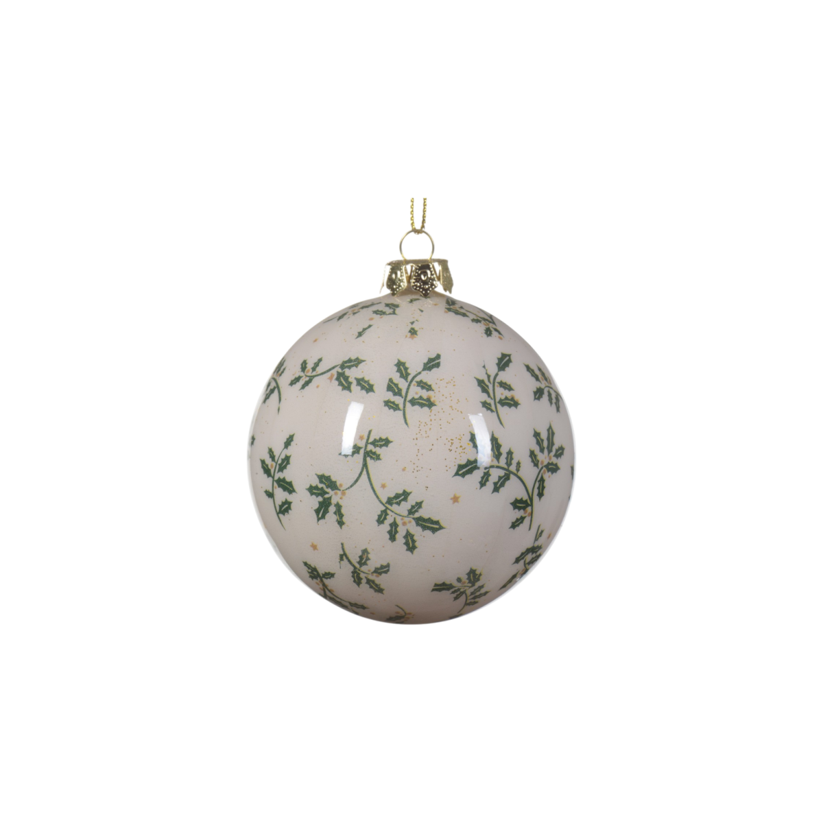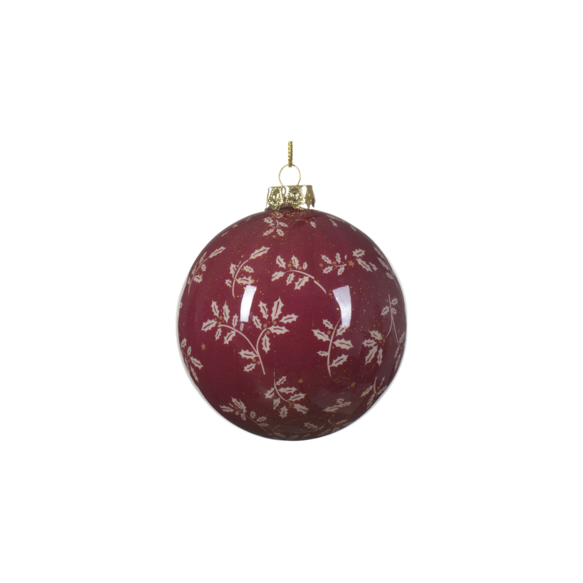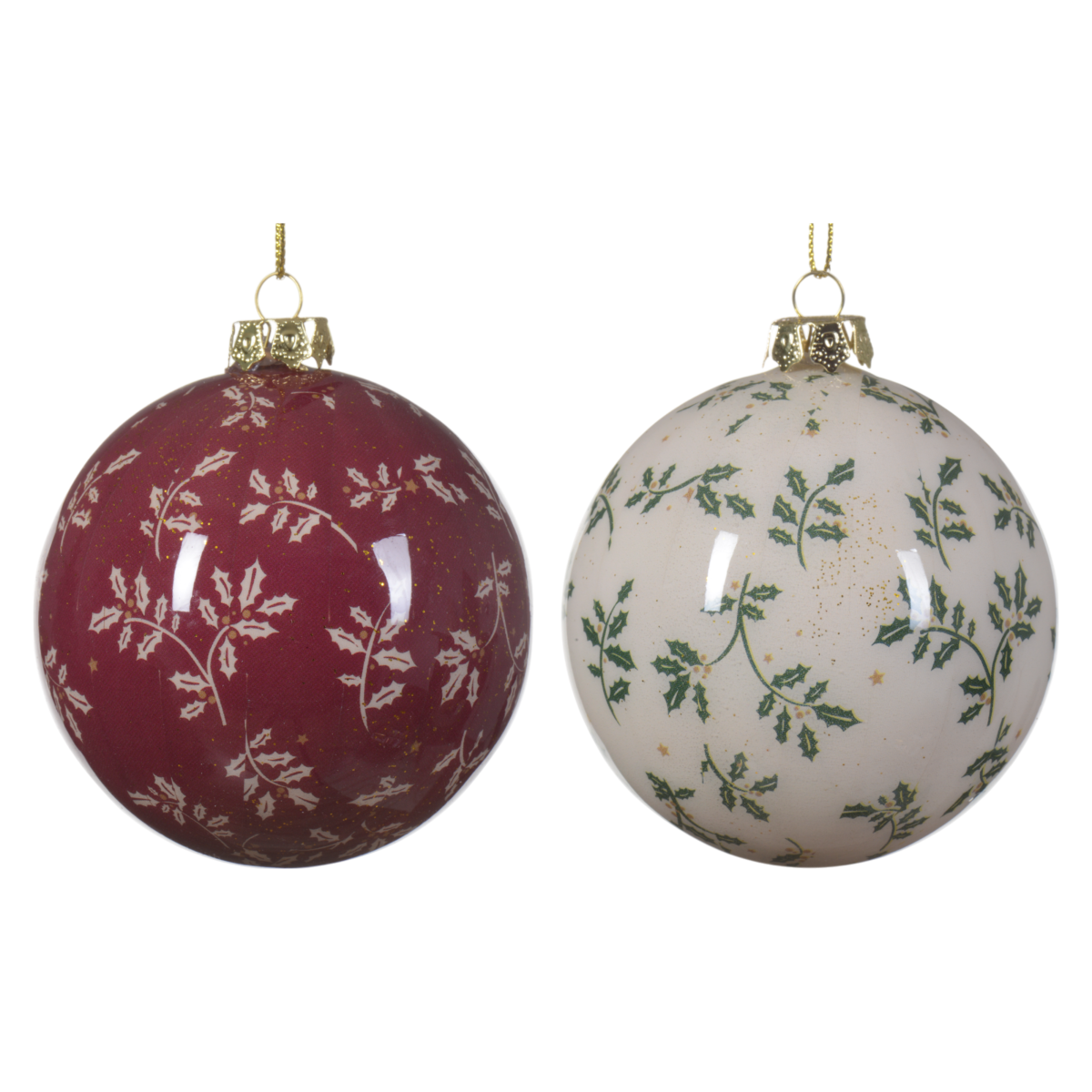 Egyedi mintázatú, 8 cm-es műanyag karácsonyfadísz, amely klasszikus levél- és csillagmotívumaival természetközeli hangulatot visz az ünnepi dekorációba. Két színváltozatban elérhető: mélybordó alapon fehér-sárga mintával, illetve krémfehér alapon zöld és arany csillagokkal.