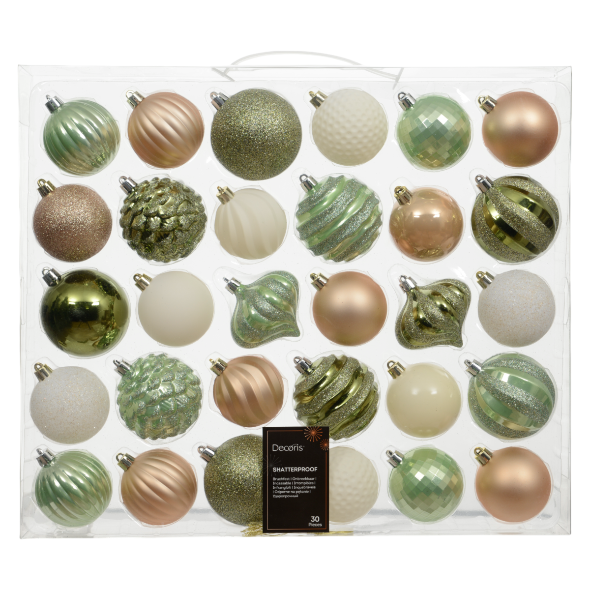 Hangold össze karácsonyfád színvilágát ezzel a 30 darabos, világos árnyalatú gömbdísz szettel! A különböző méretek és felületek – matt, fényes, glitteres és dombor mintás kivitelek – harmonikus, mégis izgalmas megjelenést adnak a fának. A szett többféle árnyalatot tartalmaz, köztük aranyat, pezsgőt, halványzöldet és fehéret.