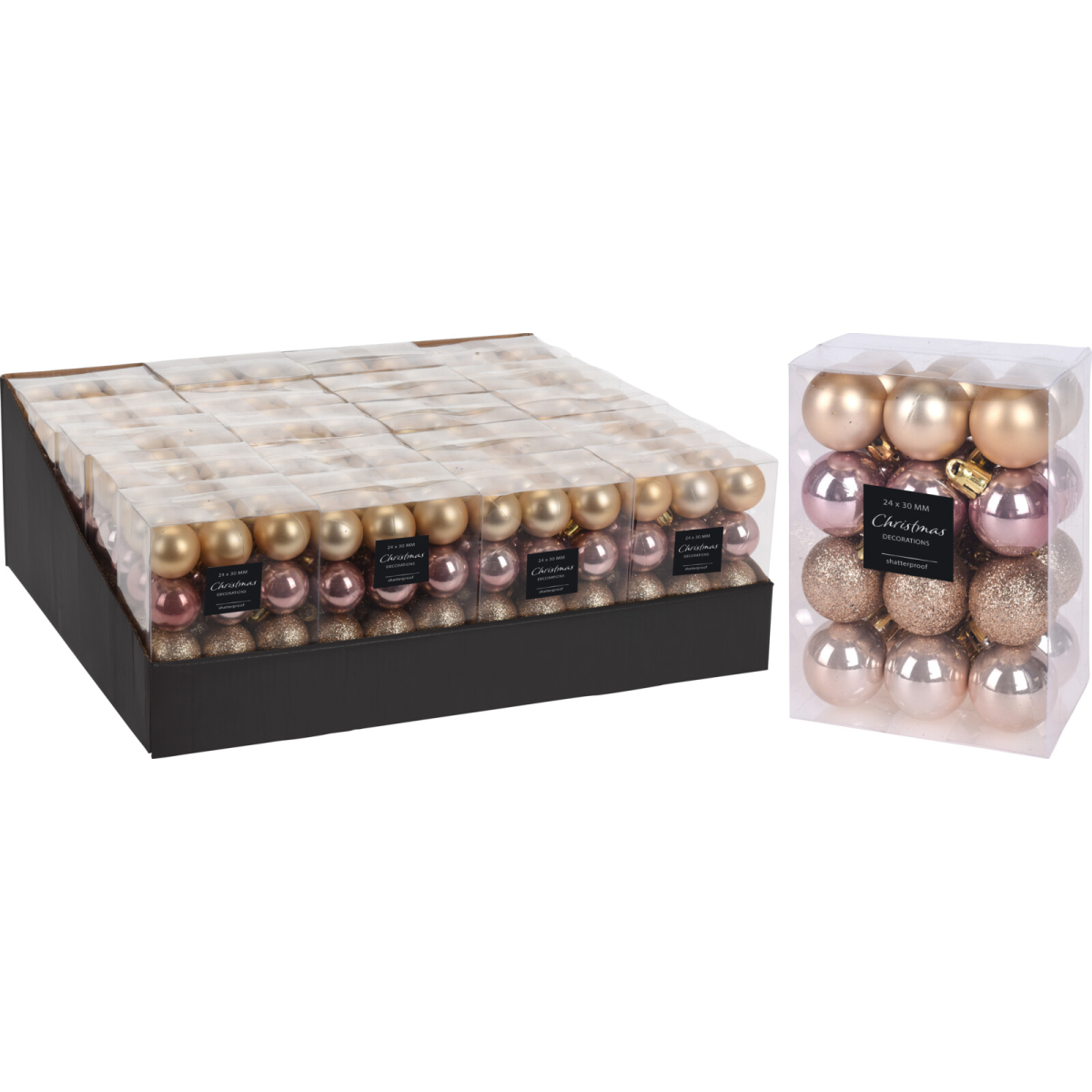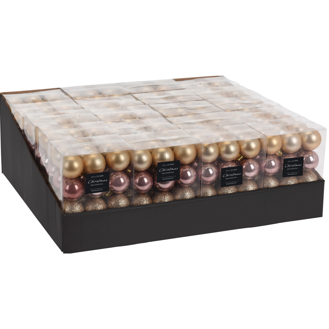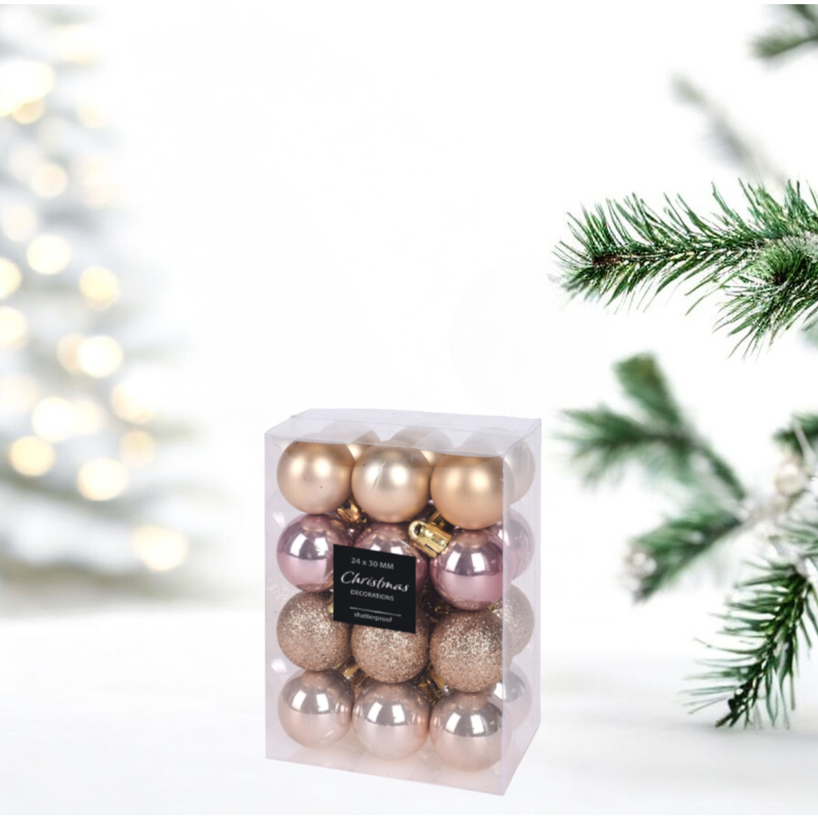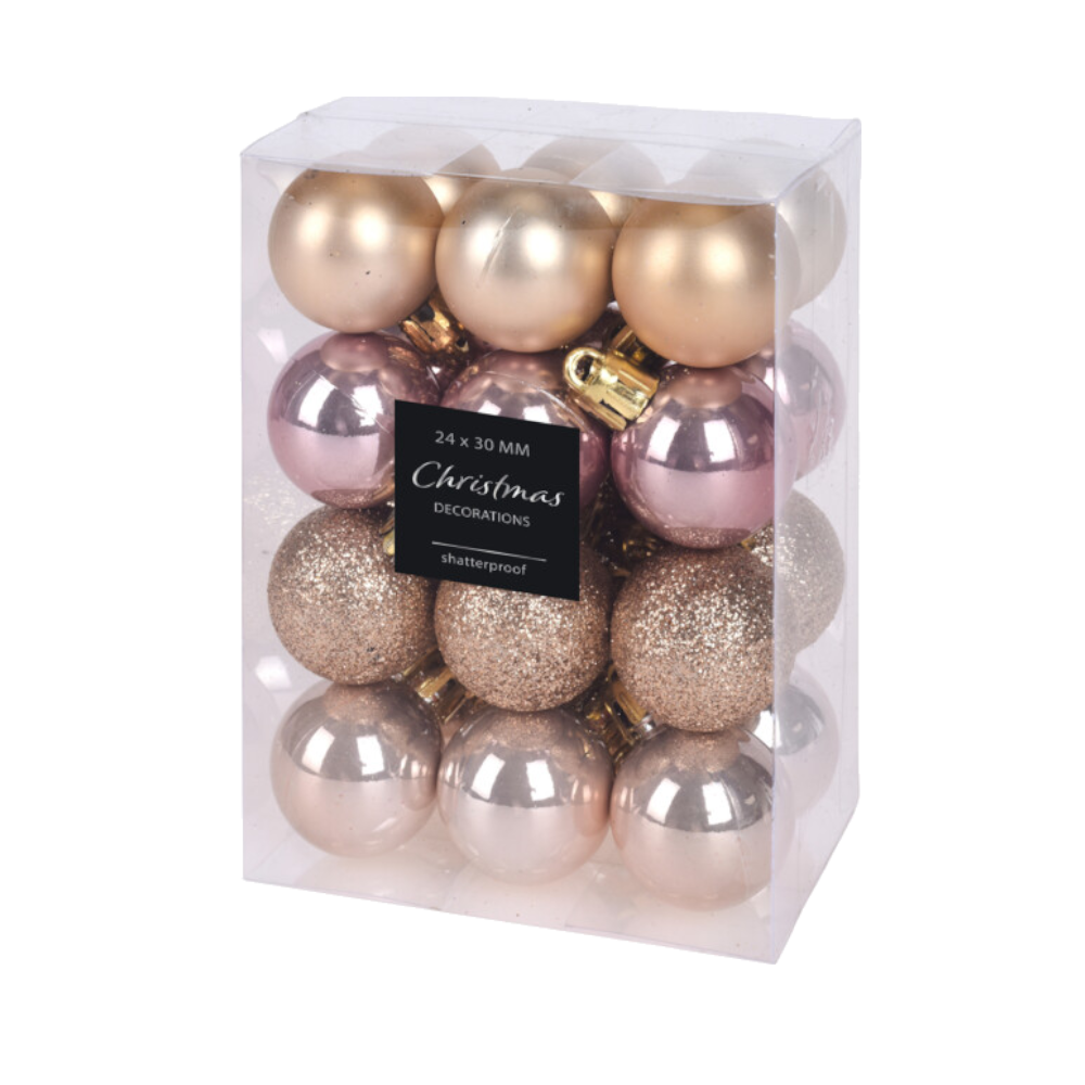 24 darabos műanyagból készült, 3 cm-es Pretty gömb szett Szett tartalma: 6 db matt, 6 db glitteres, 12 db gyöngyházas. Ezzel a gömb szettel biztosan meghittebbé varázsolhatjuk karácsonyfánkat avagy adott helyiséget.