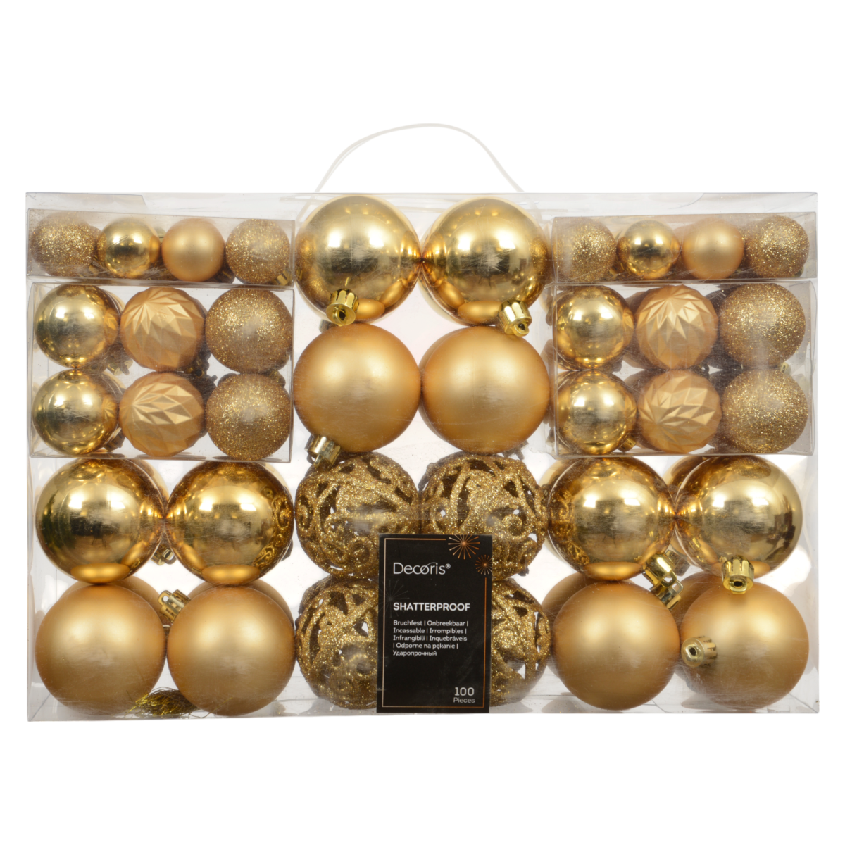 Ez az 100 darabos, arany színű karácsonyfadísz szett változatos felületi kialakításával és méreteivel igazán gazdag és elegáns ünnepi megjelenést biztosít a karácsonyfádnak. A készlet különféle méretű gömböket tartalmaz: fényes, matt, csillámos és áttört (hollow) kivitelben, így egyszerre klasszikus és játékos dekorációt alkothatsz velük.