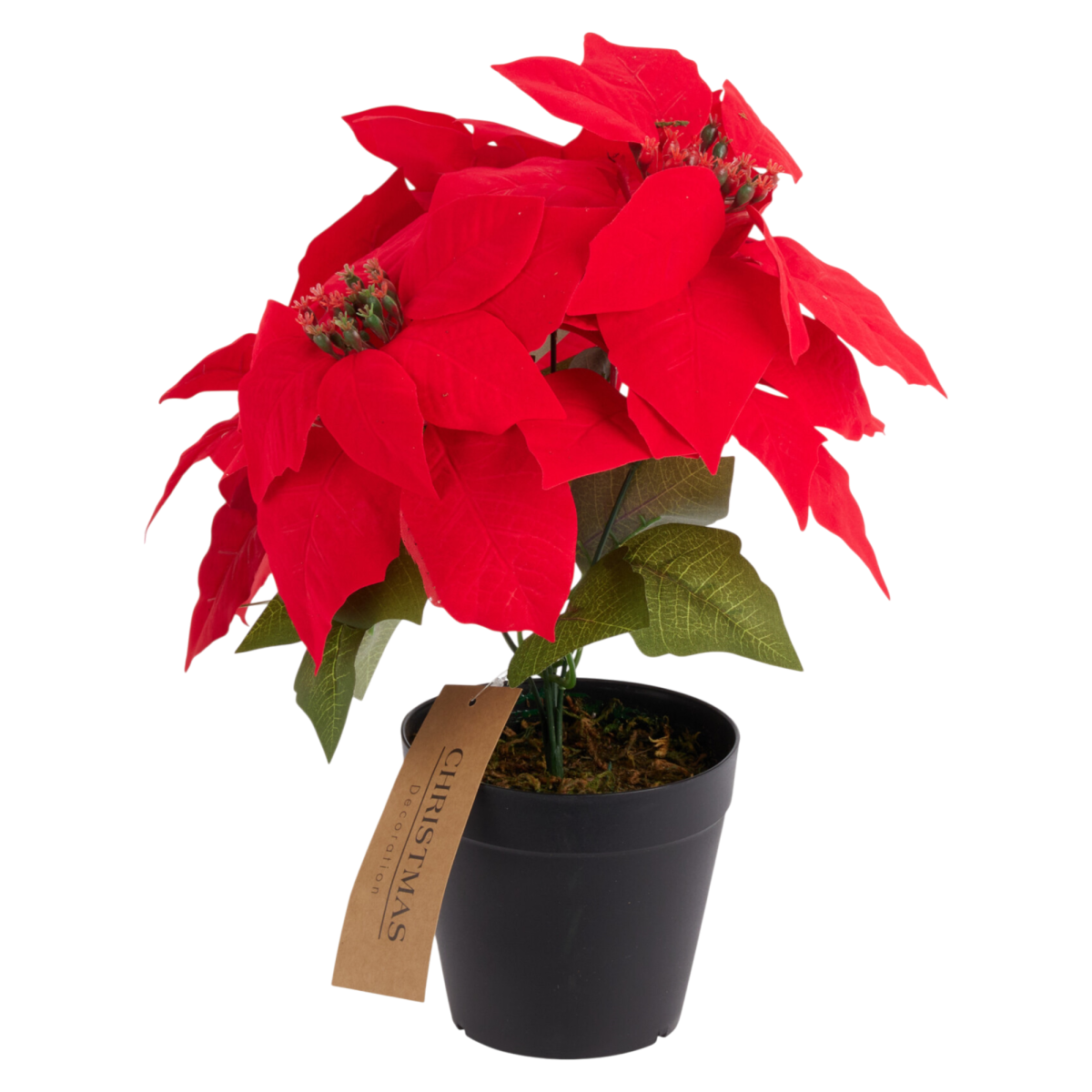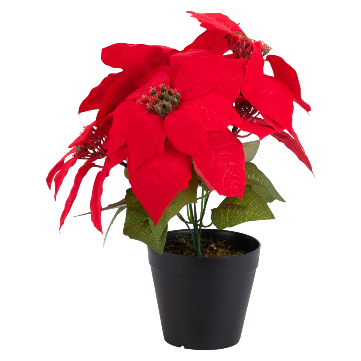 Ez a 30 cm magas műnövény mikulásvirág tökéletes választás az ünnepi dekorációhoz, ha látványos megoldást keresel. A virág szirmai és levelei részletgazdagon kidolgozottak. A műnövény anyaga textil, polietilén hab, papír, polipropilén és drót, mely utóbbinak köszönhetően formázható.