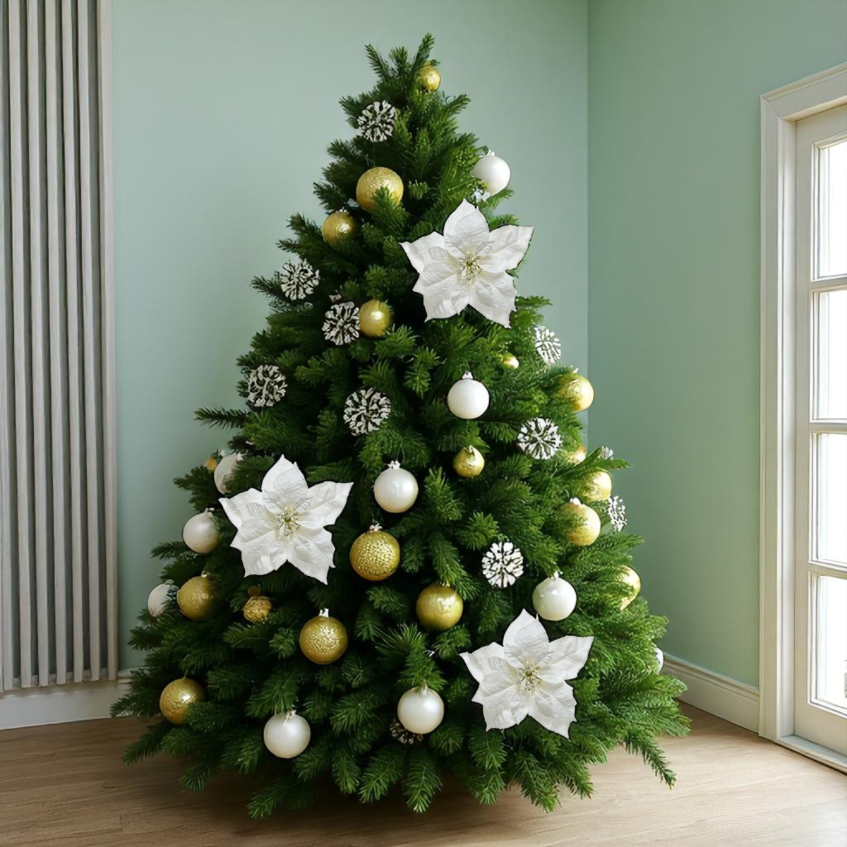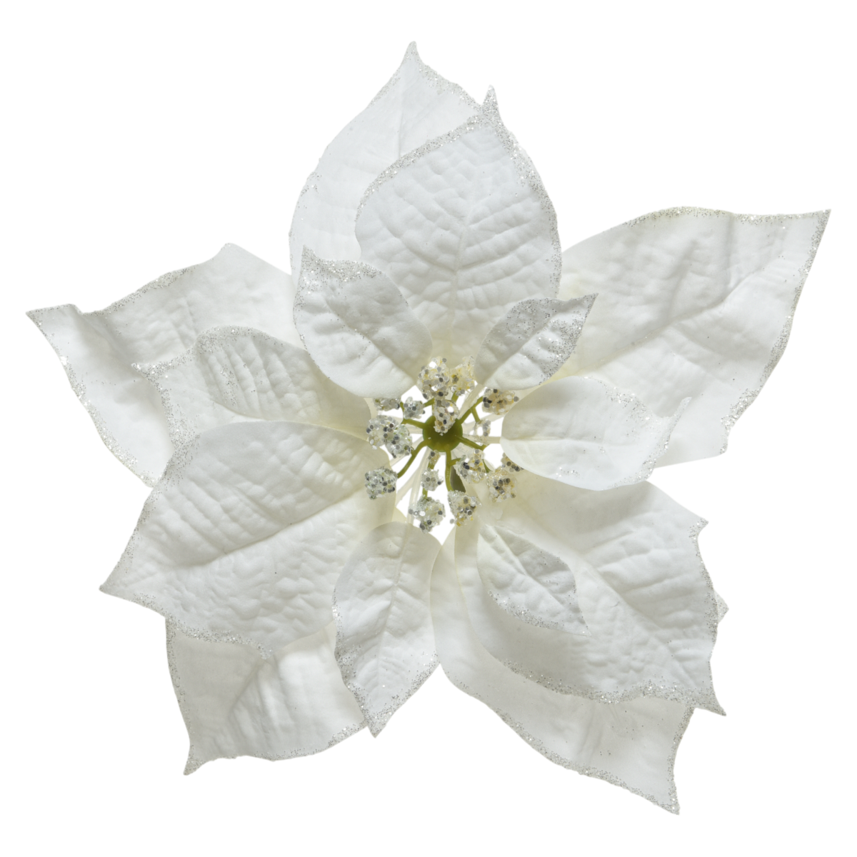 Ez a 24 cm átmérőjű fehér művirág gyöngyszerű középrésszel és csillámos szegéllyel díszített szirmaival igényes kiegészítője lehet bármilyen karácsonyi vagy ünnepi dekorációnak. Visszafogott színe és különleges kidolgozása jól érvényesül koszorúkon, asztaldíszekben vagy akár a fenyőfán is.