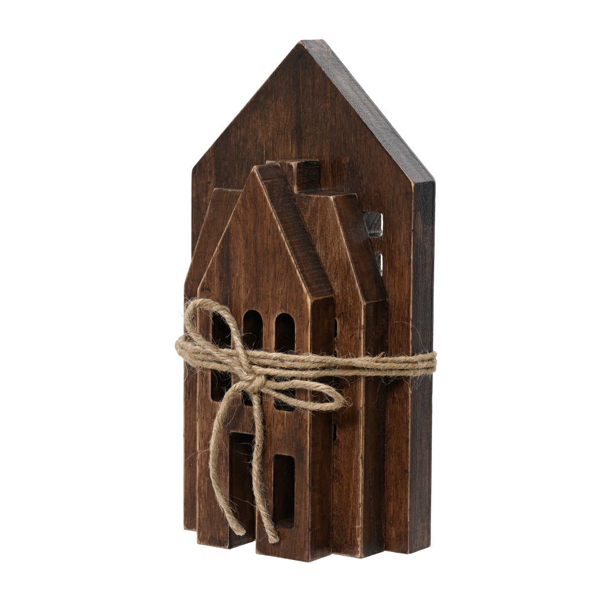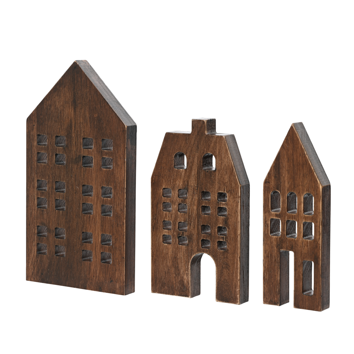 Három darabos fa házikó szett, ablakokkal és ajtókivágással. Skandináv stílusú dekoráció. Igazi hangulatkeltő elem. A házikók különböző frontokkal és méretekkel rendelkeznek.