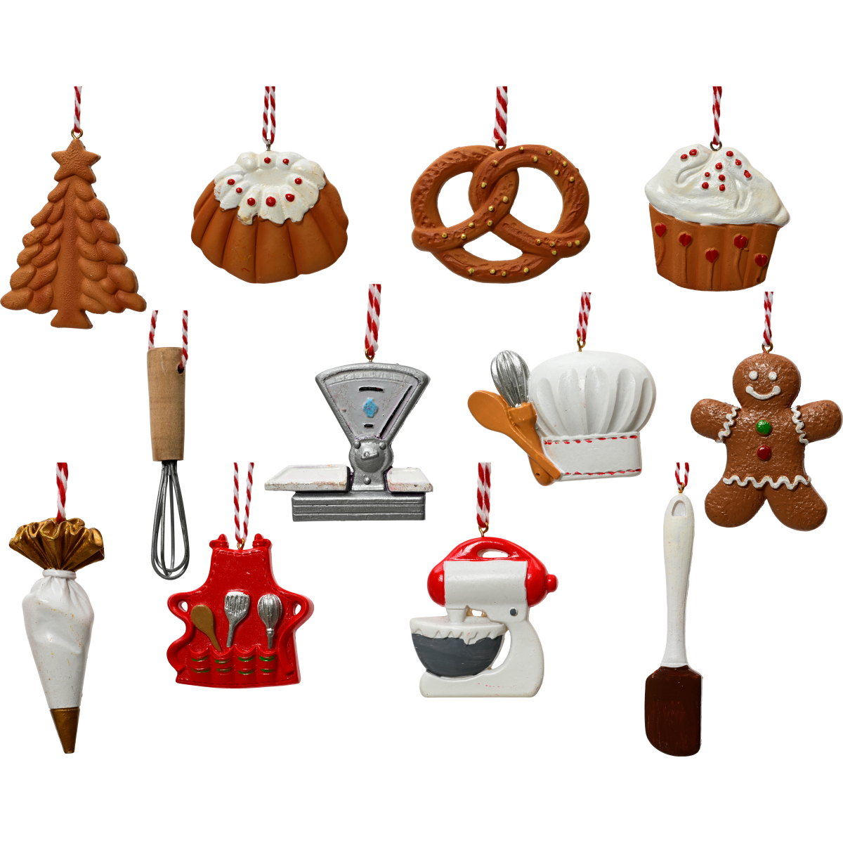 A sütés tematikájú karácsonyfa díszek keverik az ünnepek varázsát a konyha ínycsiklandó világával. Minden darab a sütés és a finom falatok szeretetét idézi, miközben a karácsonyfát is díszíti, így különleges és kedves kiegészítője lehet az ünnepnek. A díszek polirezinből készültek és egy praktikus akasztóval is rendelkeznek, így könnyedén felhelyezhetők a fára.