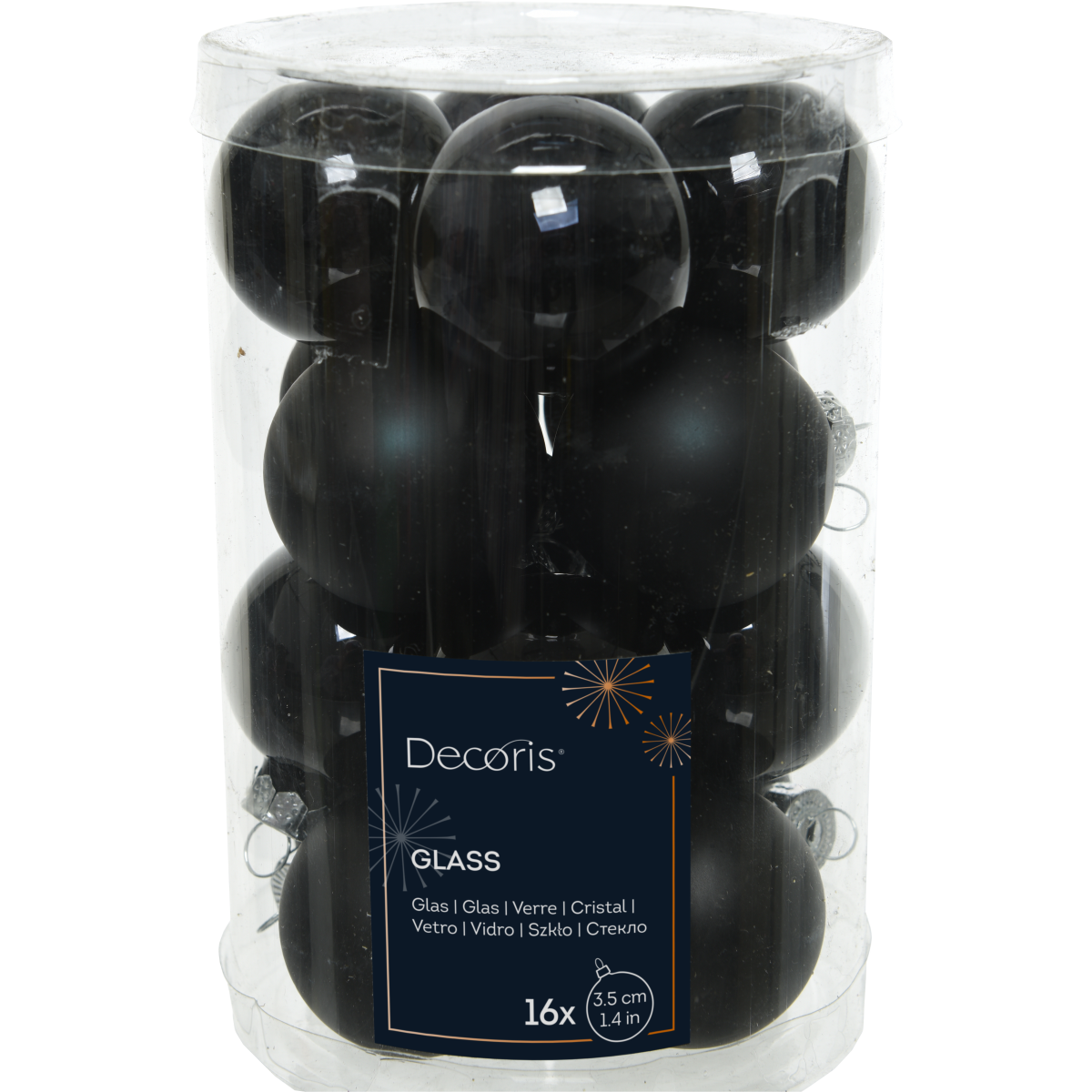 Ez a fekete színű üvegdísz szett egy elegáns karácsonyi dekorációs készlet, amely 16 darab 3,5 cm átmérőjű gömbből áll. A szettben található gömbök matt és fényes felületűek, így változatos textúrát és megjelenést biztosítanak a karácsonyfán. A kiváló minőségű üveg anyaguknak köszönhetően ezek a díszek éveken át megőrzik szépségüket, hozzájárulva az ünnepi hangulat megteremtéséhez.