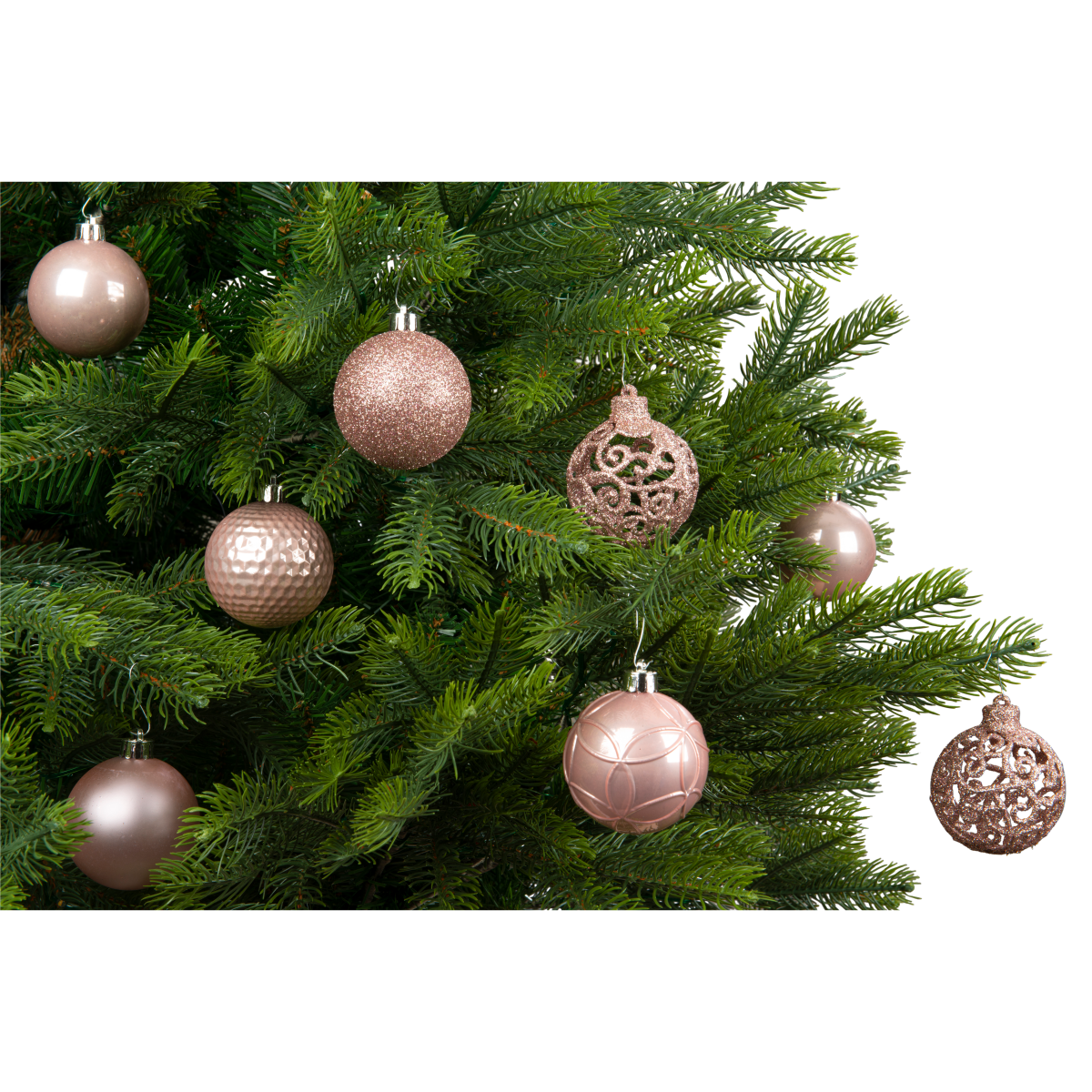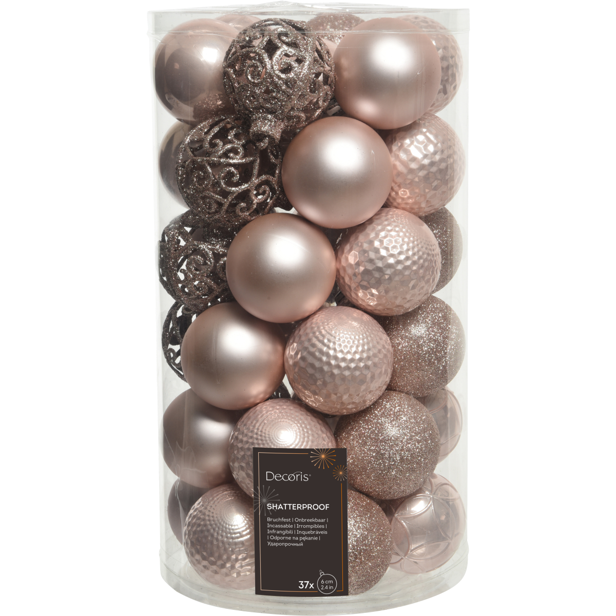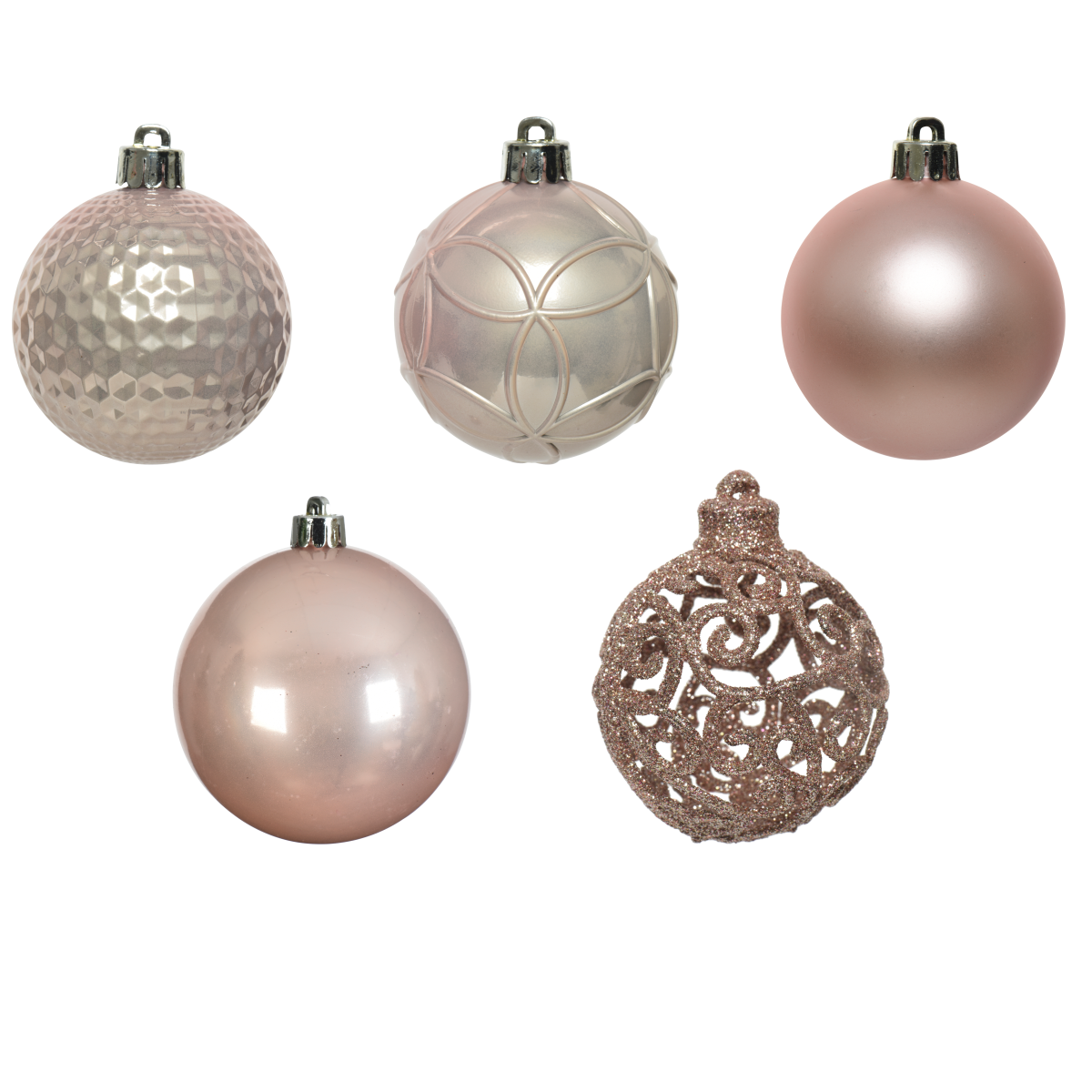 37 db-os karácsonyfadísz szett, 6 cm-es, műanyagból készült gömb szett púder rózsaszín színben, mely egyedi varázst kölcsönöz a fának. Tökéletes központi elem, karácsonyfa- és ajándékdíszek készítéséhez egyaránt alkalmazható.
