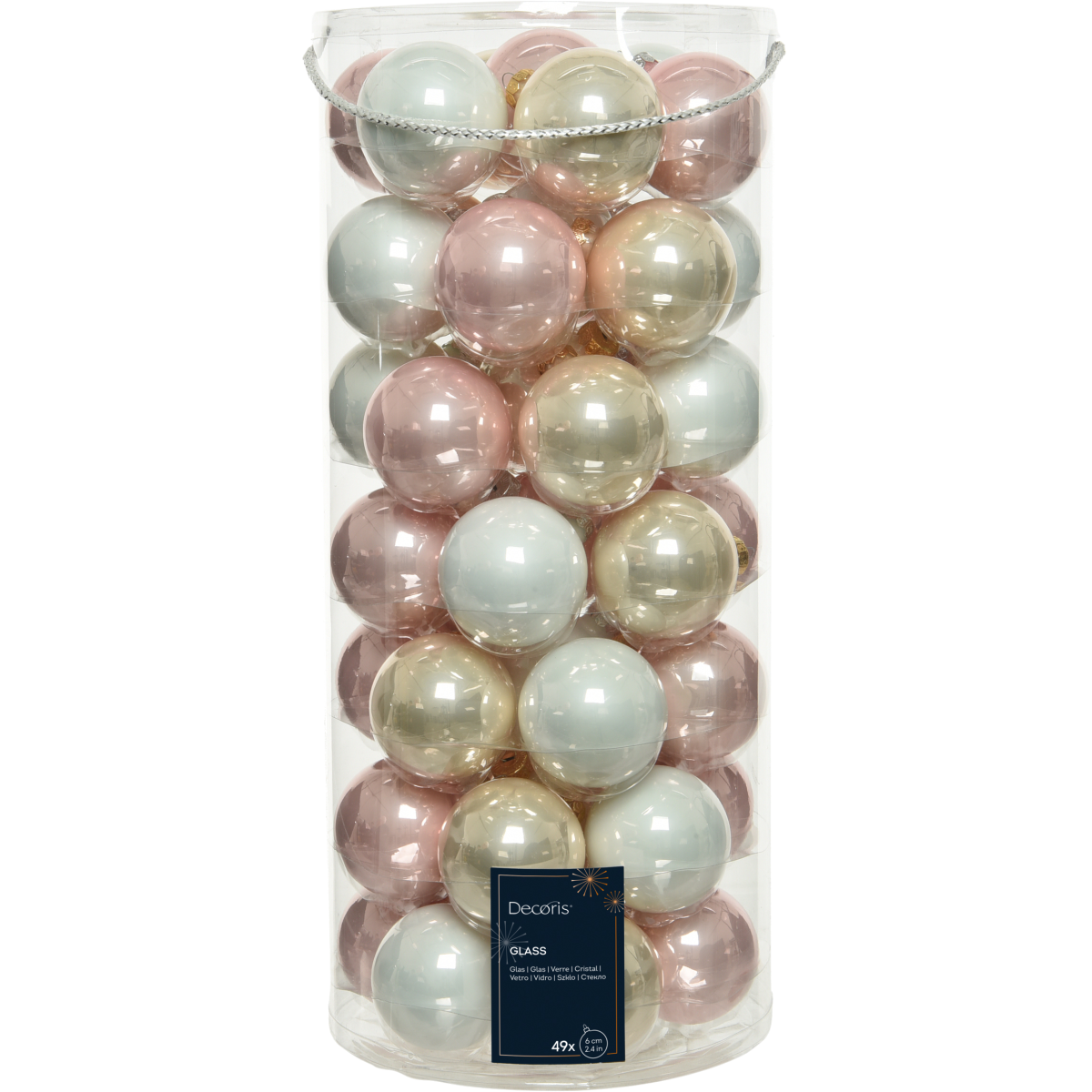 Teremts összhangot otthonodban, és válassz a lakásod ünnepi dekorációjával harmonizáló karácsonyfadíszeket! Ez a karácsonyfadísz szett 49 db 6 cm átmérőjű arany, fehér és rózsaszín gömbből áll. Elegáns színű és fényes felületű gömbjei változatos és esztétikus megjelenést kölcsönöznek a karácsonyfának. Kiváló minőségű üveg anyaguknak köszönhetően sokáig megőrzik szépségüket és éveken át gondoskodnak a karácsonyi hangulatról.