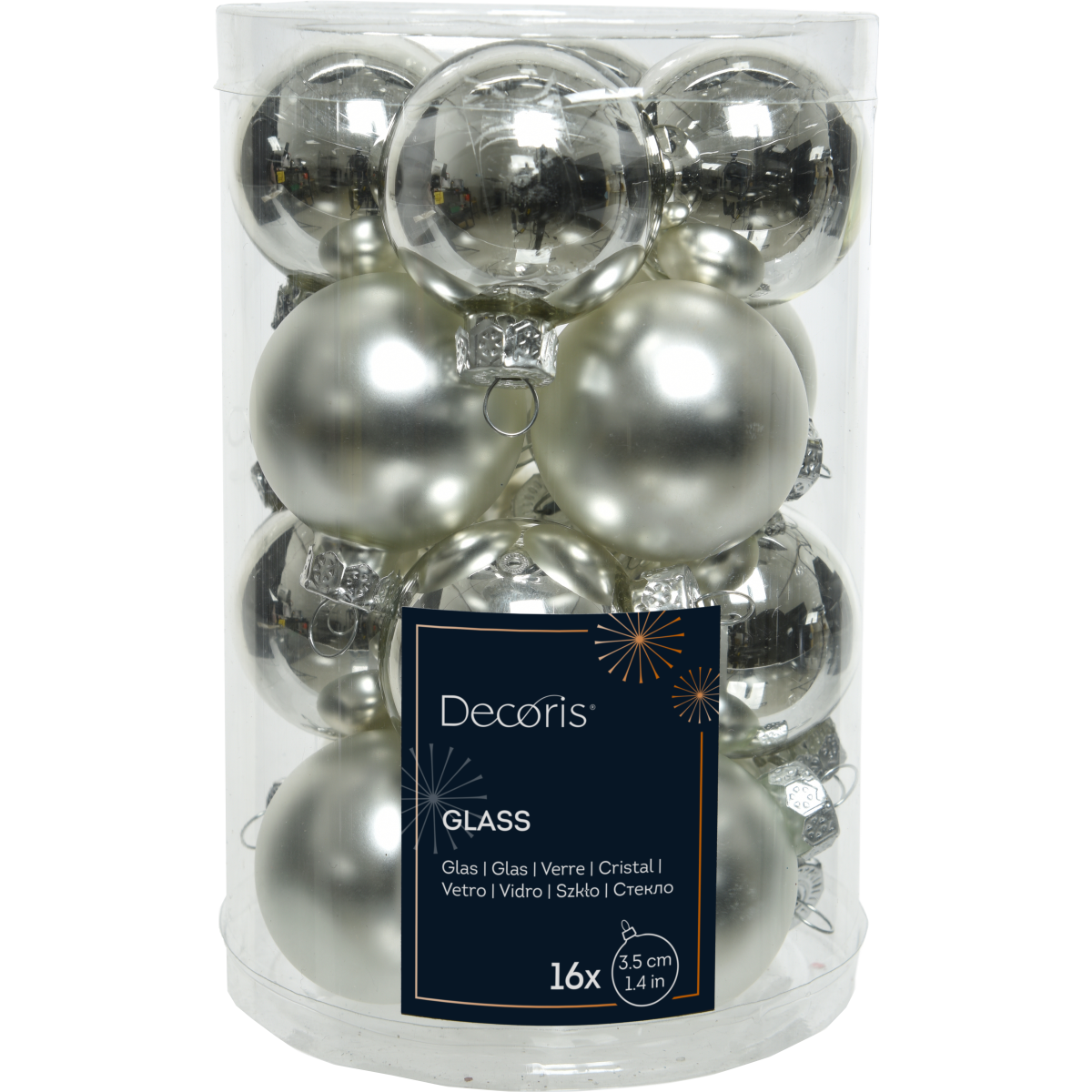 Ez az ezüst színű üvegdísz szett egy elegáns karácsonyi dekorációs készlet, amely 16 darab 3,5 cm átmérőjű gömbből áll. A szettben található gömbök matt és fényes felületűek, így változatos textúrát és megjelenést biztosítanak a karácsonyfán. A kiváló minőségű üveg anyaguknak köszönhetően ezek a díszek éveken át megőrzik szépségüket, hozzájárulva az ünnepi hangulat megteremtéséhez.