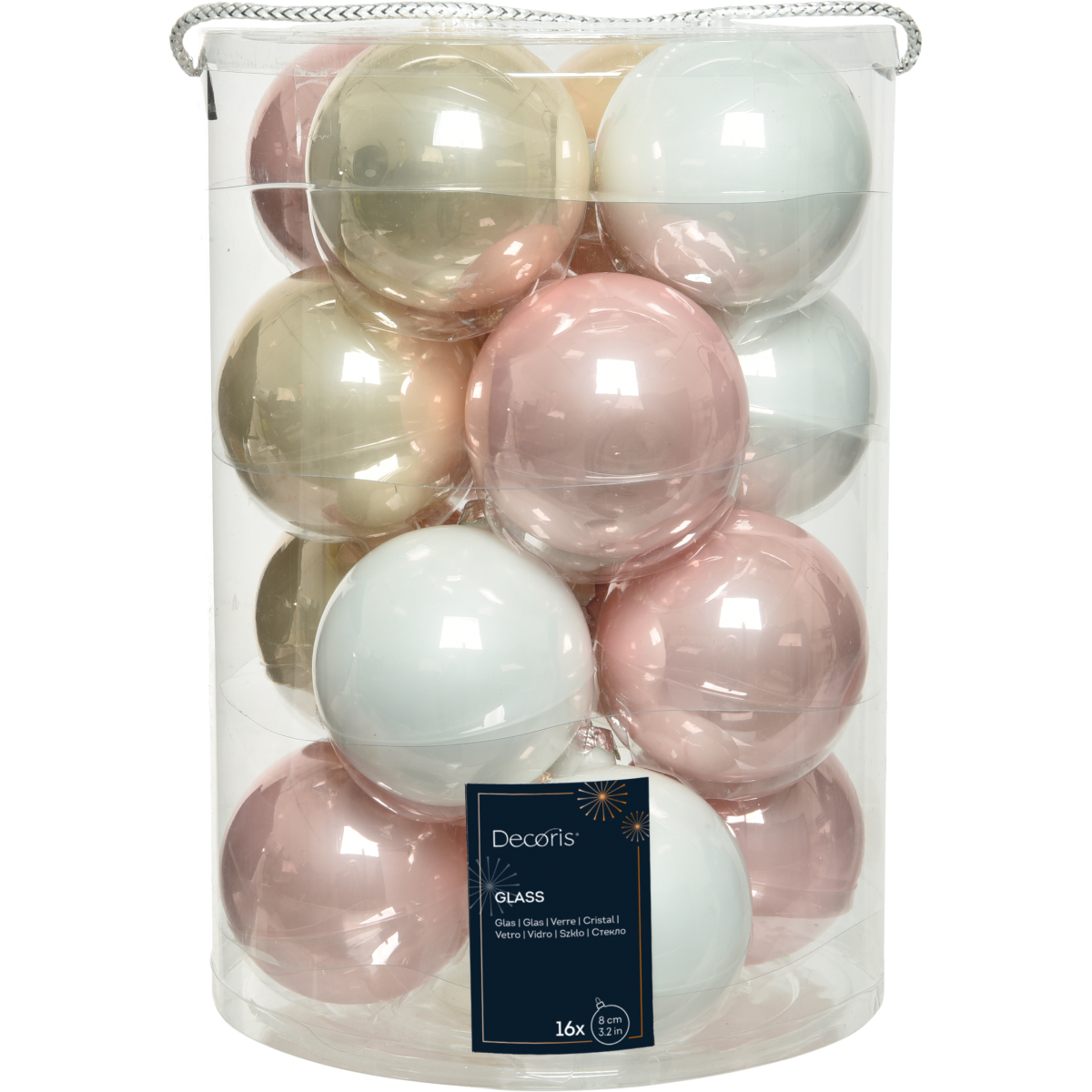 Teremts összhangot otthonodban, és válassz a lakásod ünnepi dekorációjával harmonizáló karácsonyfadíszeket! Ez a karácsonyfadísz szett 16 db 8 cm átmérőjű arany, fehér és rózsaszín gömbből áll. Elegáns színű és fényes felületű gömbjei változatos és esztétikus megjelenést kölcsönöznek a karácsonyfának. Kiváló minőségű üveg anyaguknak köszönhetően sokáig megőrzik szépségüket és éveken át gondoskodnak a karácsonyi hangulatról.