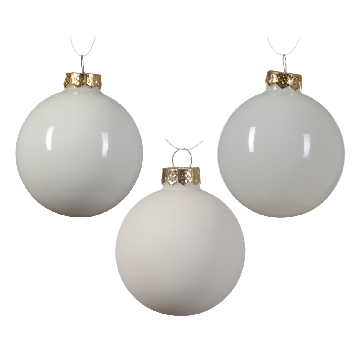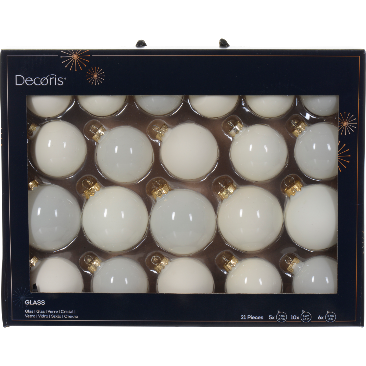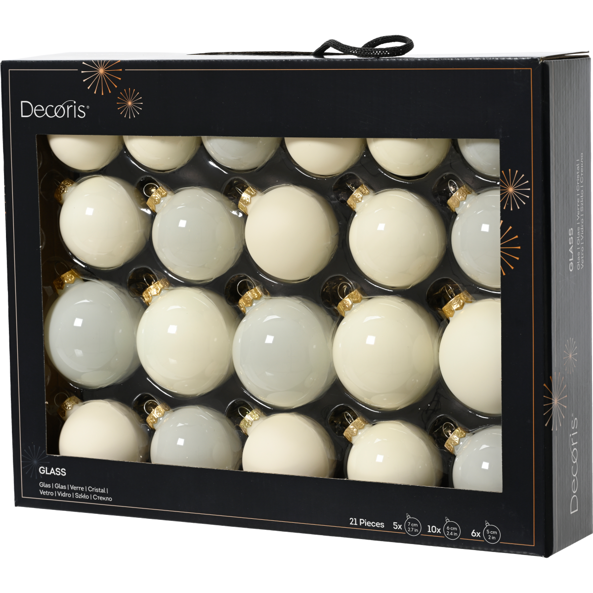 Karácsonyfadísz gömb szett üvegből, 21db-os kiszerelésű, több méret, tejfehér színű.