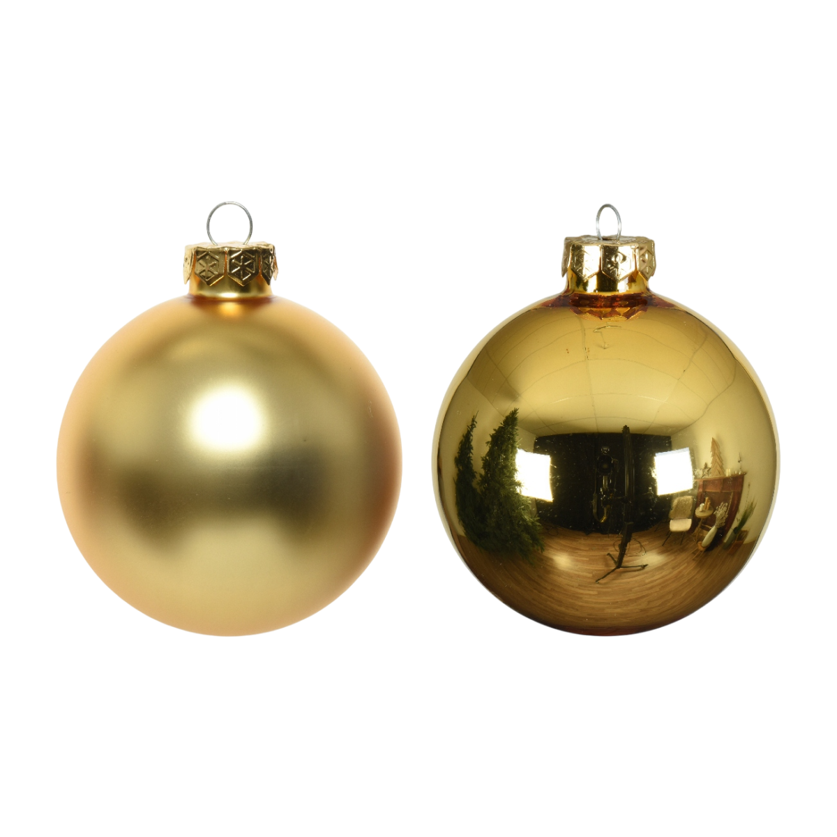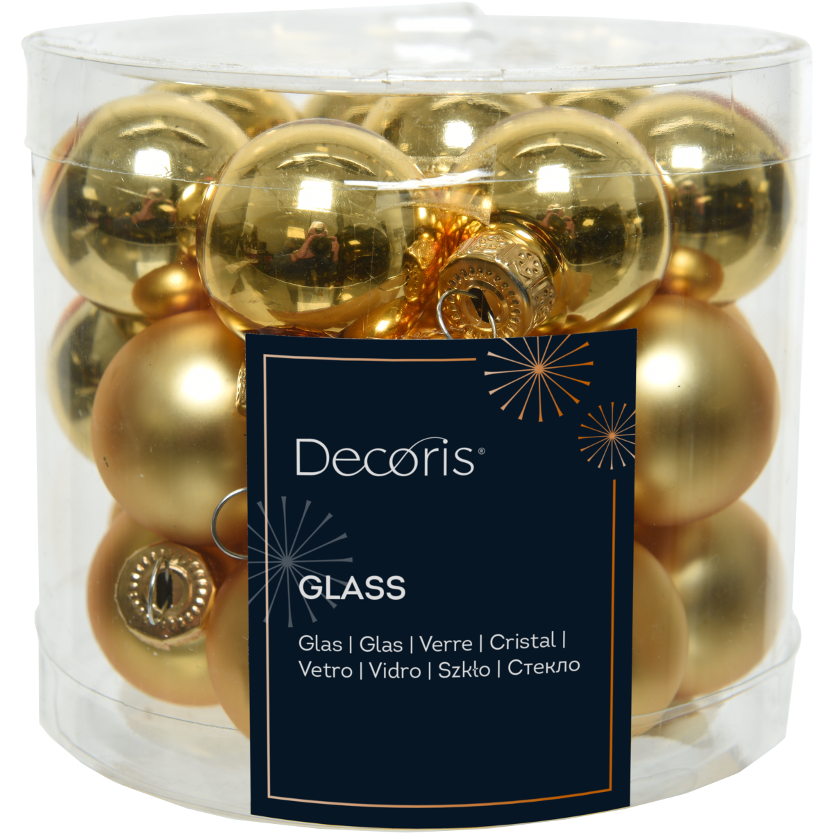 Ez az arany színű üvegdísz szett egy elegáns karácsonyi dekorációs készlet, amely 24 darab 2,5 cm átmérőjű gömbből áll. A szettben található gömbök matt és fényes felületűek, így változatos textúrát és megjelenést biztosítanak a karácsonyfán. A kiváló minőségű üveg anyaguknak köszönhetően ezek a díszek éveken át megőrzik szépségüket, hozzájárulva az ünnepi hangulat megteremtéséhez.