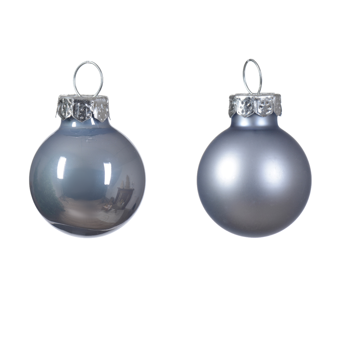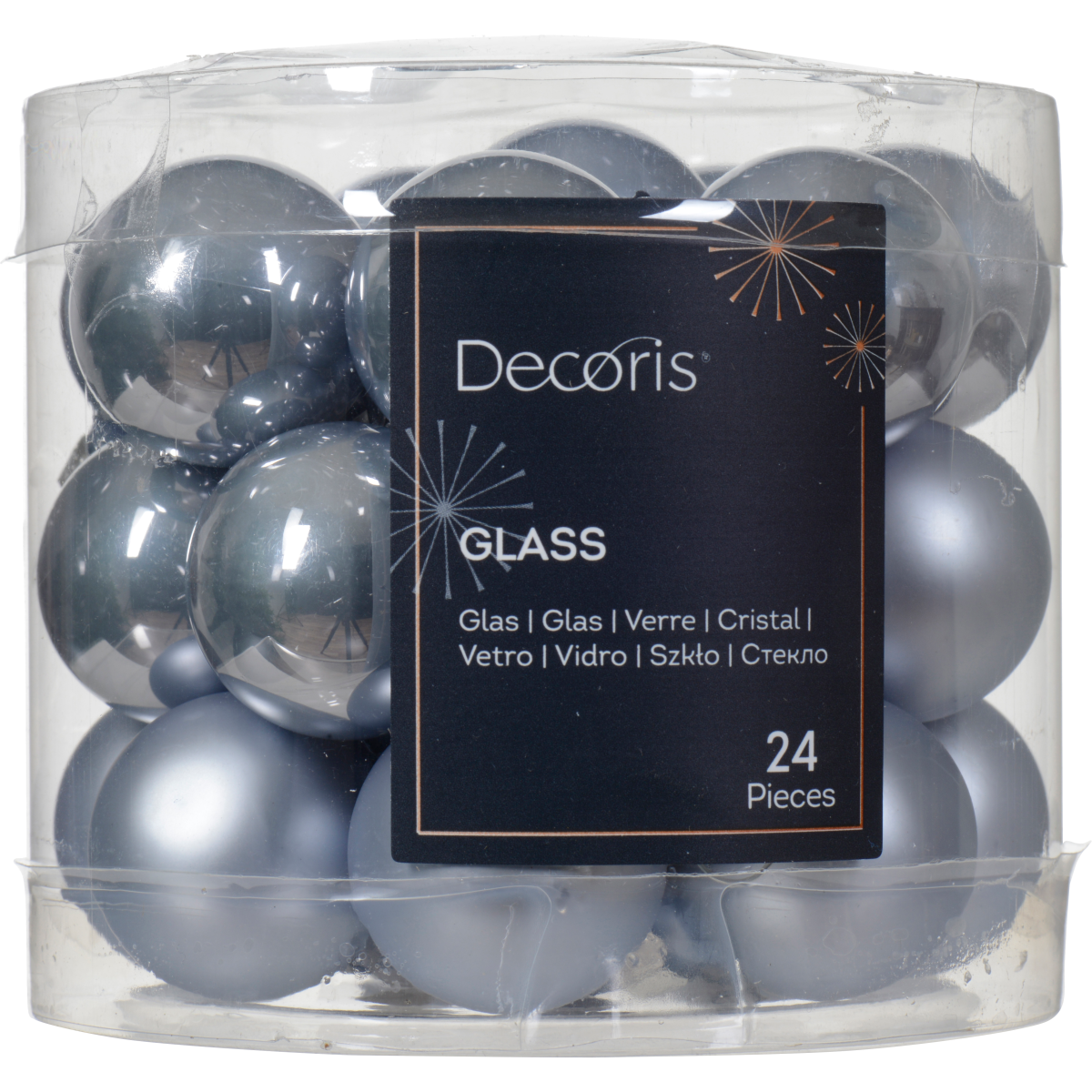 Karácsonyfadísz gömb szett üvegből, 24 db-os kiszerelésű, ködös kék színű, 2,5cm-es díszek.