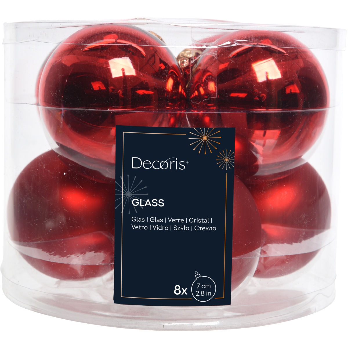 Ez a piros színű üvegdísz szett egy elegáns karácsonyi dekorációs készlet, amely 8 darab 7 cm átmérőjű gömbből áll. A szettben található gömbök matt és fényes felületűek, így változatos textúrát és megjelenést biztosítanak a karácsonyfán. A kiváló minőségű üveg anyaguknak köszönhetően ezek a díszek éveken át megőrzik szépségüket, hozzájárulva az ünnepi hangulat megteremtéséhez.