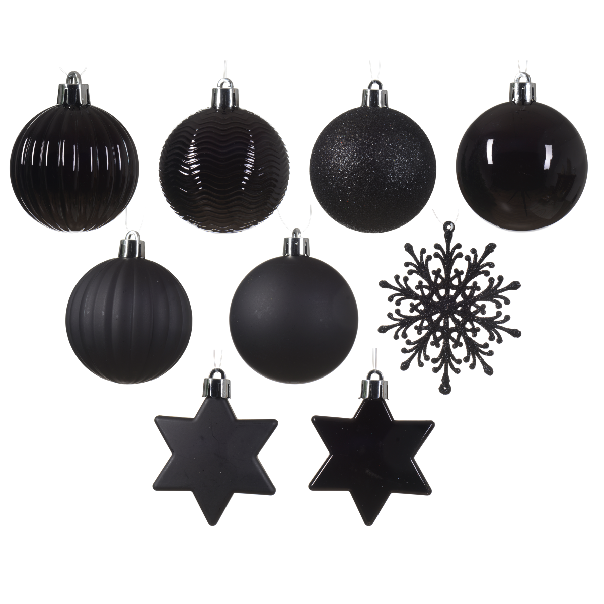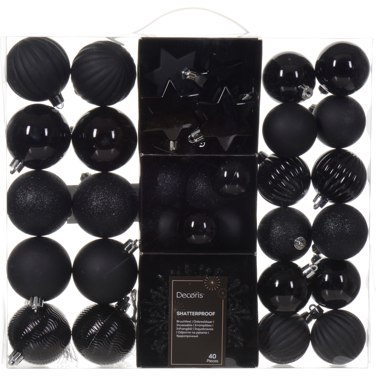 Karácsonyfadísz szett műanyagból készült, 40 db-os kiszerelésű, fekete színű. Különböző méretű és formájú díszek találhatóak a csomagban.
