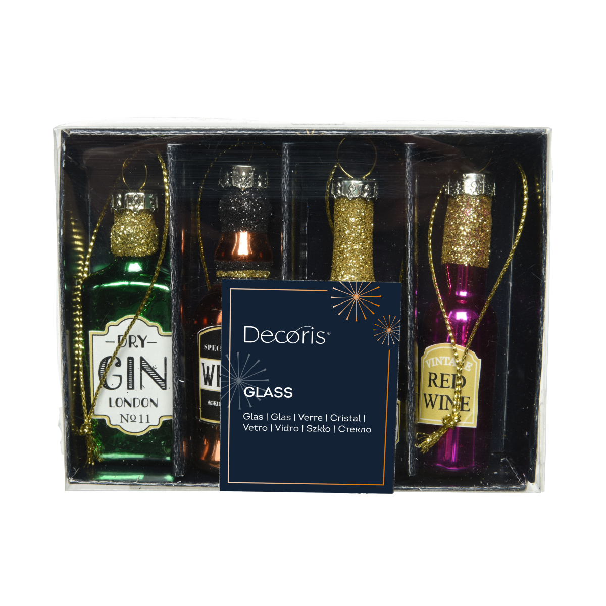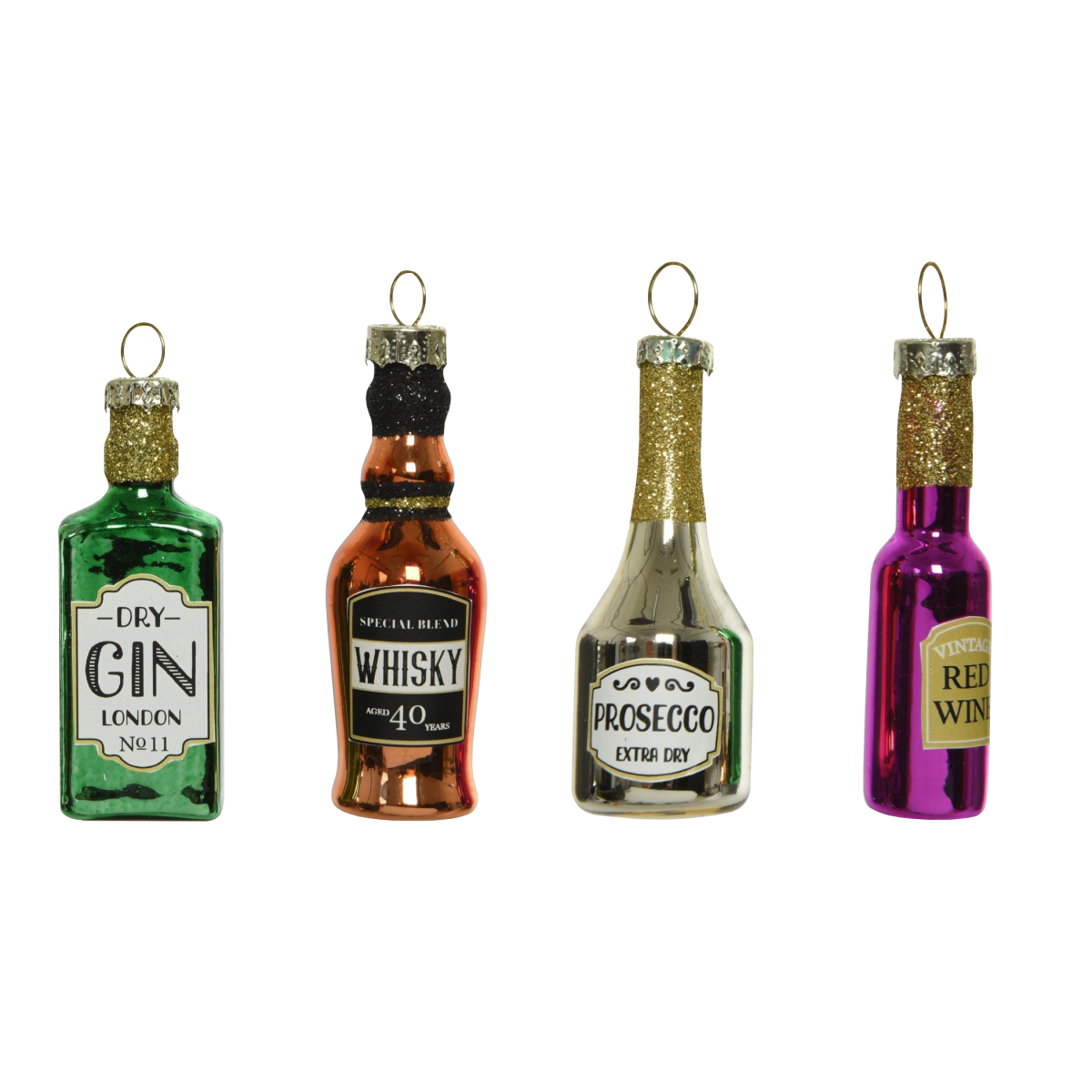 Különleges karácsonyi díszek az élénk megjelenésért. Italos üveg formájú díszek, amelyek új fényt adnak a karácsonyfának. Karácsonyi dekorációnak is ideális az adventi koszorú vagy az ünnepi asztal díszítésére. Nagyon jól kombinálható más karácsonyi díszekkel is. Minőségi üveg alapanyaguknak köszönhetően könnyen tisztán tarthatók és hosszú éveken át megőrzik szépségüket.