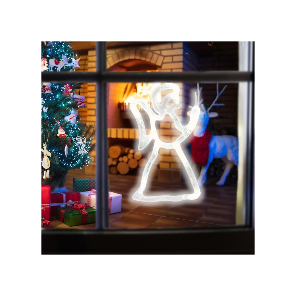 8 db melegfehér Ledet tartalmazó beltéri ablakdísz angyal formában, 20 cm átlátszó vezetékkel, öntapadós elemtartóval. Tápellátás:3 x 1,5 V (AAA) elem, mely nem tartozéka a terméknek. Ezzel a dekorációs eszközzel biztosan örömtelibbé varázsolhatjuk a helyiséget.