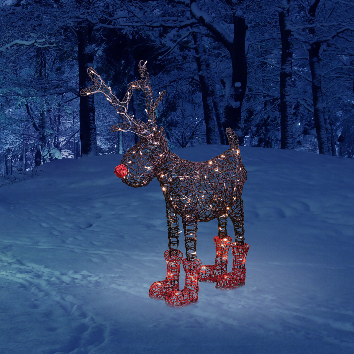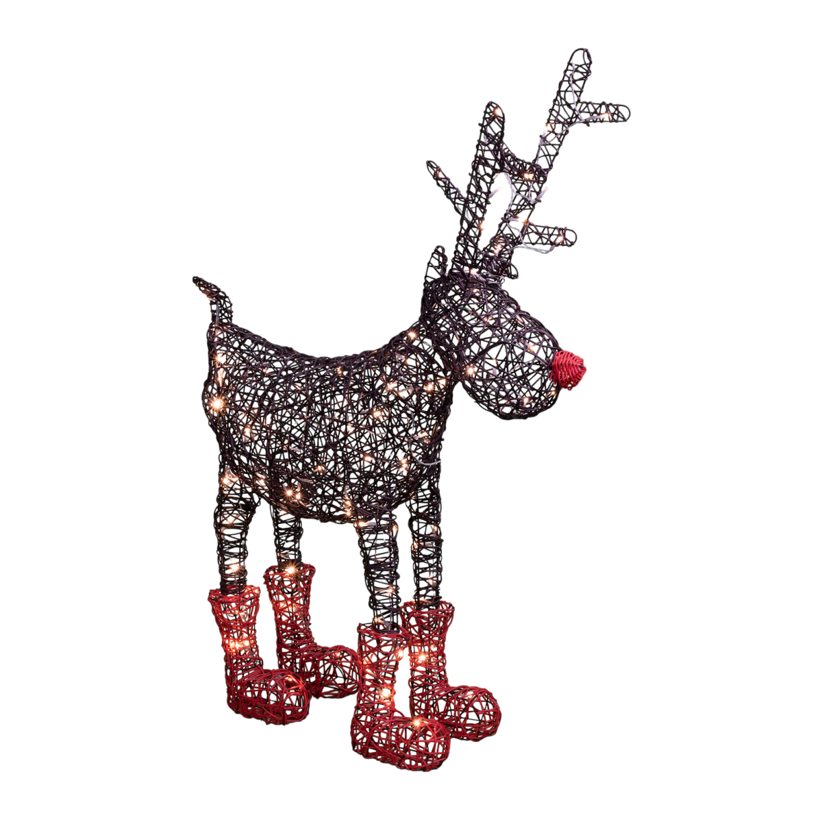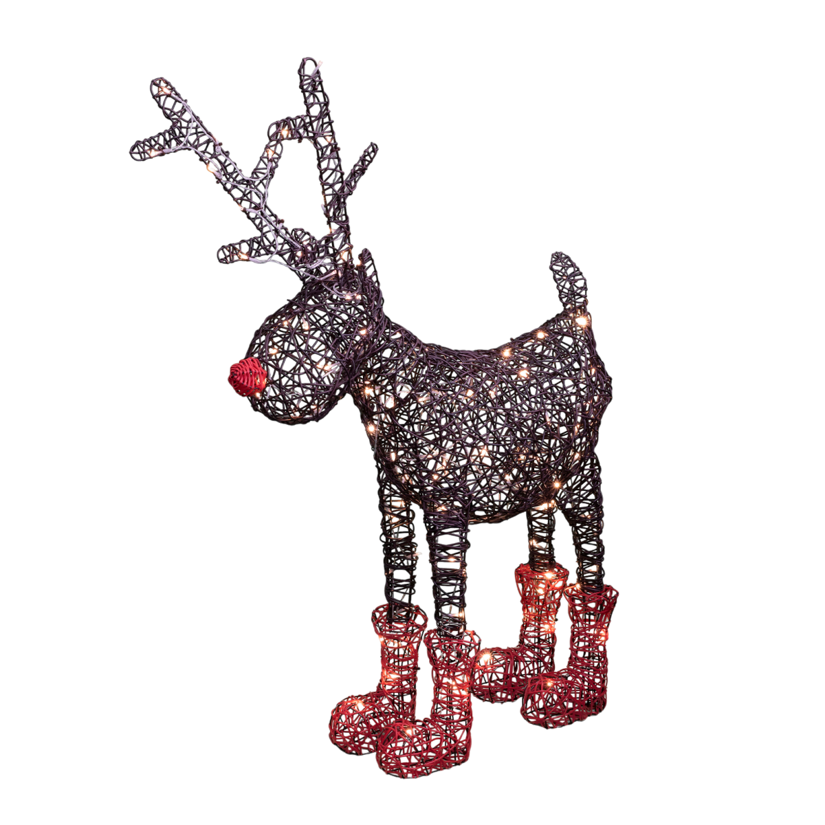 Dekoratív rénszarvas dekor fekete színű fémvázzal, mű rattan alapanyaggal. A 100 db meleg fehér álló fény remek karácsonyi hangulatot áraszt, könnyen kombinálható, díszíthető más karácsonyi díszekkel. IP44-es tulajdonságának köszönhetően kültéren is kiállítható. 5 méter tápvezeték ellátással és hálózati adapterrel. Mérete: 70 cm x 120 cm x 24 cm.