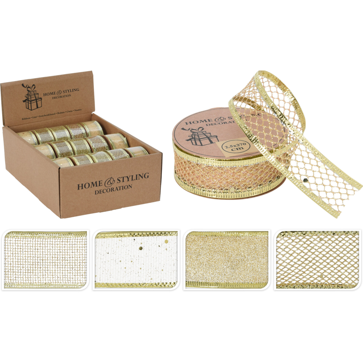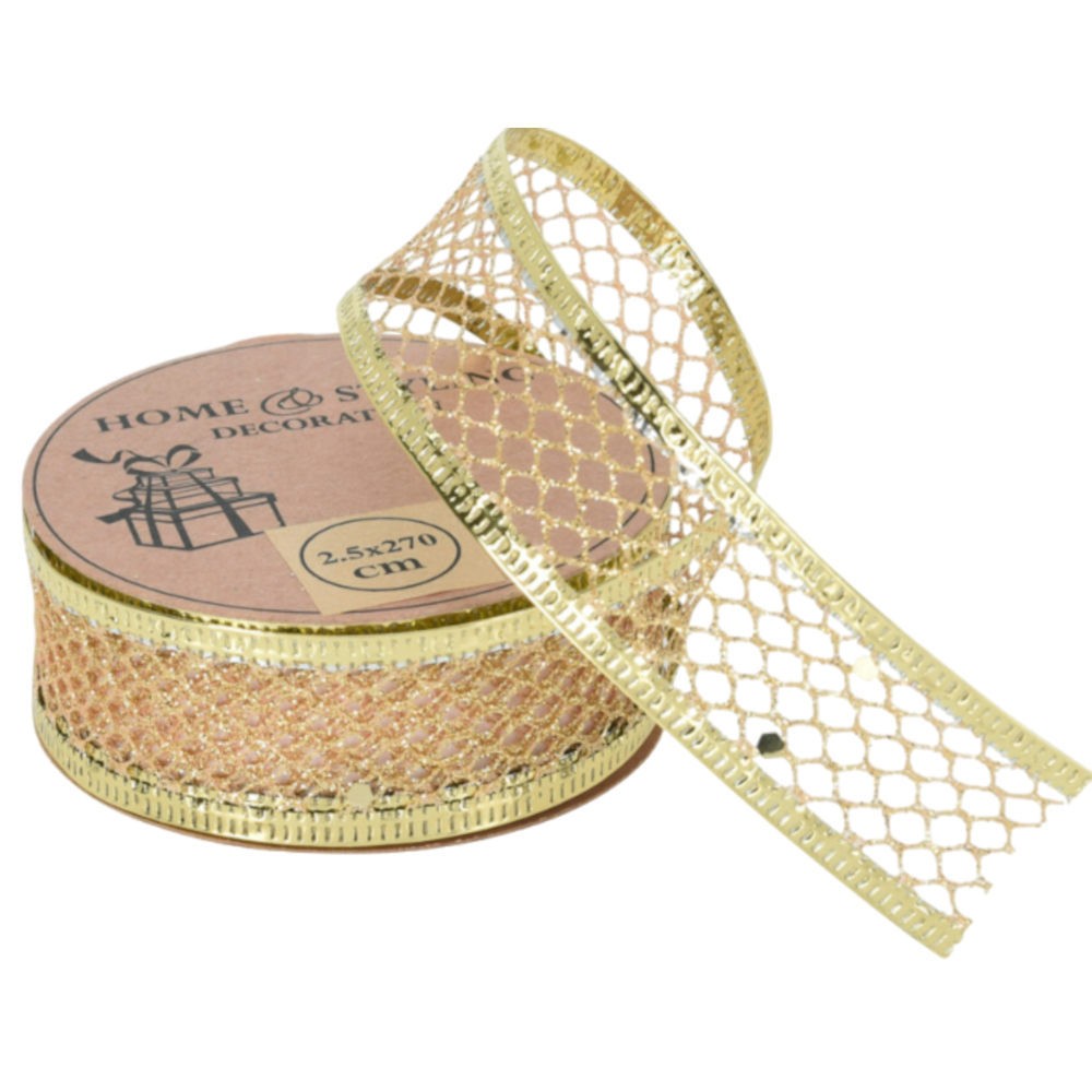 2,5 cm-es arany színű, glitteres szalag 270 cm-es kiszerelésben. Ezzel a díszítő szalaggal (kötözővel) igazán egyedivé varázsolhatjuk az ajándékot, de akár más dekorációs tevékenységre is kitűnően használhatjuk.