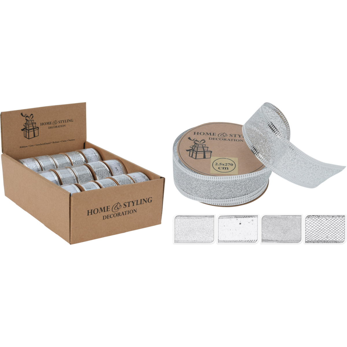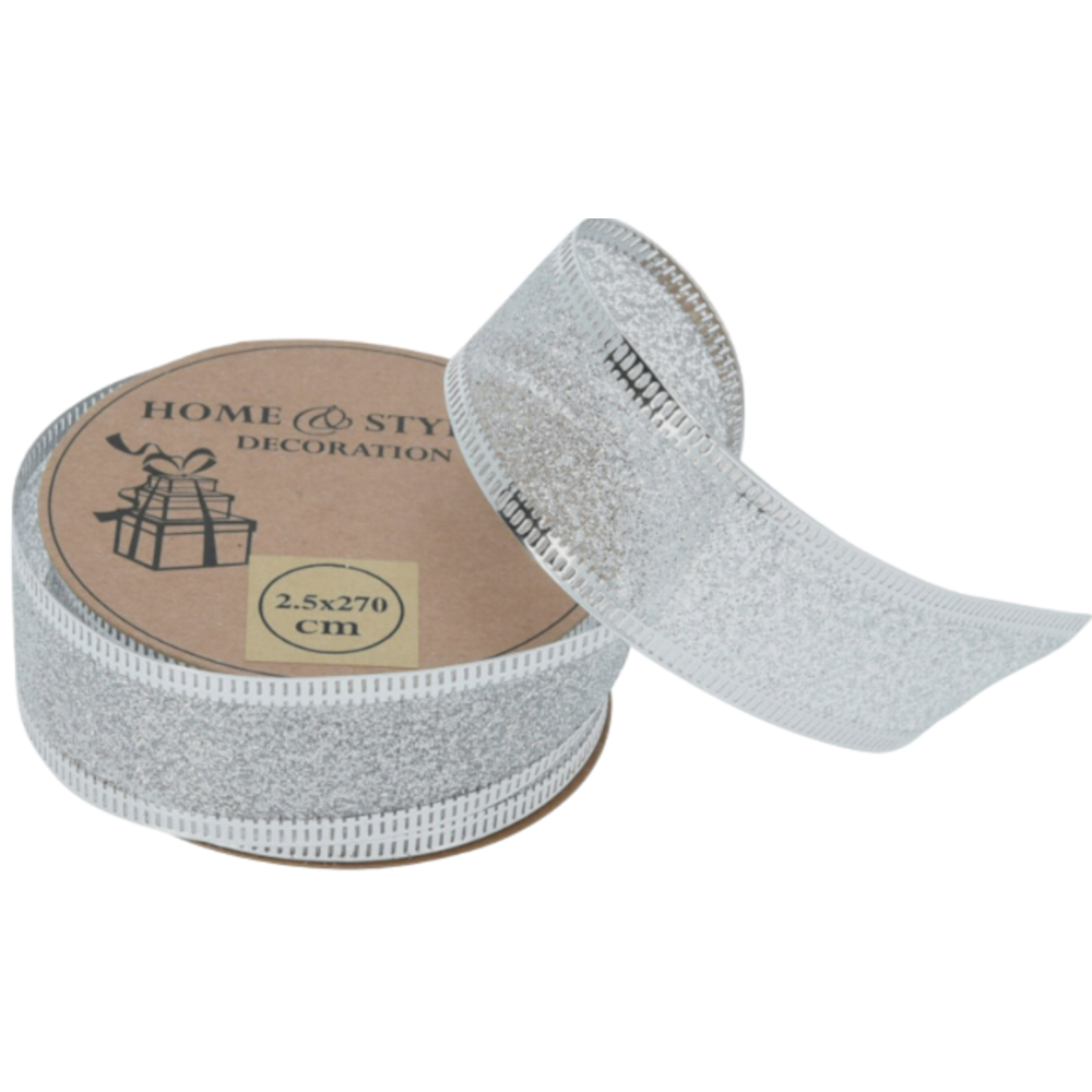 2,5 cm-es ezüst színű, glitteres szalag 270 cm kiszerelésben. Ezzel a díszítő szalaggal (kötözővel) igazán egyedivé varázsolhatjuk az ajándékot, de akár más dekorációs tevékenységre is kitűnően használhatjuk.