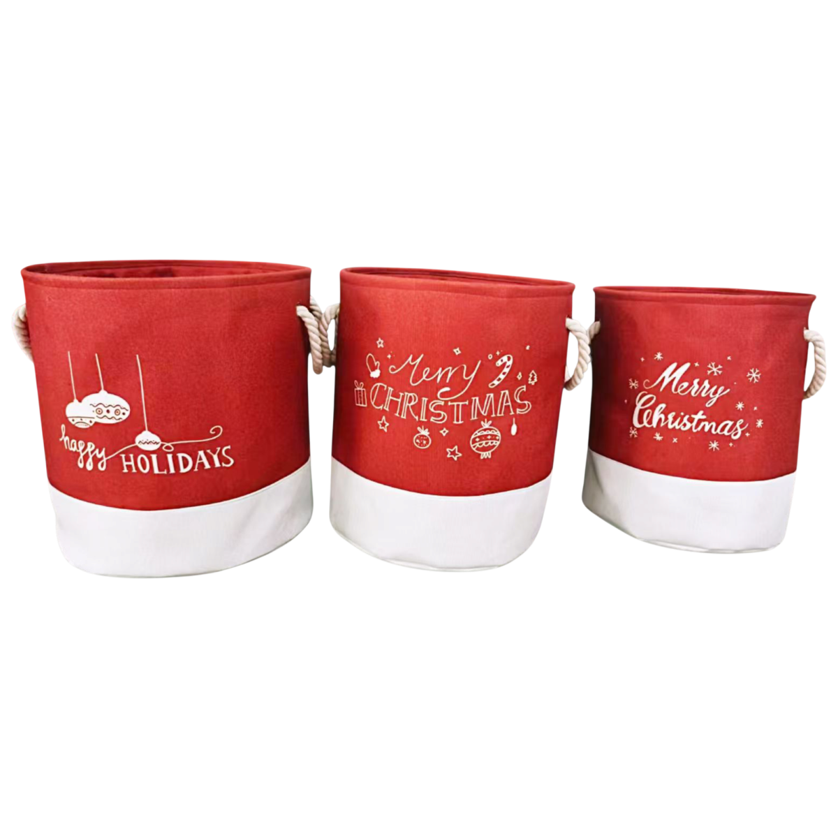 A piros-fehér színvilág, valamint a különböző karácsonyi feliratok vidám megjelenést biztosítanak. A poliészterből készült kosarak erős, fonott füllel rendelkeznek, így könnyen mozgathatók.