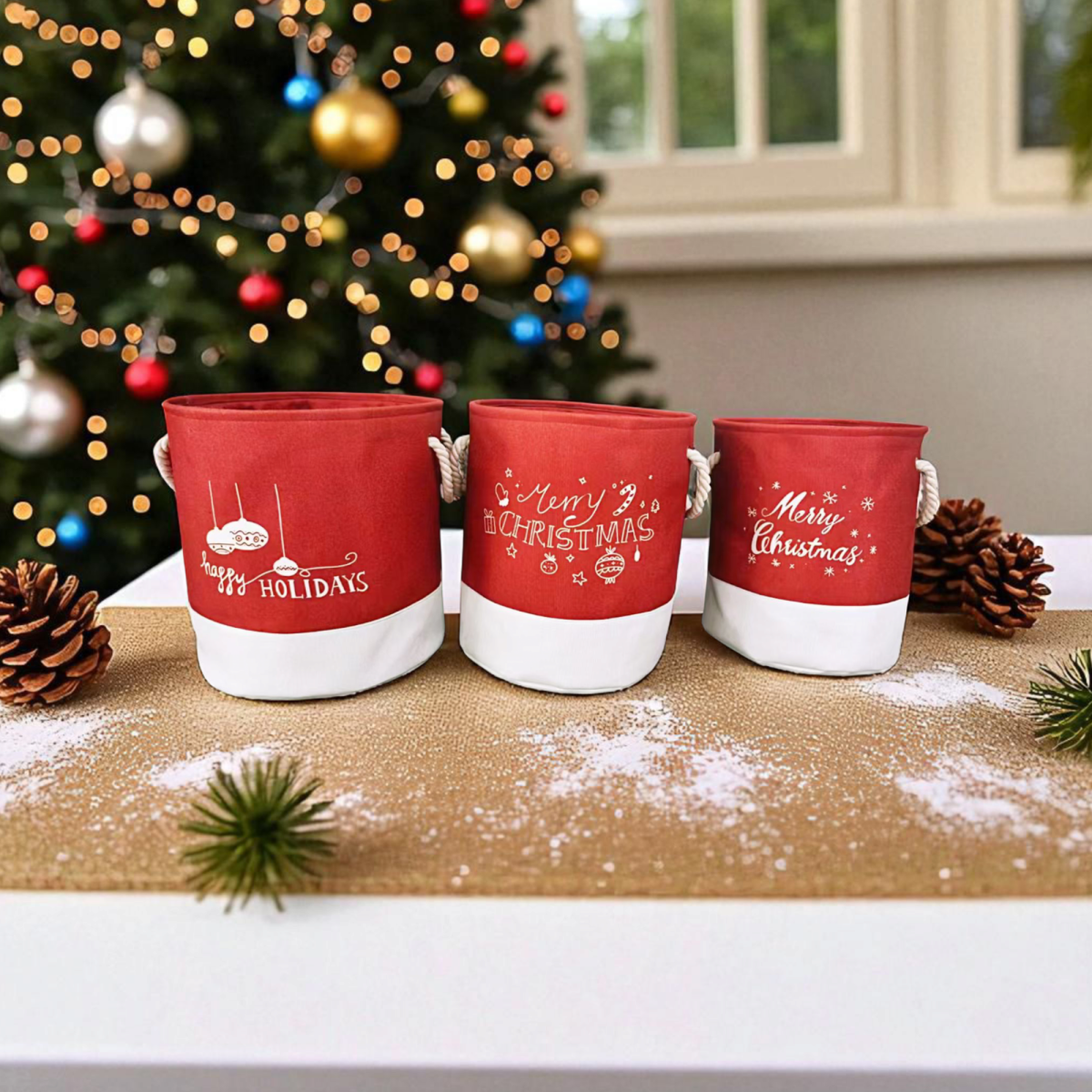 Ez a háromdarabos karácsonyi kosárszett nemcsak praktikus tárolási lehetőséget kínál, hanem ünnepi hangulatot is csempész otthonodba.