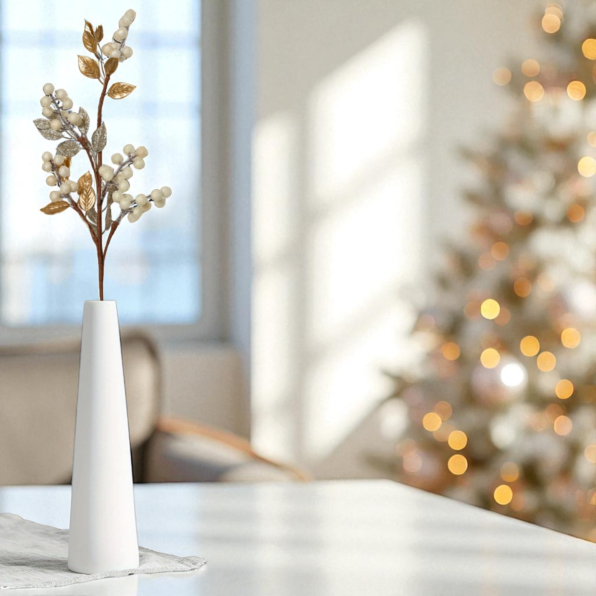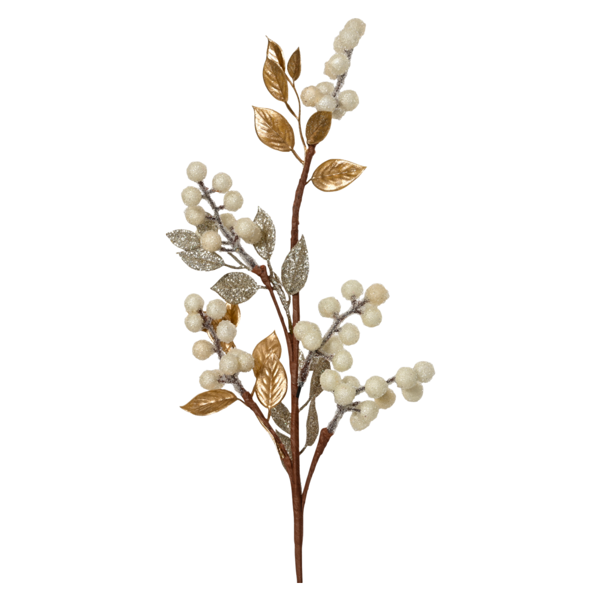 Ez a 60 cm magas, fehér bogyós műnövény arany és ezüst levelekkel elegáns, mégis természetes hatású kiegészítője lehet az ünnepi asztaldíszeknek, koszorúknak vagy ajtódíszeknek. A szár jól formázható, így könnyen igazítható bármilyen kompozícióba.