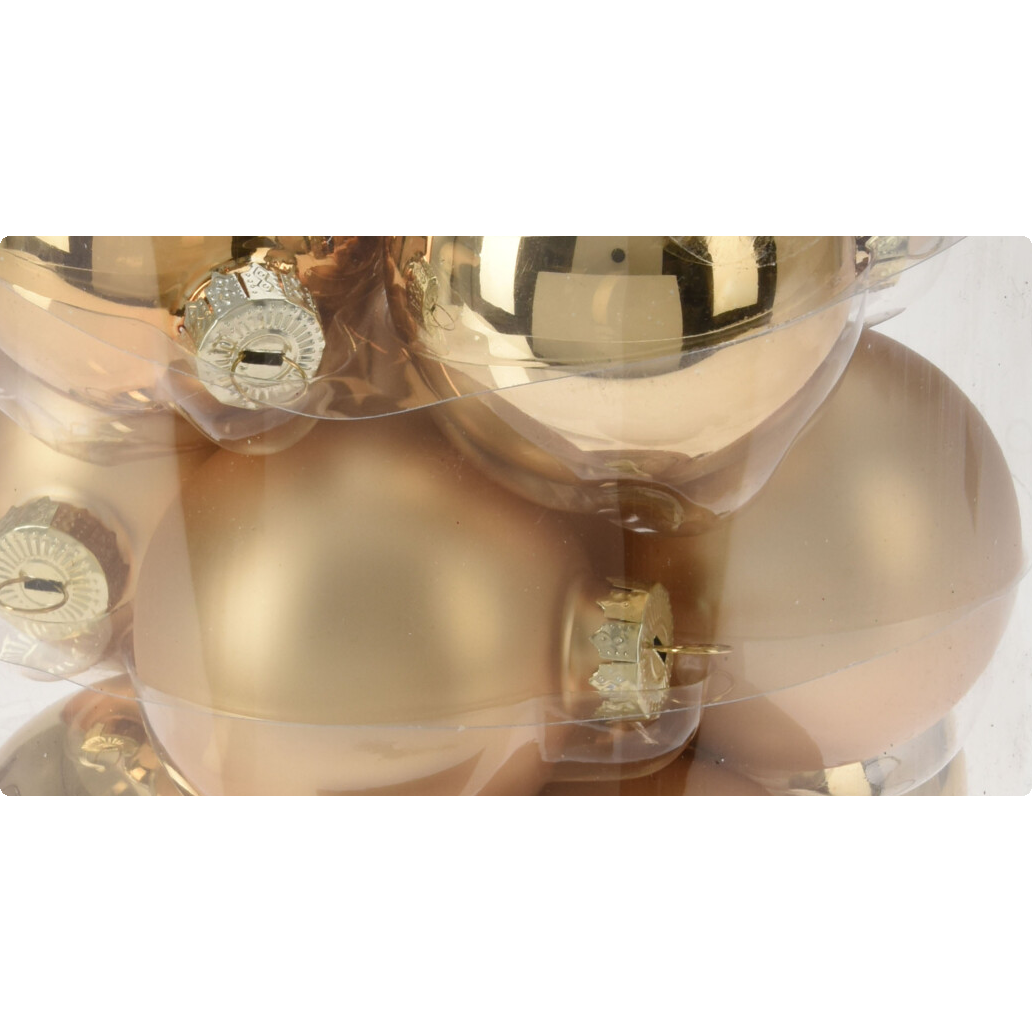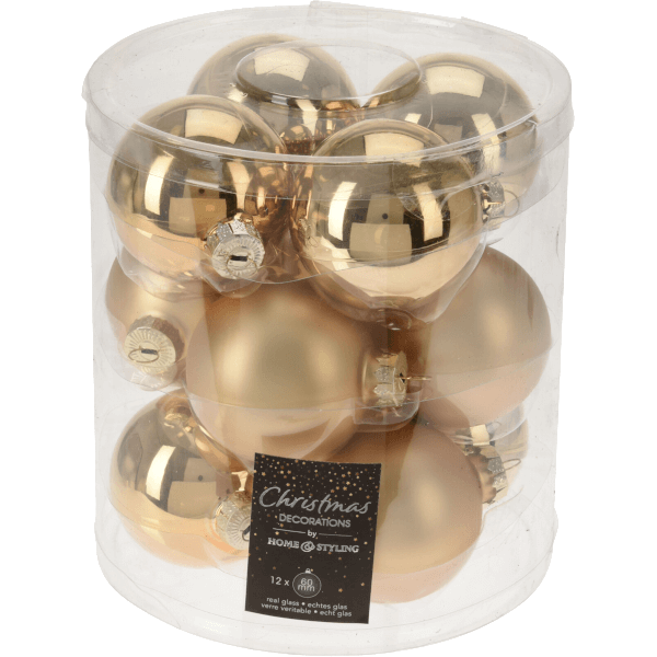 12 darabos, arany színű 6 cm-es üveg gömb szett, mely 6 db fényes és 6 db matt gömböt tartalmaz. Ez az arany színű karácsonyfa gömb szett egyedi varázst kölcsönöz a fának. Tökéletes központi elem, karácsonyfa- és ajándékdíszek készítéséhez.