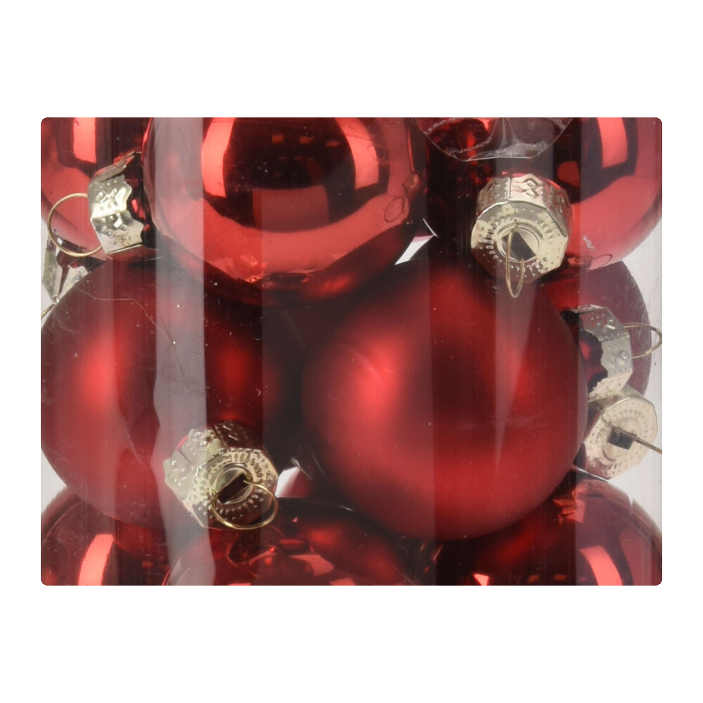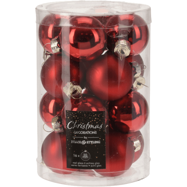 16 darabos, piros színű, 3,5 cm-es üveg gömb szett, mely 8 db fényes és 8 db matt gömböt tartalmaz. Ez a piros színű karácsonyfa gömb szett egyedi varázst kölcsönöz a fának. Tökéletes központi elem, karácsonyfa- és ajándékdíszek készítéséhez.