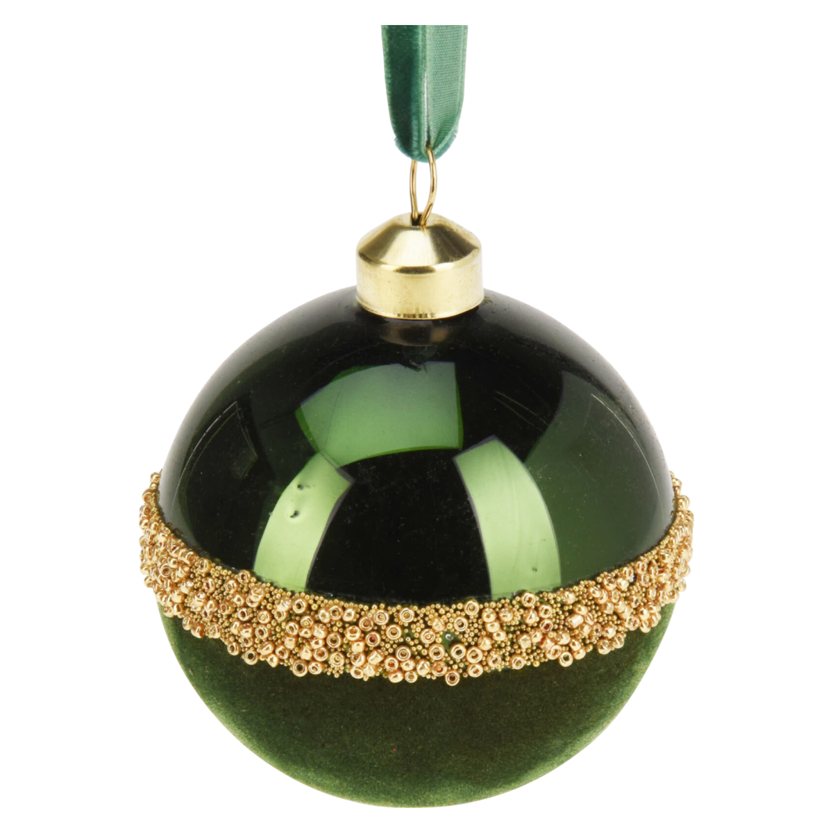 Az aranyszínű gyöngysáv körbeöleli a dísz közepét, egyedi megjelenést kölcsönözve a dekorációnak. A díszek arany színű kupakkal és elegáns zöld bársony akasztóval rendelkeznek, ami tovább fokozza ünnepi megjelenésüket.