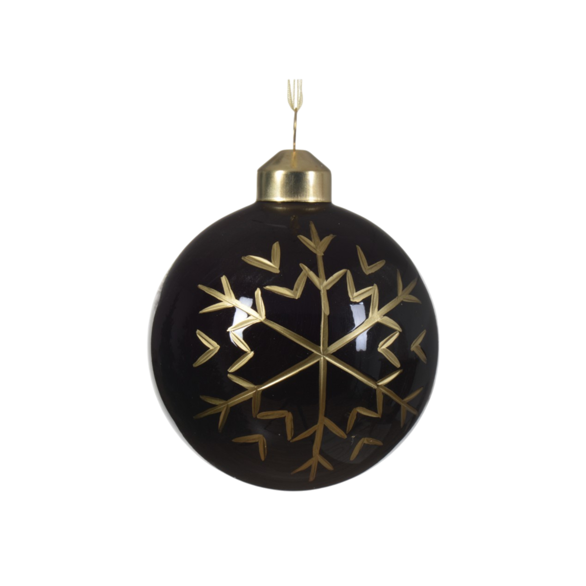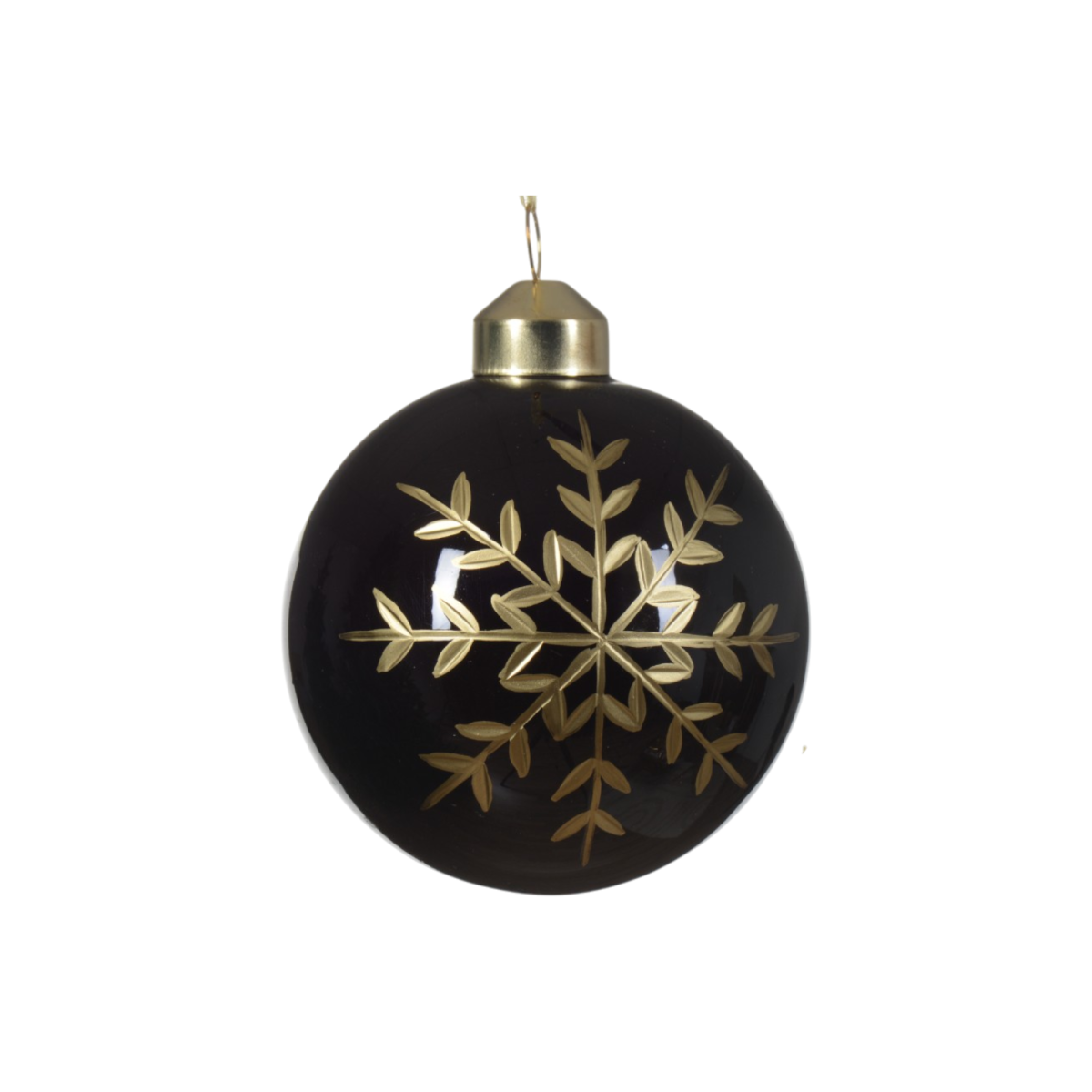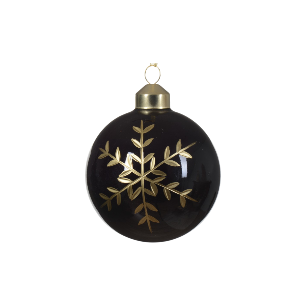 Ez a 8 cm-es fekete üveggömb különleges megjelenést kölcsönöz karácsonyfádnak. A fényes fekete alap és a részletgazdag, arany színű hópehely-minta elegáns kontrasztot alkot, amely remekül illeszkedik modern és klasszikus díszítéshez is. A dísz négy különböző mintával érhető el.