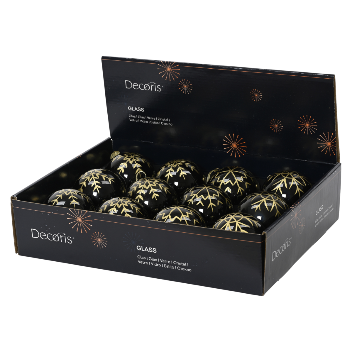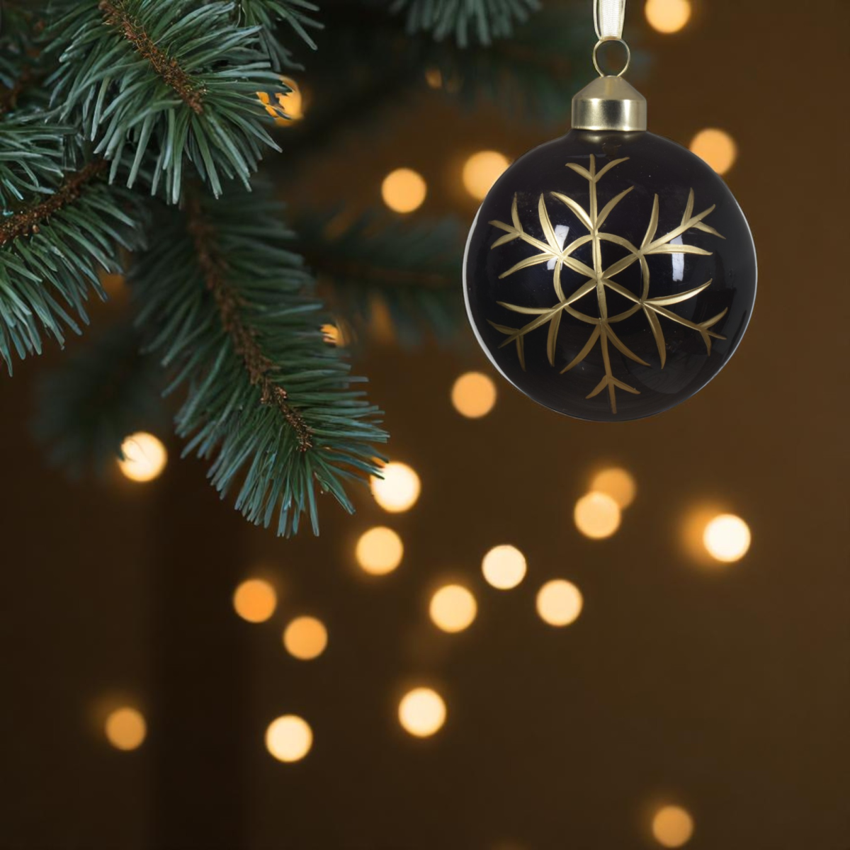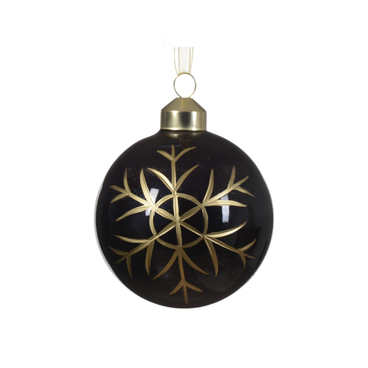 Ez a 8 cm-es fekete üveggömb különleges megjelenést kölcsönöz karácsonyfádnak. A fényes fekete alap és a részletgazdag, arany színű hópehely-minta elegáns kontrasztot alkot, amely remekül illeszkedik modern és klasszikus díszítéshez is. A dísz négy különböző mintával érhető el.
