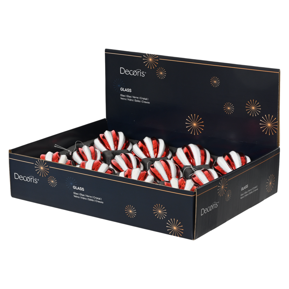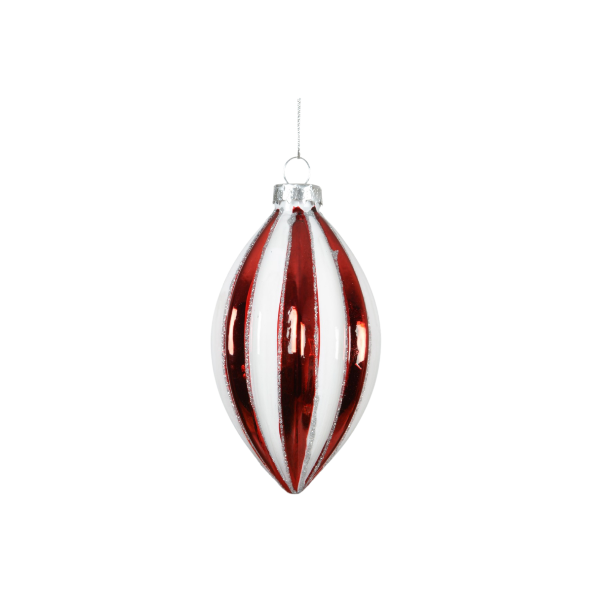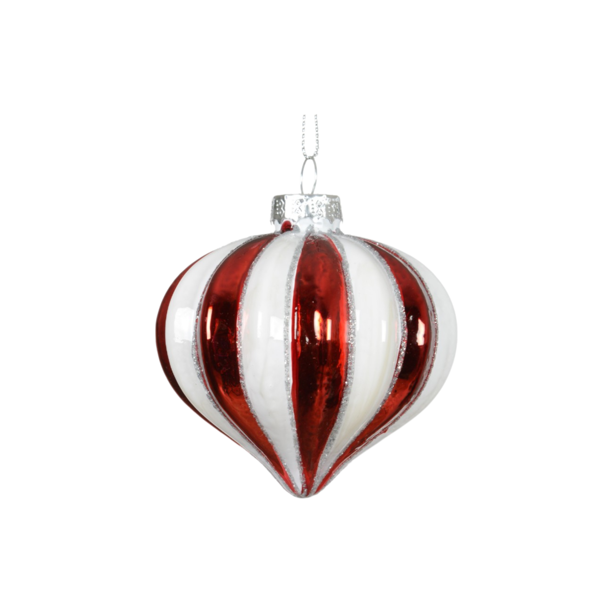Ez a háromféle formában elérhető, 8 cm-es piros-fehér csíkos üvegdísz a hagyományos karácsonyi hangulatot ötvözi a modern fényes felülettel. A gömb, csepp és hagyma alakú díszek változatosságot visznek a fára, a fényes felület pedig ünnepi csillogást ad minden ágnak.