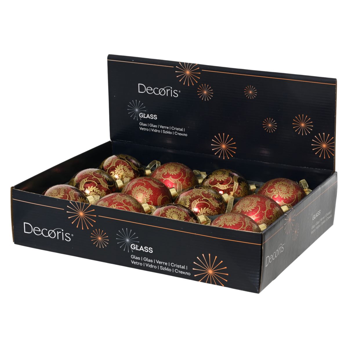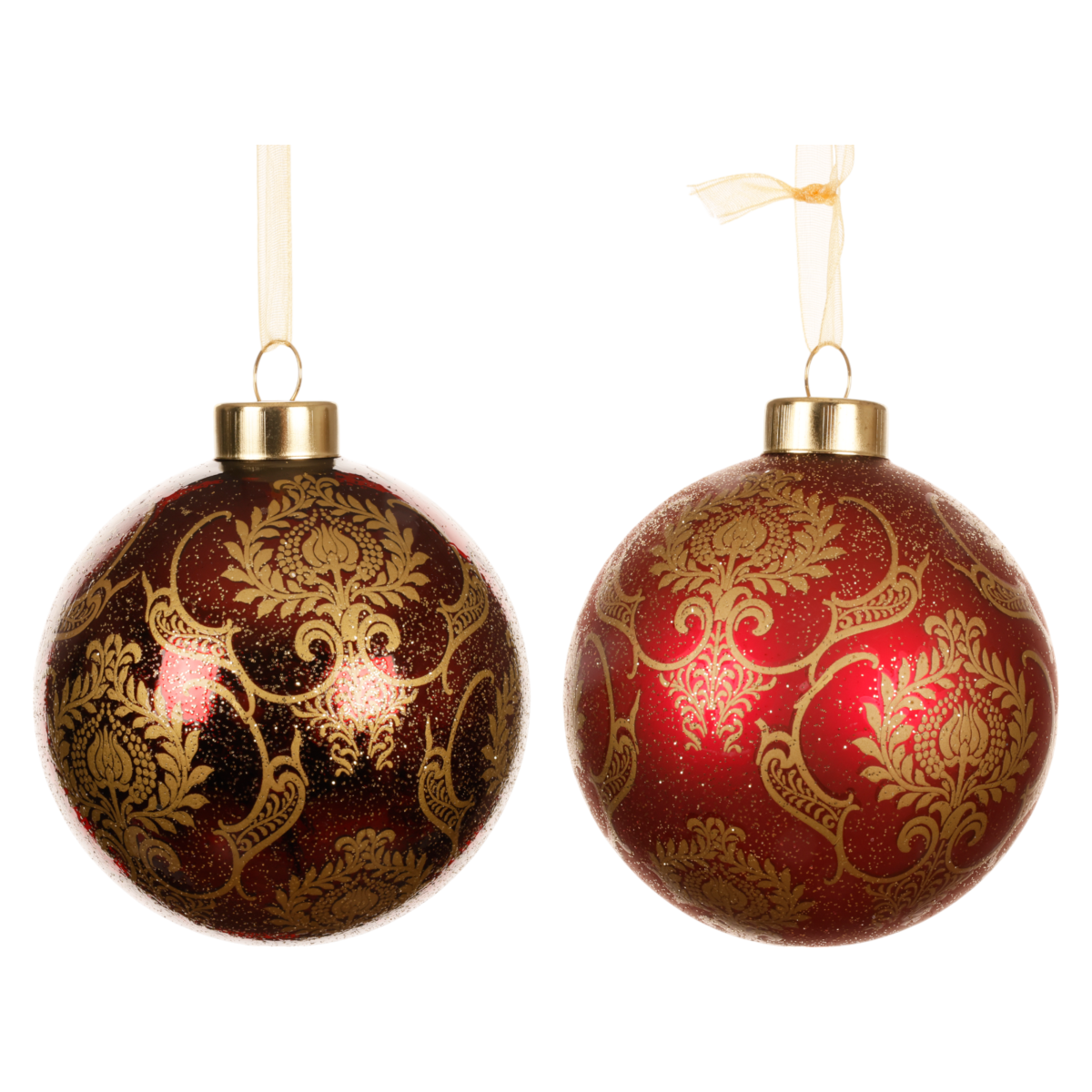 Ez a 8 cm átmérőjű üveggömb elegáns arany virágdekorációval díszített, így tökéletesen illik a hagyományos vagy luxushatású karácsonyfákra.