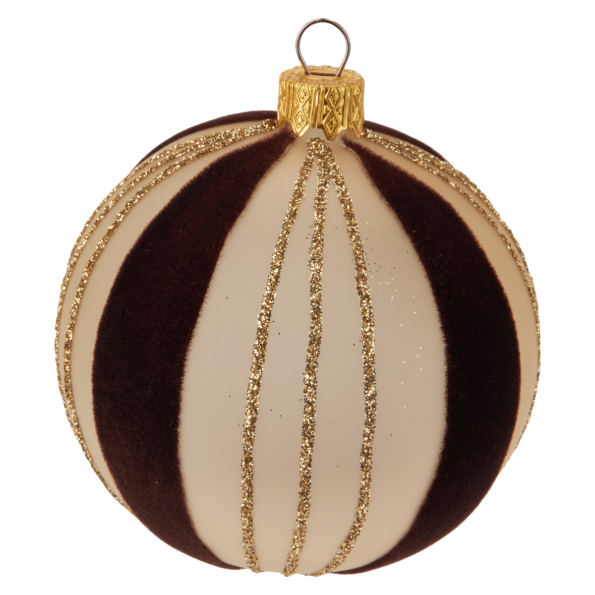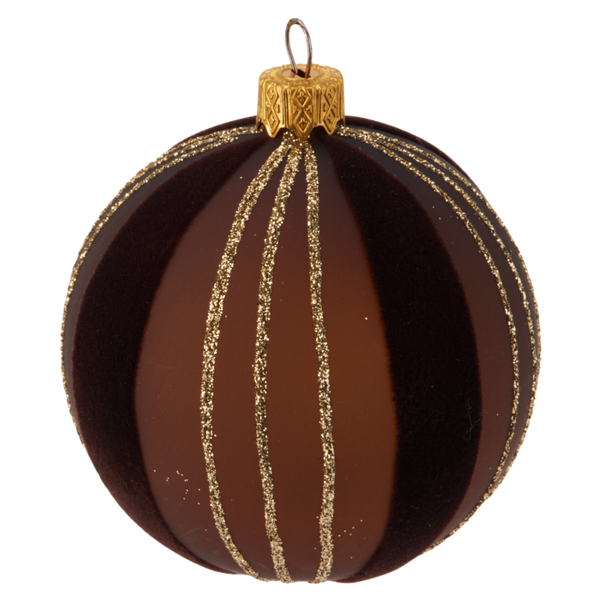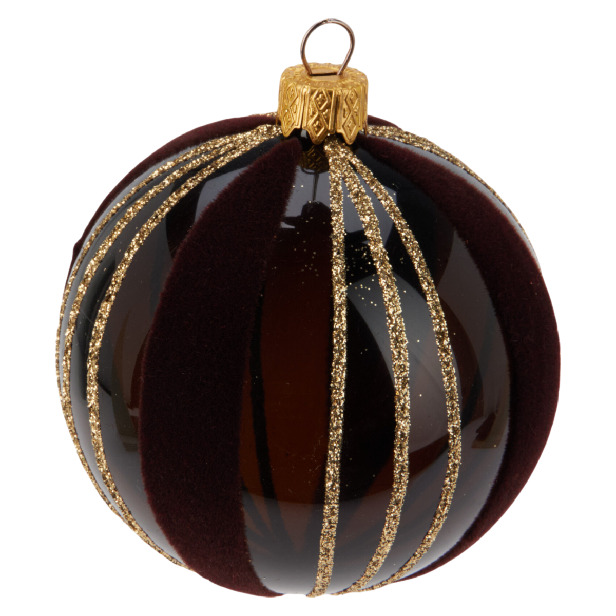 Az arany csillámvonalak és bársonyos díszítés elegánsan egészítik ki a matt felületet, míg a részletesen kidolgozott arany kupak igényes megjelenést kölcsönöz a dísznek.