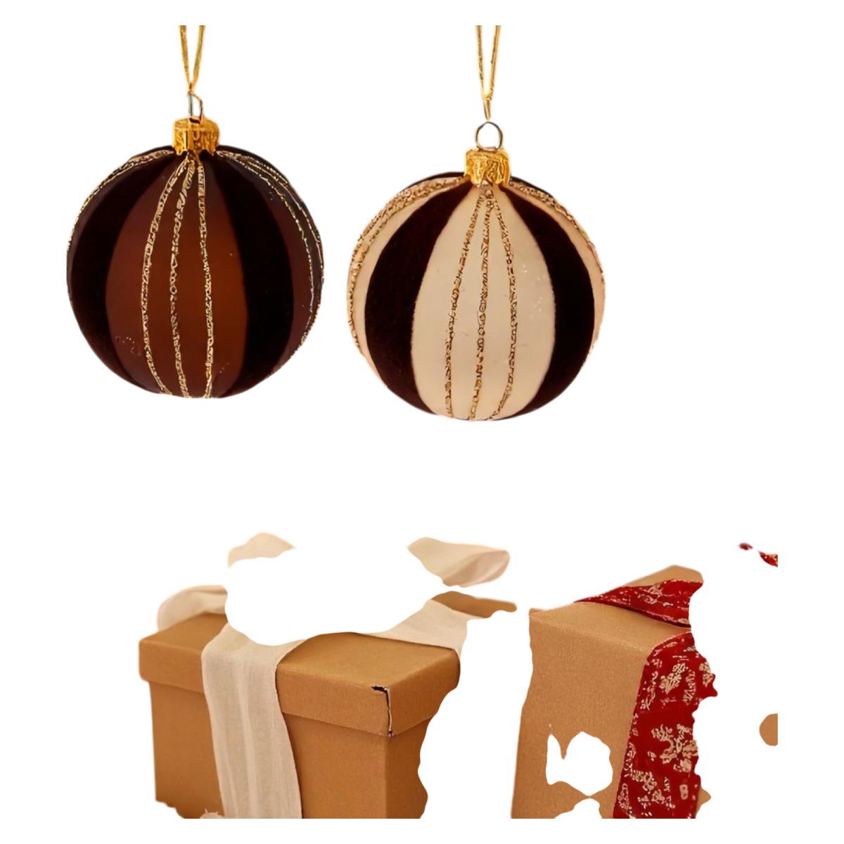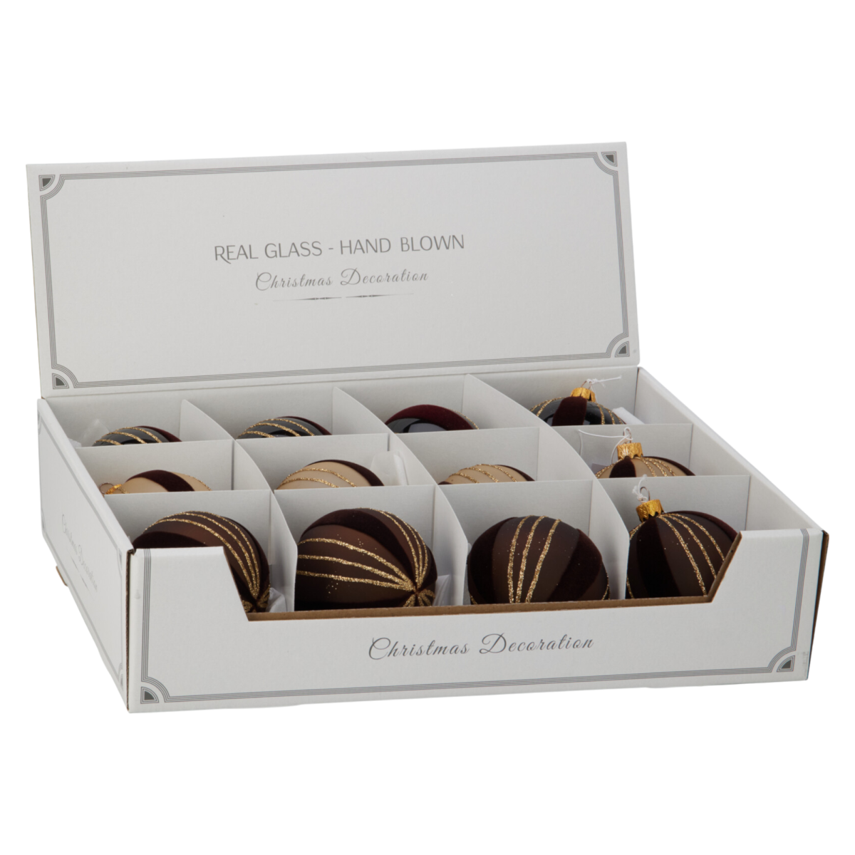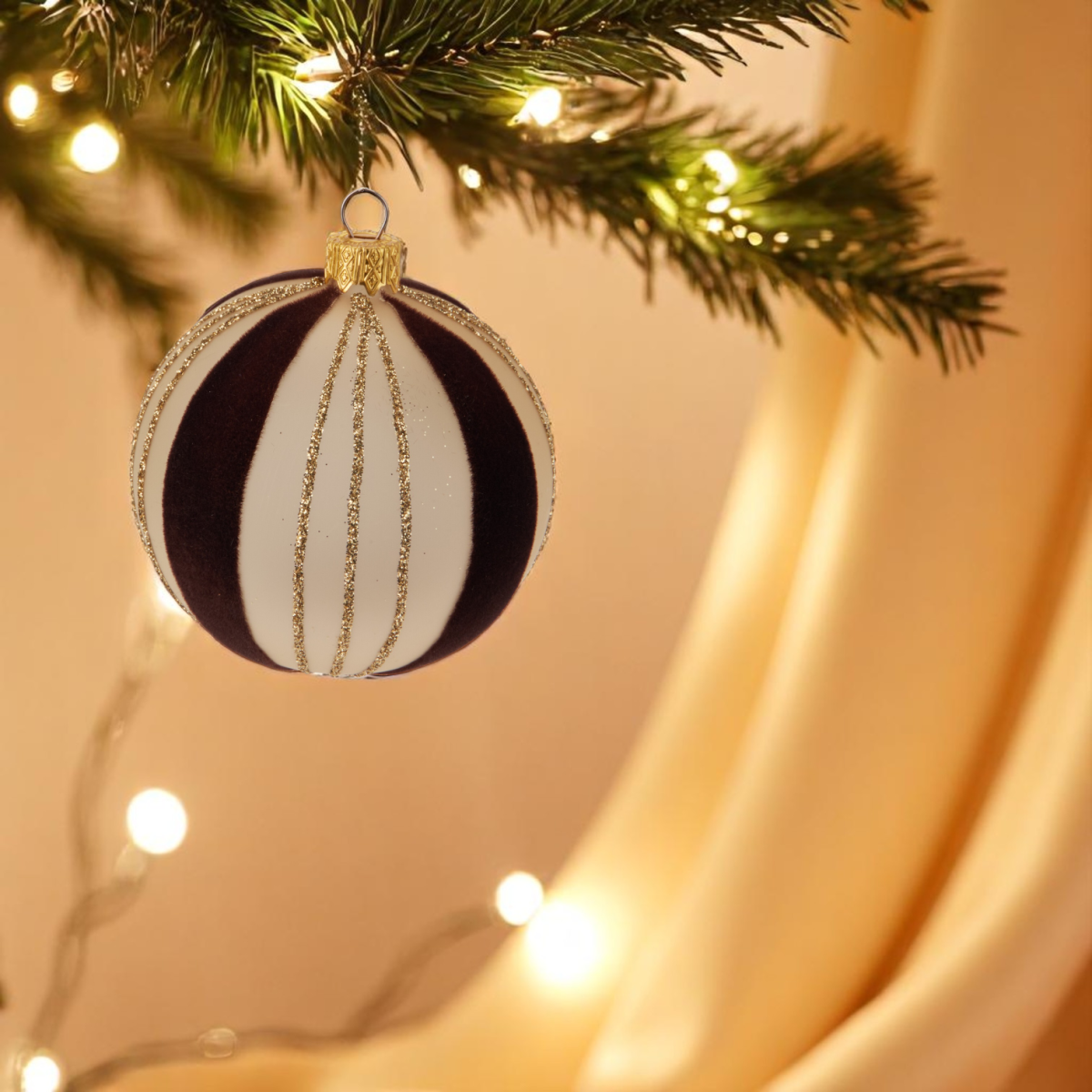 Az arany csillámvonalak és bársonyos díszítés elegánsan egészítik ki a matt felületet, míg a részletesen kidolgozott arany kupak igényes megjelenést kölcsönöz a dísznek.