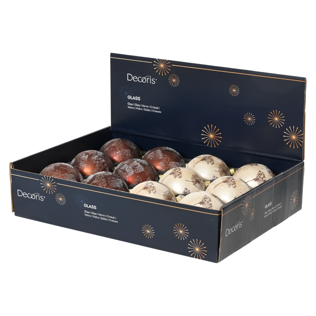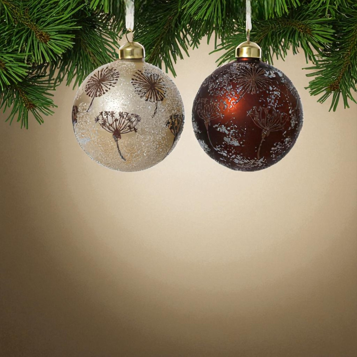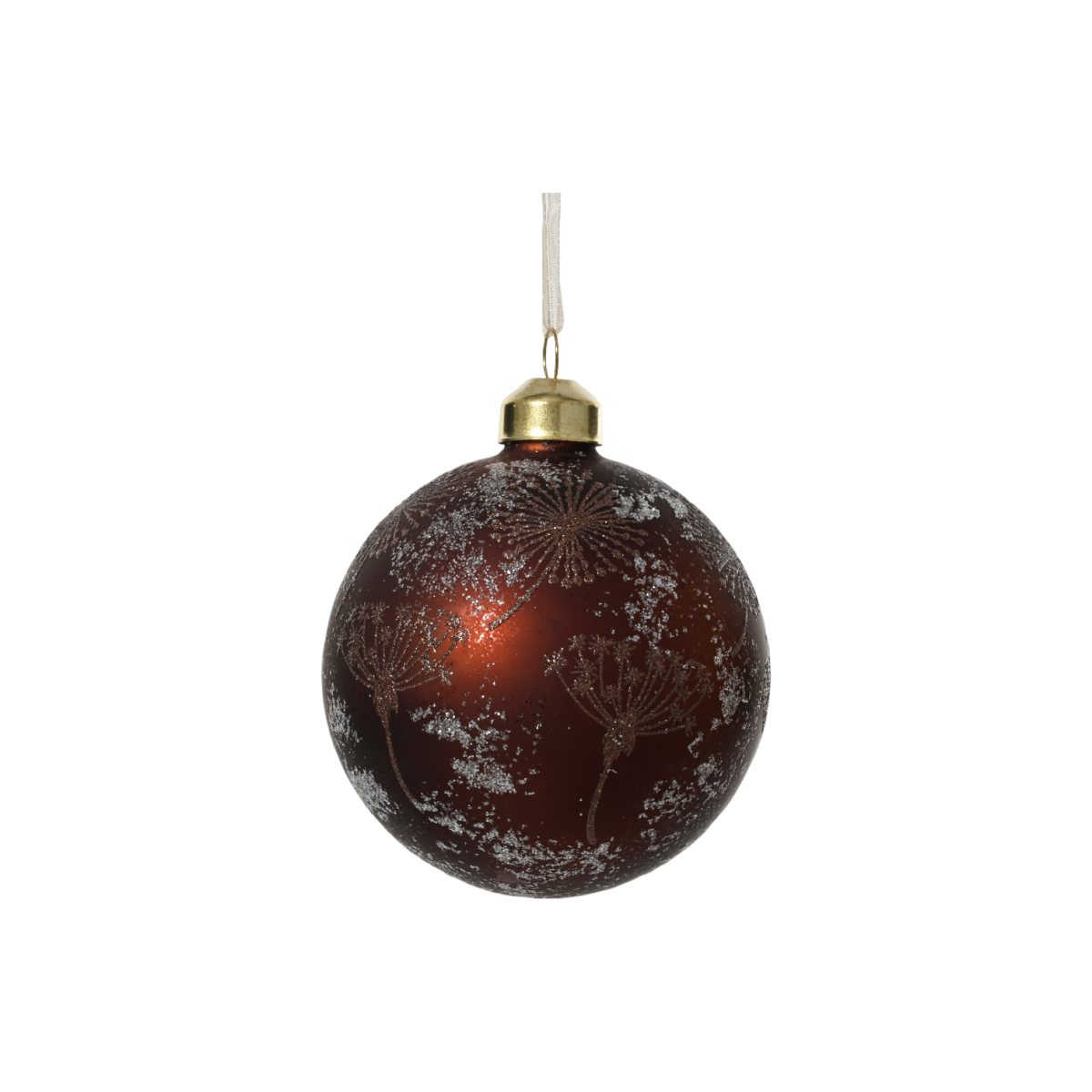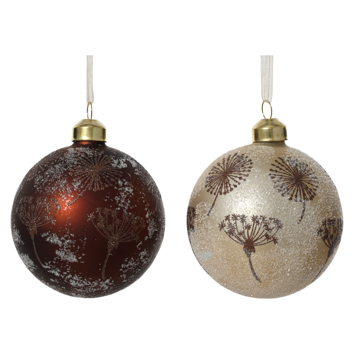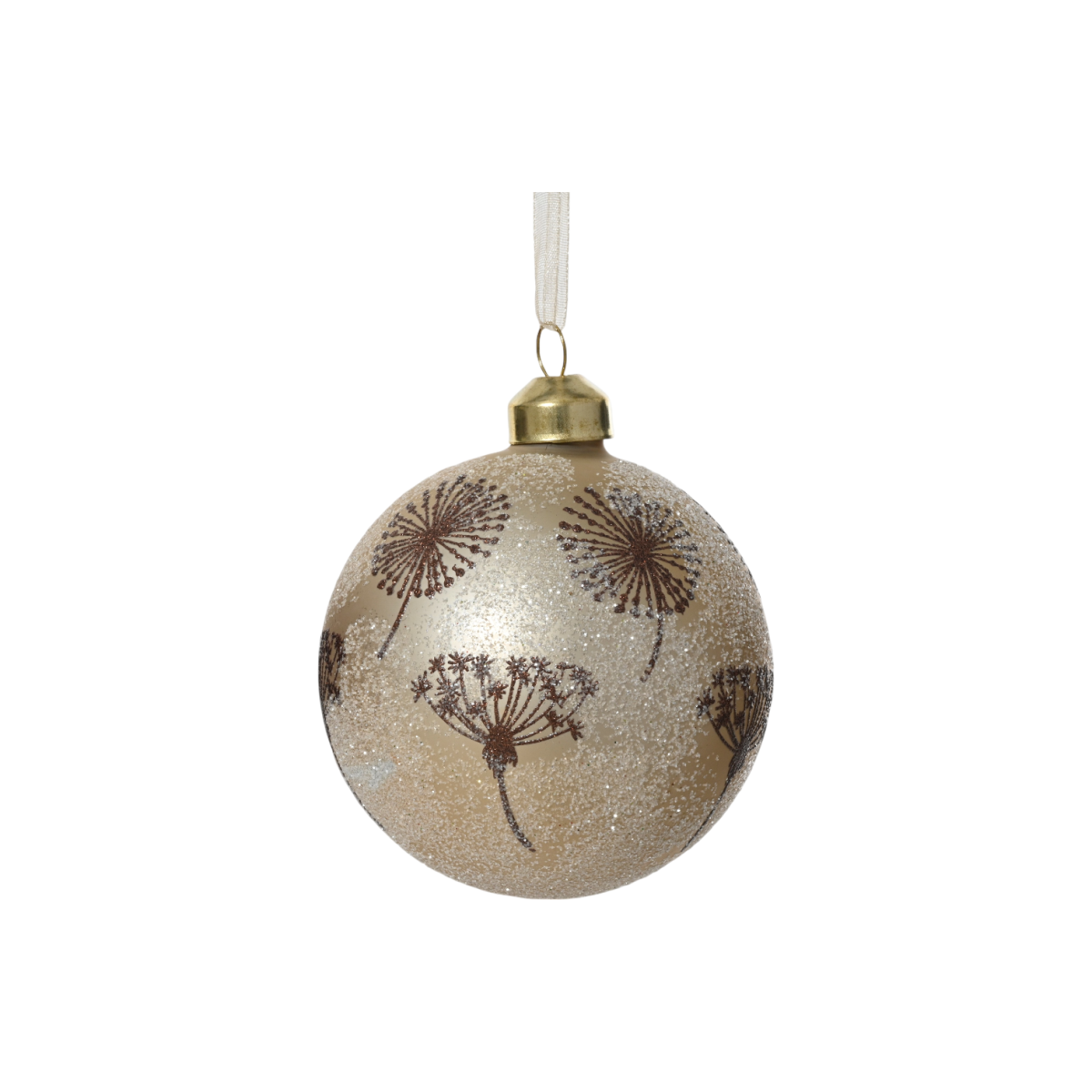 Dobd fel karácsonyfád megjelenését ezzel a különleges, glitteres üveggömbbel! A 8 cm átmérőjű dísz két színváltozatban érhető el: barna és pezsgő, mindkettőt látványos pitypangmintás csillámdíszítés teszi még ünnepibbé. Fényes felületével és részletgazdag kidolgozásával stílusos kiegészítője lehet az ünnepi dekorációnak.