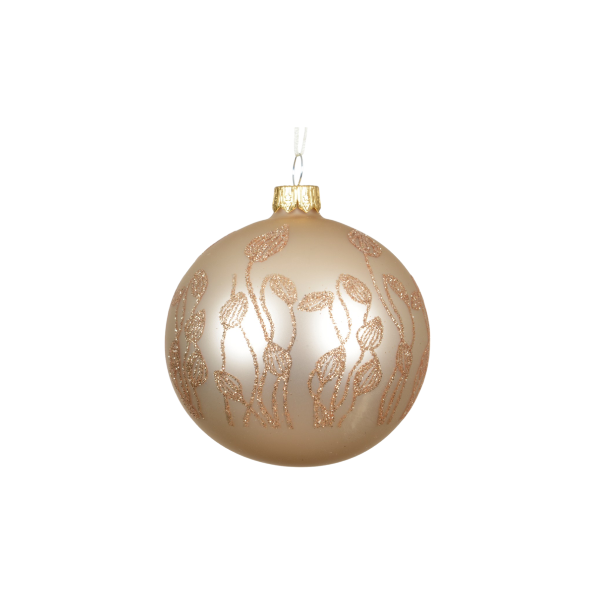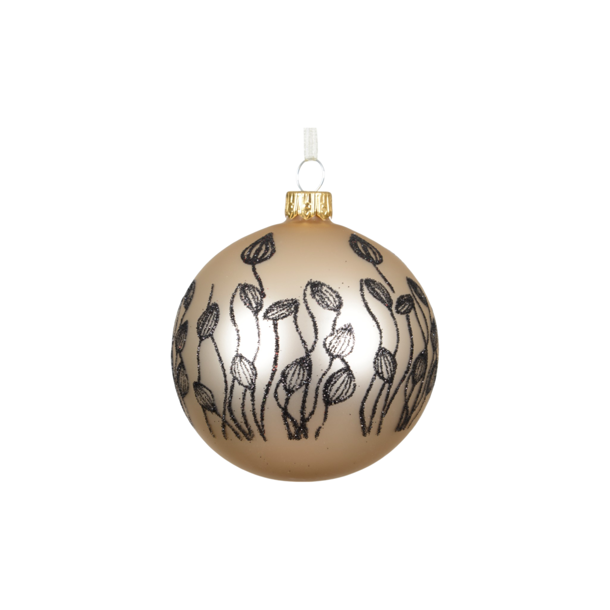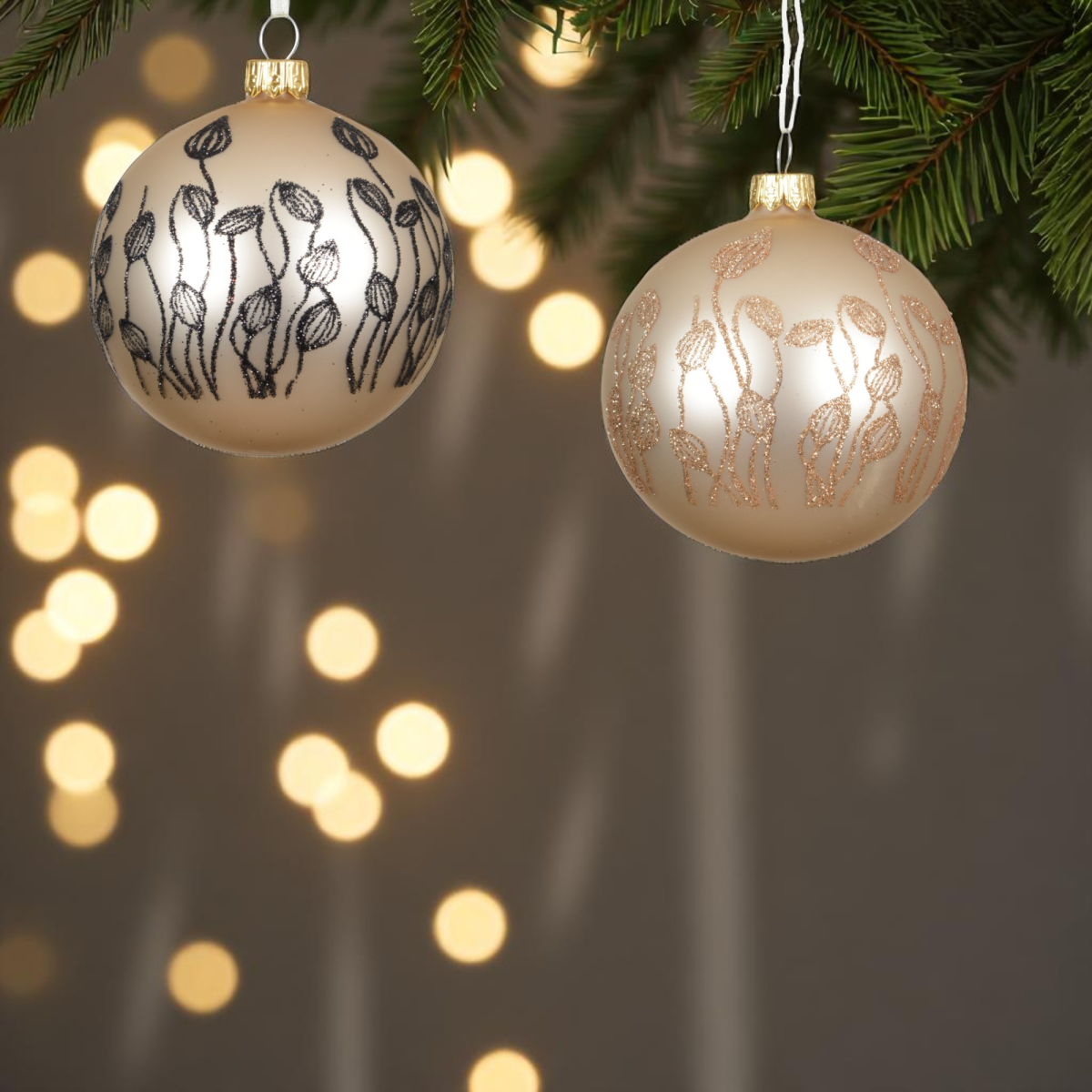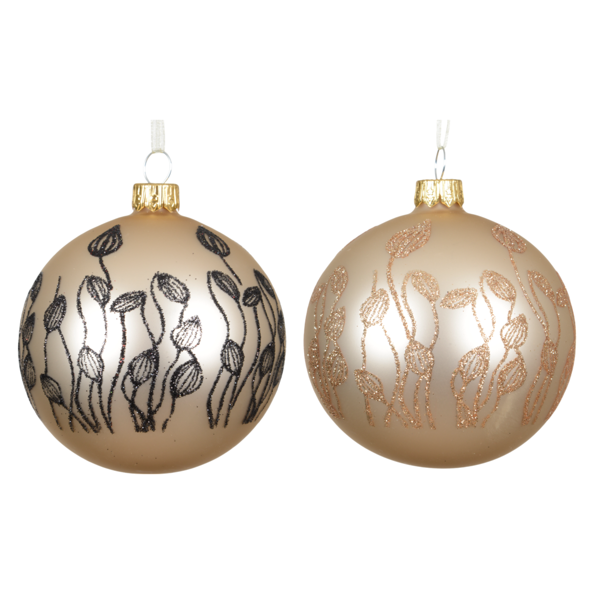 Ez a 8 cm átmérőjű, igazgyöngy színű üveggömb klasszikus és visszafogott dísze lehet karácsonyfádnak. Kétféle változatban érhető el: arany és fekete csillámos, stilizált növénymintával. A gömbök fényes-matt felülete és részletgazdag dekorációja különleges hangulatot kölcsönöz az ünnepi enteriőrnek.