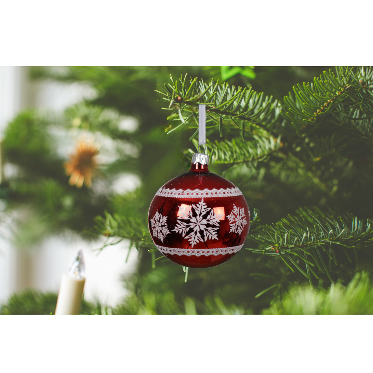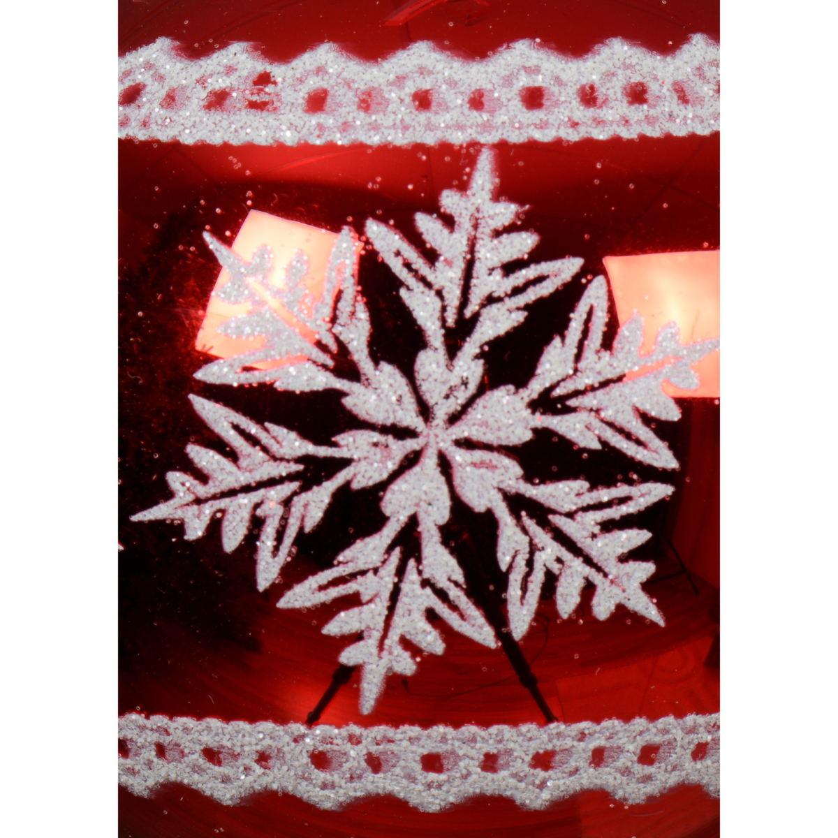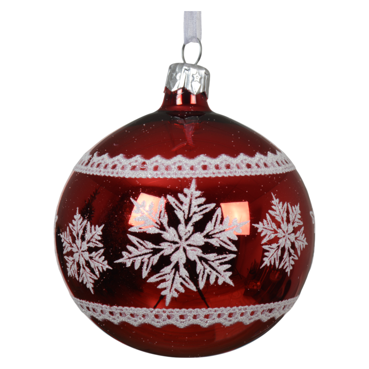 Dobd fel a karácsonyfád megjelenését ezzel a csillogó, piros üveggömbbel, amelyet elegáns fehér hópehelyminta díszít.