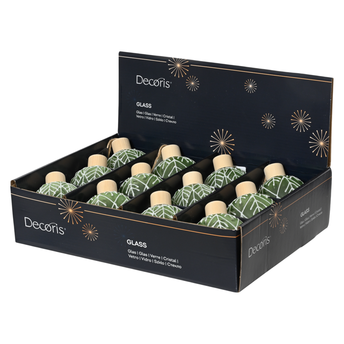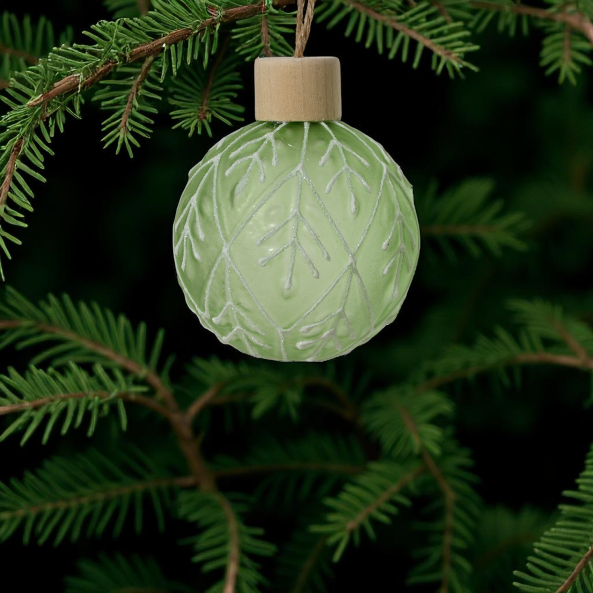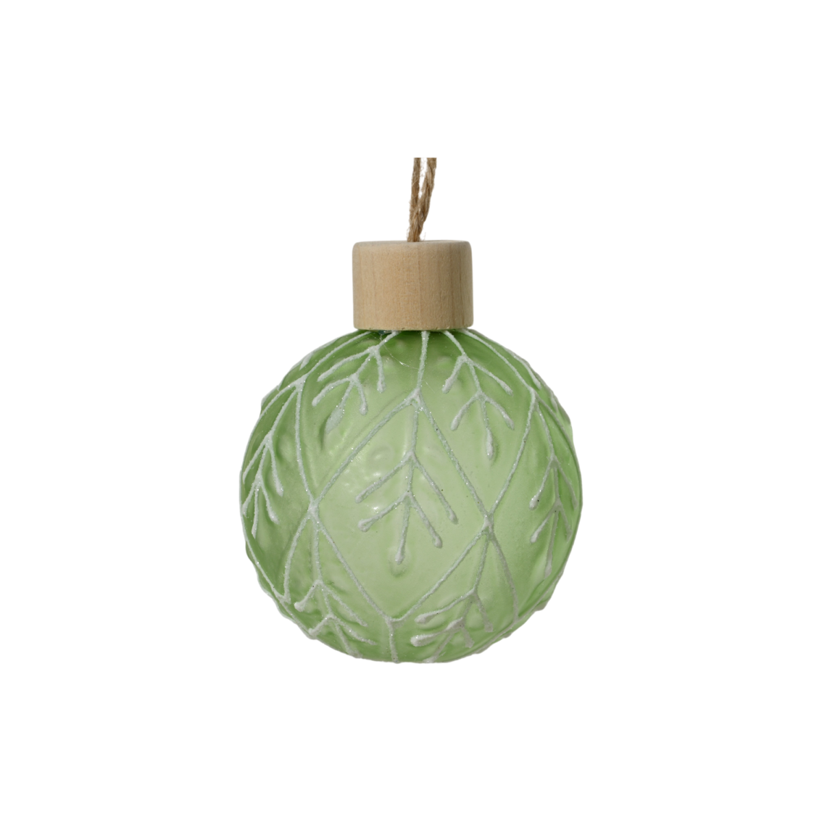 Dobd fel a karácsonyfád természetes árnyalatokkal! Ez a 8 cm-es, matt zöld üveggömb látványos, fehér csillámos levélmintával készült, két különböző változatban. A fa hatású akasztórész természetes megjelenést kölcsönöz a dísznek.