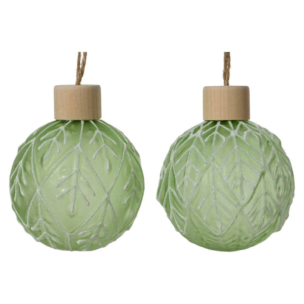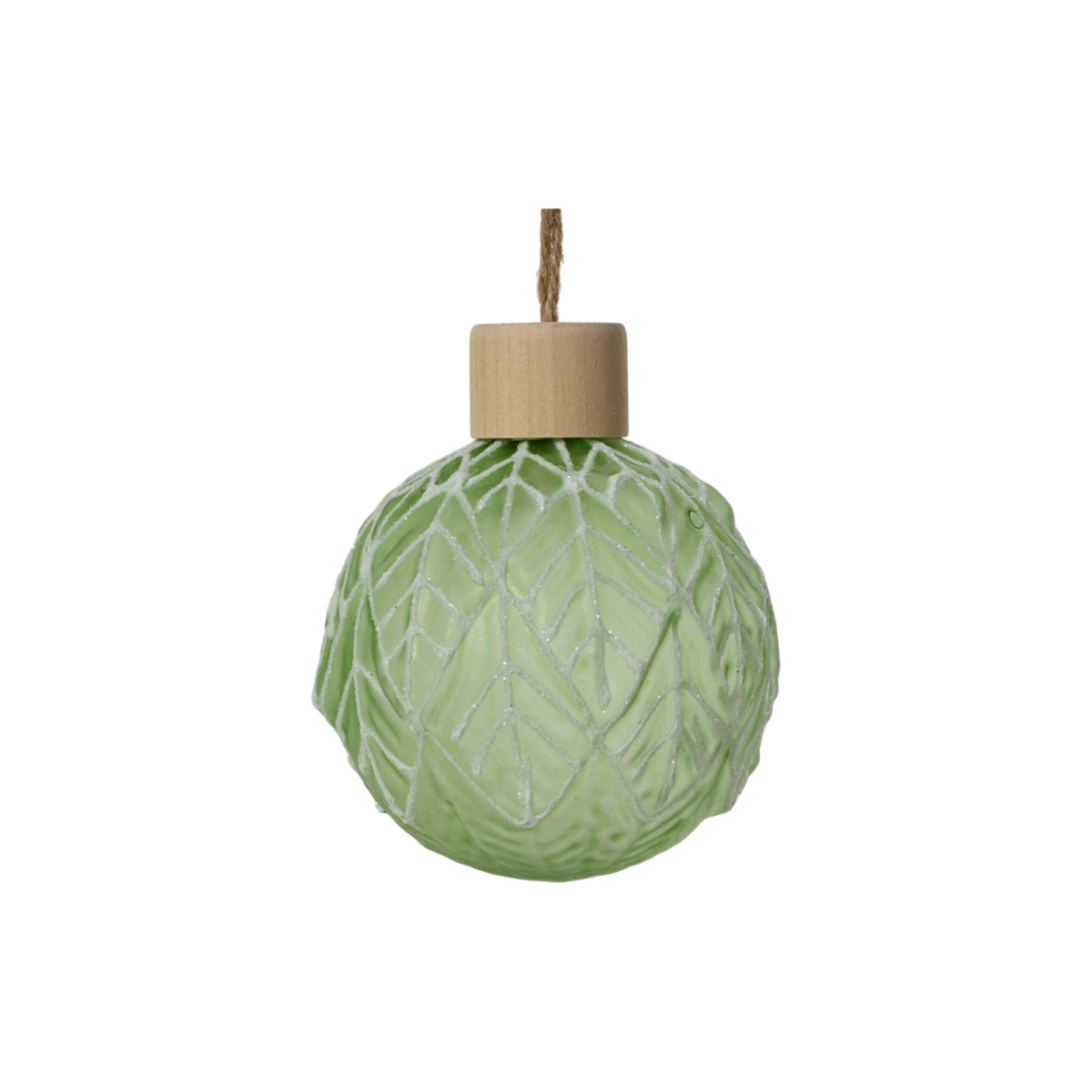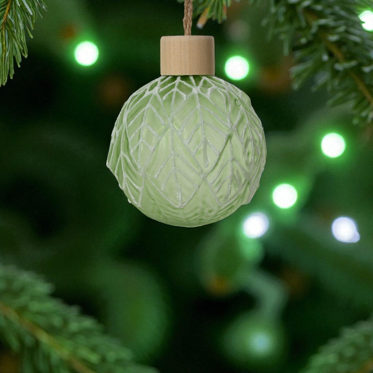Dobd fel a karácsonyfád természetes árnyalatokkal! Ez a 8 cm-es, matt zöld üveggömb látványos, fehér csillámos levélmintával készült, két különböző változatban. A fa hatású akasztórész természetes megjelenést kölcsönöz a dísznek.