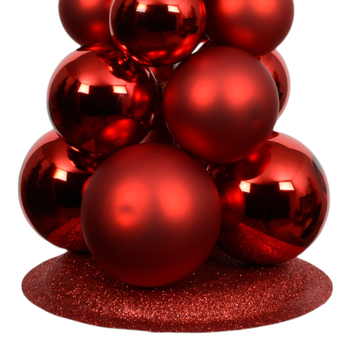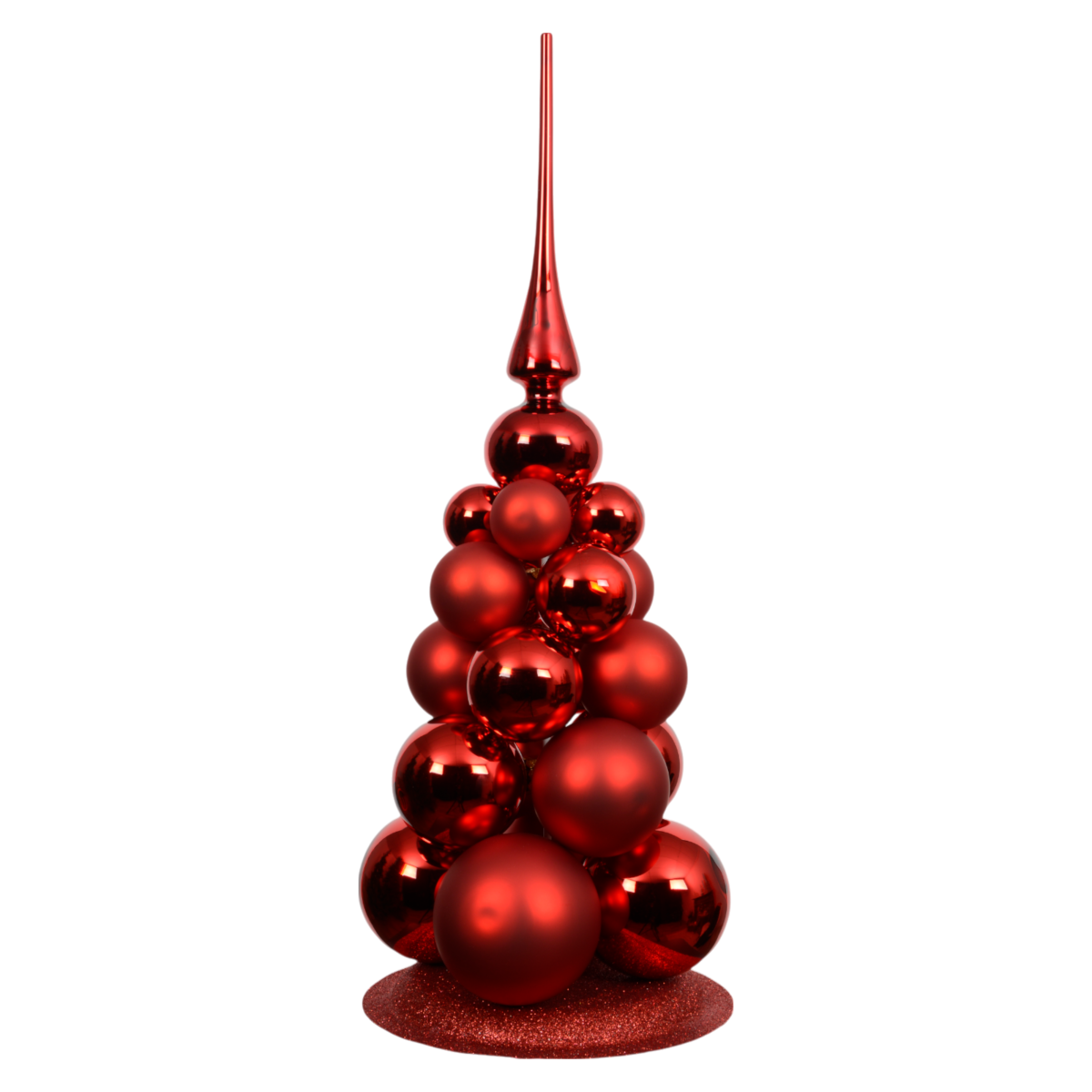 Ez a 60 cm magas üveggömb fenyőfa stílusos alternatívája a klasszikus karácsonyfának. A különböző méretű, matt és fényes piros gömbök egymásra épülő elrendezése látványos és modern megjelenést nyújt. Az elegáns csúcsdísz és a csillogó talp még ünnepibbé teszi az összhatást. Tökéletes választás lakásba, irodába vagy kirakati dekorációként is.