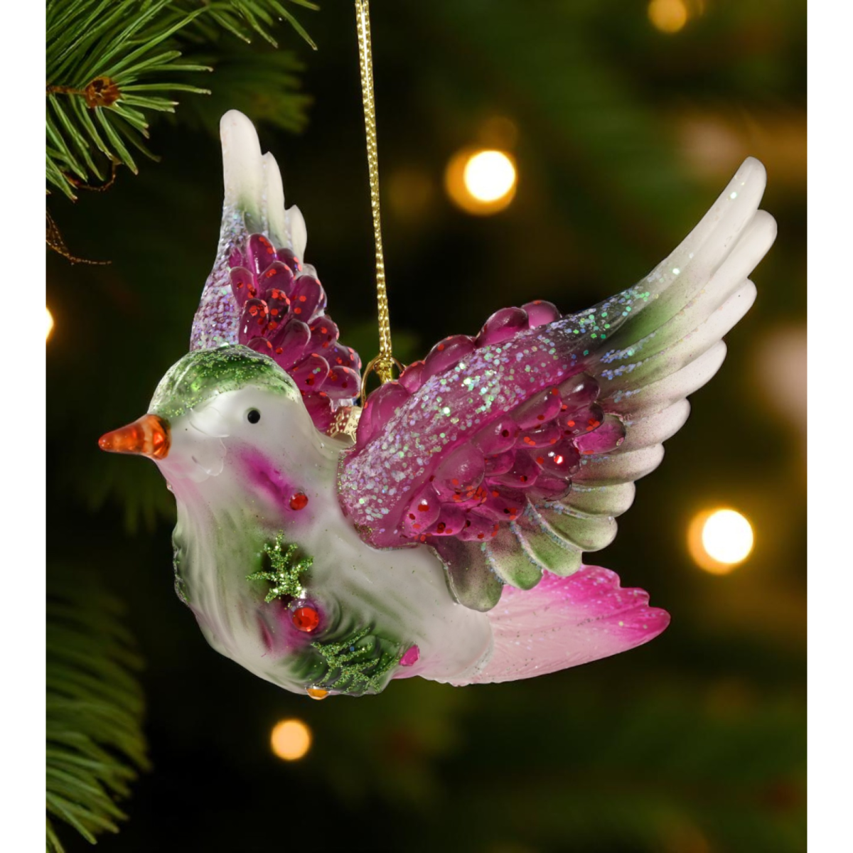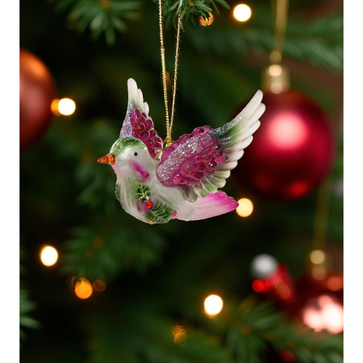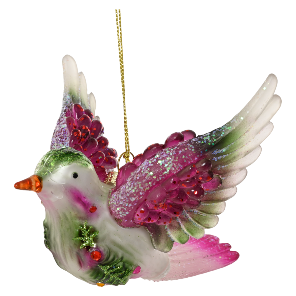 Ez a 11,5 cm-es, matt felületű madár alakú üvegdísz nemcsak formájával, de élénk színeivel és csillogó díszítéseivel is kiemelkedik a karácsonyfán. A részletgazdag kidolgozás, a zöld-pink árnyalatok és a finom csillámhatás különösen dekoratívvá teszik ezt a díszt.