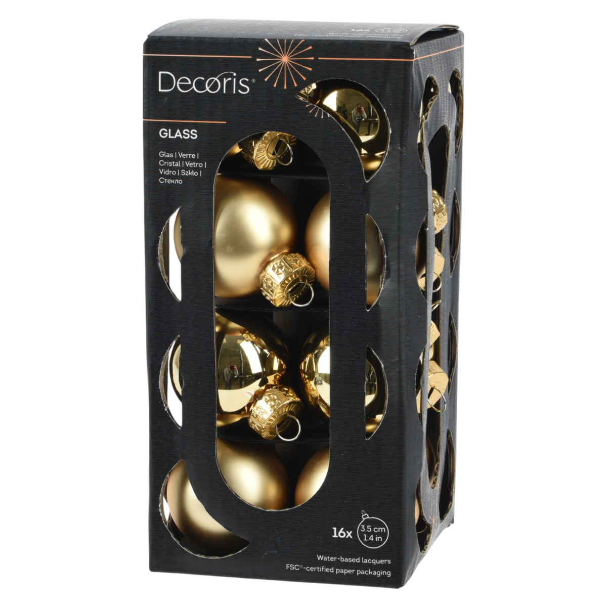 Ez a 16 darabos üveggömb szett kiváló választás a hagyományos arany karácsonyfadíszítéshez. A 3,5 cm-es méretű gömbök között fényes és matt felületű változatok is megtalálhatók, így egységes, de mégis változatos összhatást érhetsz el. Az arany szín jól kombinálható más klasszikus karácsonyi árnyalatokkal, mint a piros vagy a zöld, de önmagában is elegáns megjelenést biztosít.