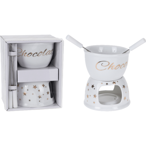 Csokoládé fondü szett anyaga: Porcelán, Mérete: 11X13,5CM. Tartalma: 2 rozsdamentes villa. 1 db Fondue, Porcelán, mérete: 110X110X135MM