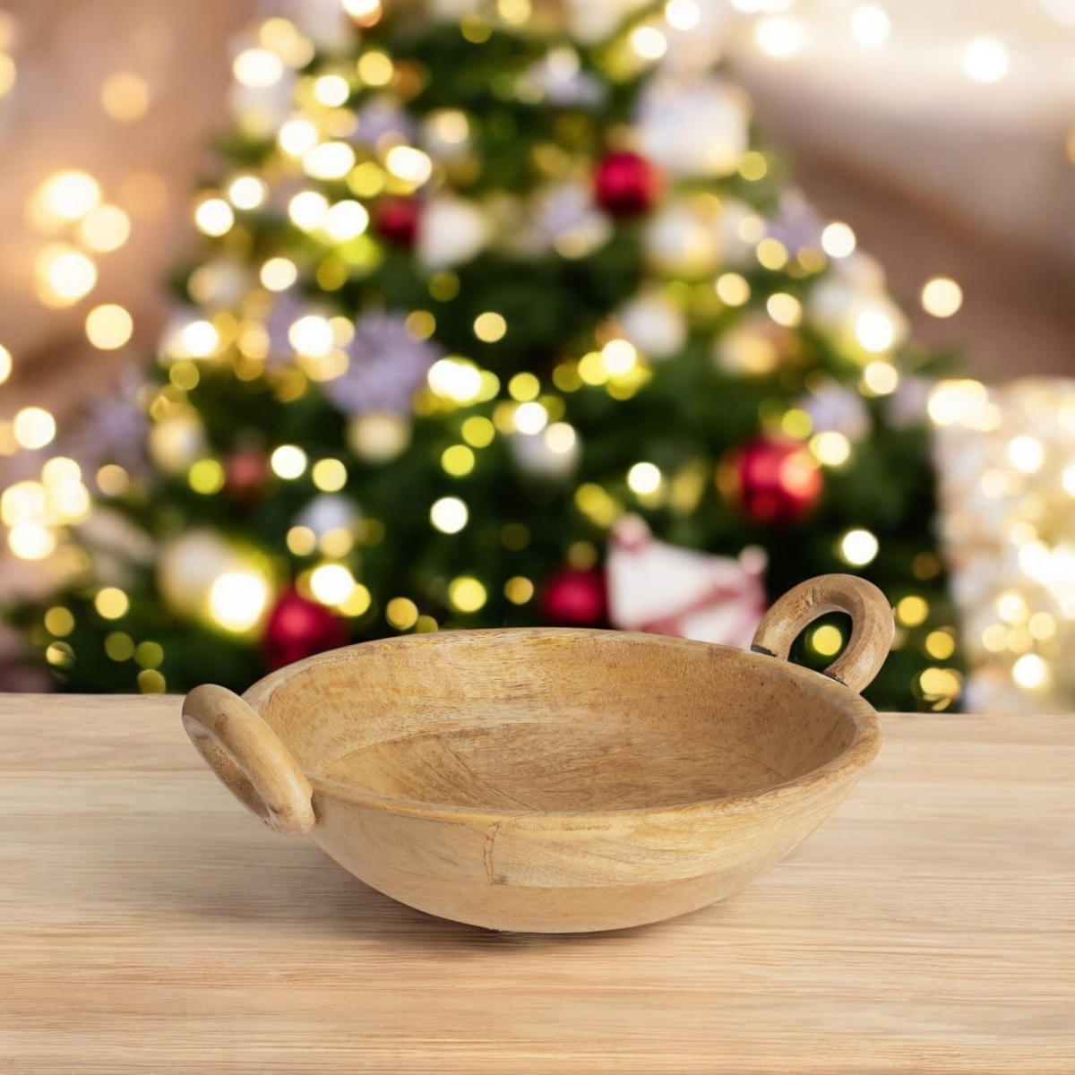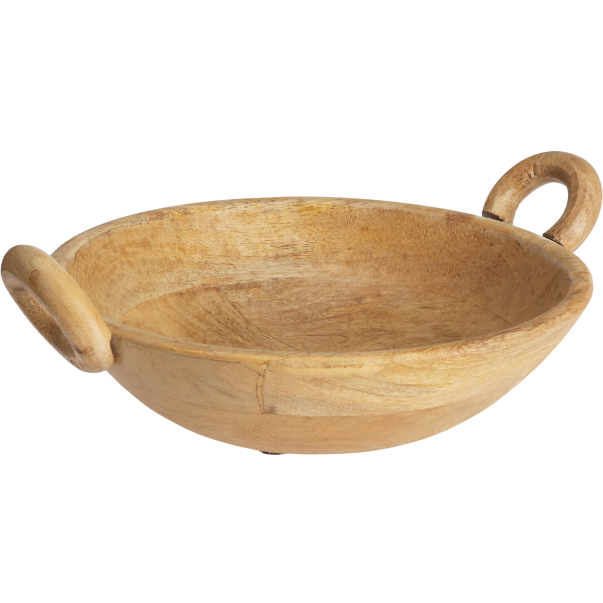 Természetes, natúr színű mangófából készült tál két oldalsó fogantyúval. Letisztult formája és meleg faerezetű felülete modern és rusztikus enteriőrben is jól mutat – dekorra és mindennapi rendezésre egyaránt.